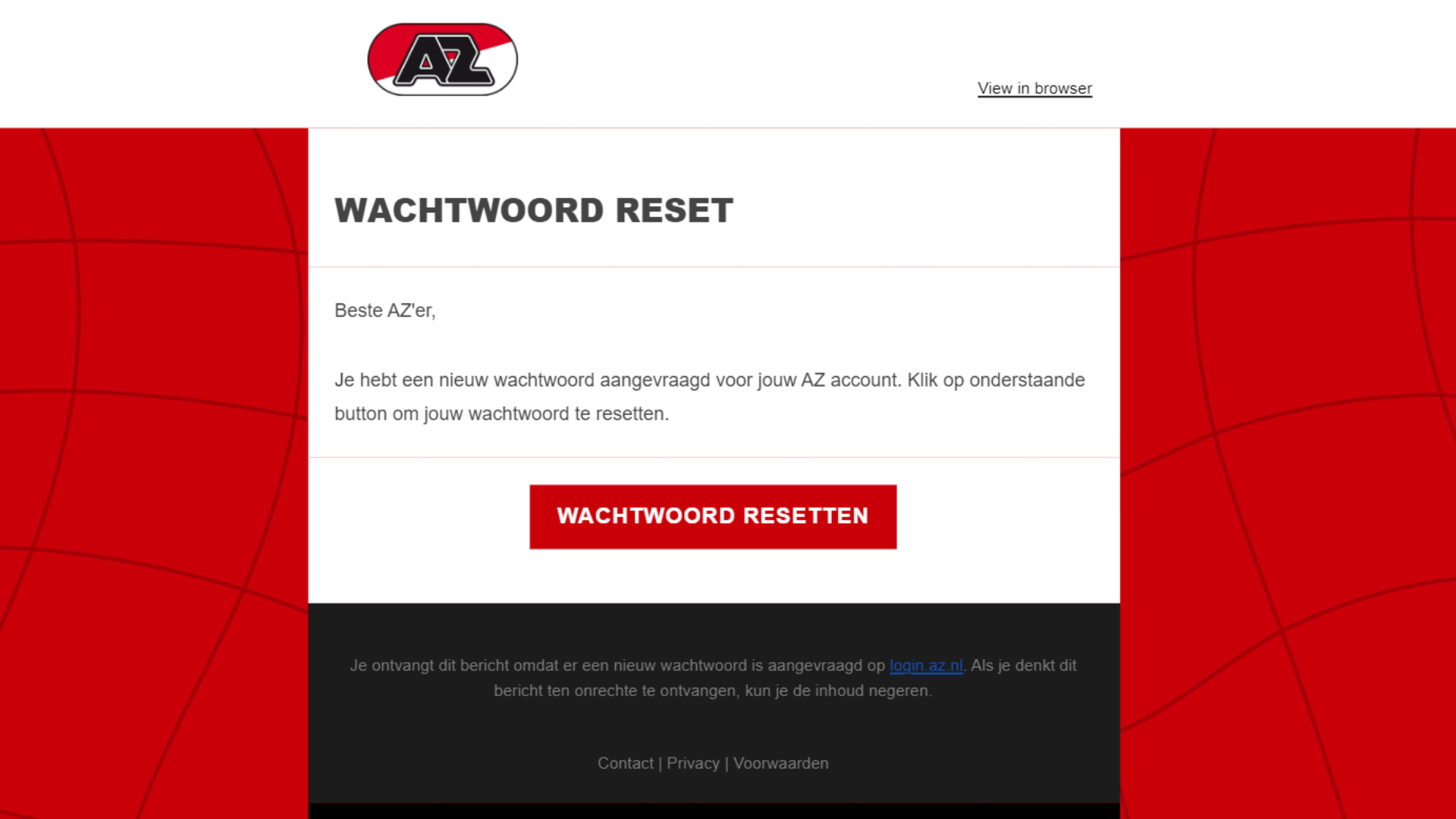 Ontvang je geen email nadat je jouw emailadres hebt ingevuld? Controleer dan eerst je spam of ongewenste email. Geen email gehad? Neem dan contact op met de afdeling kaartverkoop van AZ via ticketing@az.nl