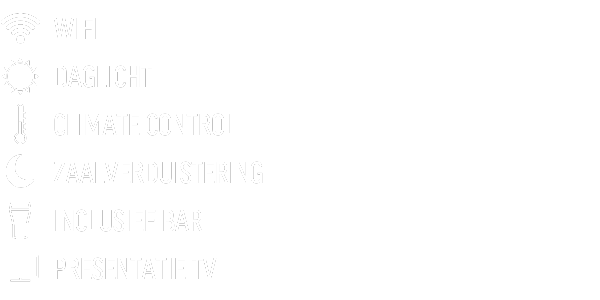 De zaal heeft een eigen, moderne en inspirerende uitstraling en is geschikt voor kleine gezelschappen, zoals bijvoorbeeld een brainstromsessie of een vergadering. Het heeft de perfecte sfeer en ideale omstandigheden om tot nieuwe inzichten te komen. Het maximaal aantal personen in de receptieopstelling is 40.