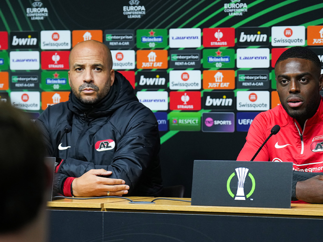 BIRMINGHAM- In het iconische Villa Park neemt AZ het donderdagavond op tegen Aston Villa FC voor de UEFA Europa Conference League. Woensdagavond schoof trainer Pascal Jansen met aanvoerder Bruno Martins Indi aan in de perszaal om vragen van de aanwezige pers te beantwoorden.
