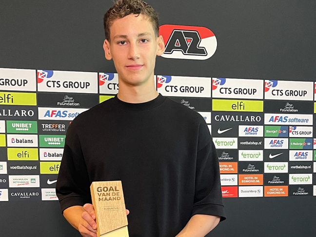ALKMAAR- Ruben van Bommel heeft de eerste Goal van de maand-award van het seizoen binnengesleept. De aanvaller ontving de meeste stemmen voor zijn doelpunt tegen FC Santa Coloma. Op het AFAS Trainingscomplex nam Van Bommel zijn prijs in ontvangst.