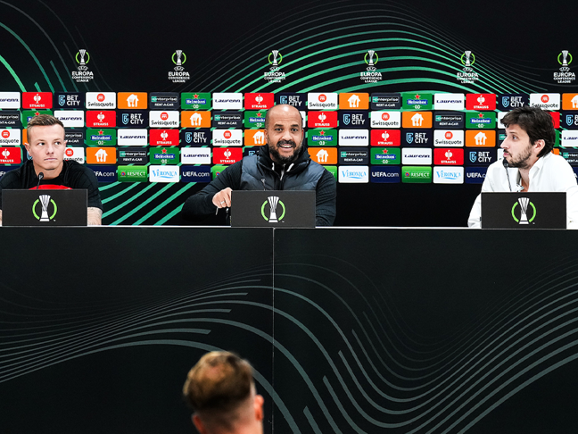 ALKMAAR- In het AFAS Stadion blikten Jordy Clasie en Pascal Jansen vooruit op de aankomende Europese thuiswedstrijd. Donderdag om 21:00 uur wordt er afgetrapt tegen Legia Warschau voor de groepsfase van de UEFA Europa Conference League. "Alles op alles zetten om te winnen."