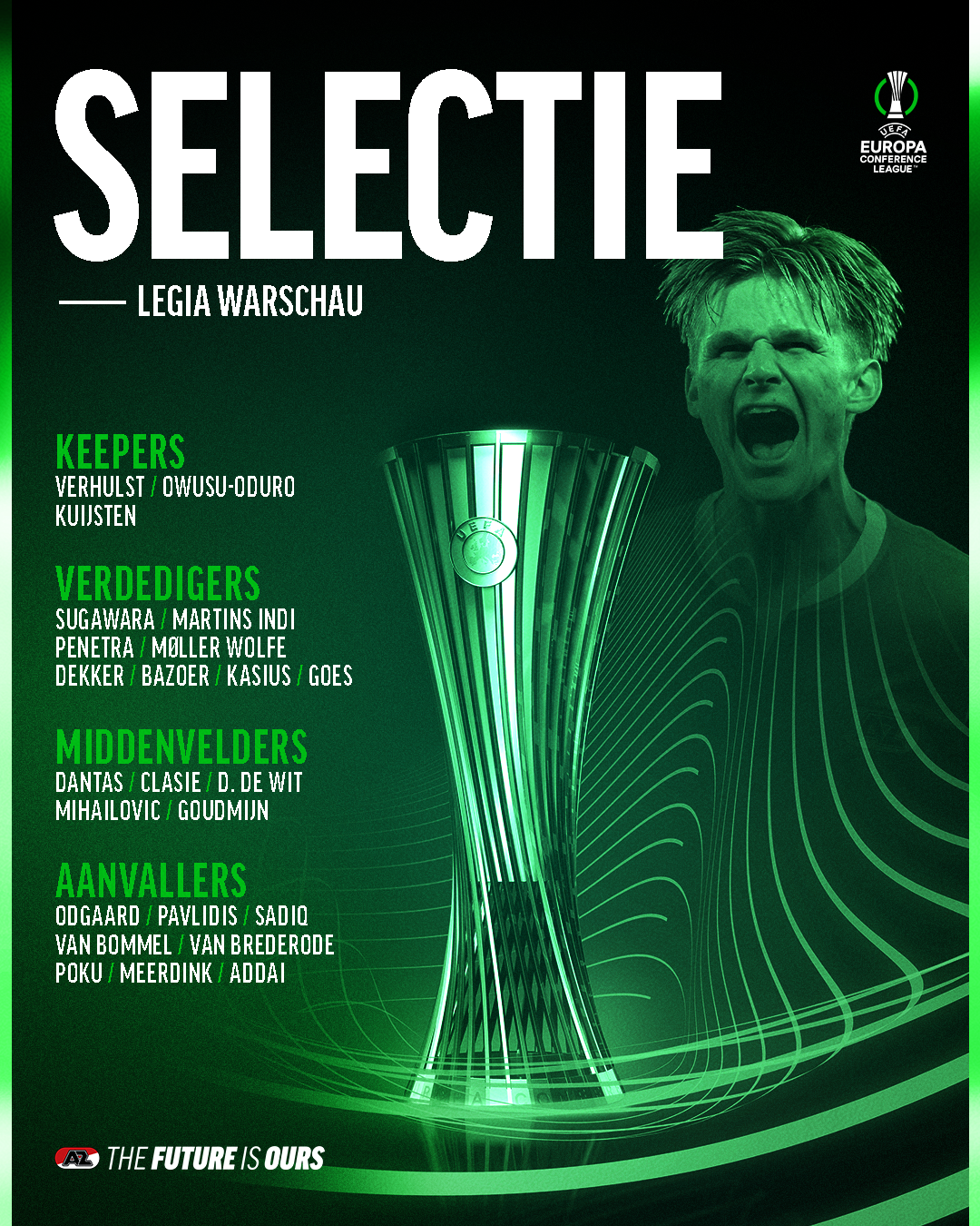 In de Poolse hoofdstad is AZ's missie helder. Bij winst wordt er overwinterd in de Conference League. Daarvoor reizen de volgende spelers af naar Polen: