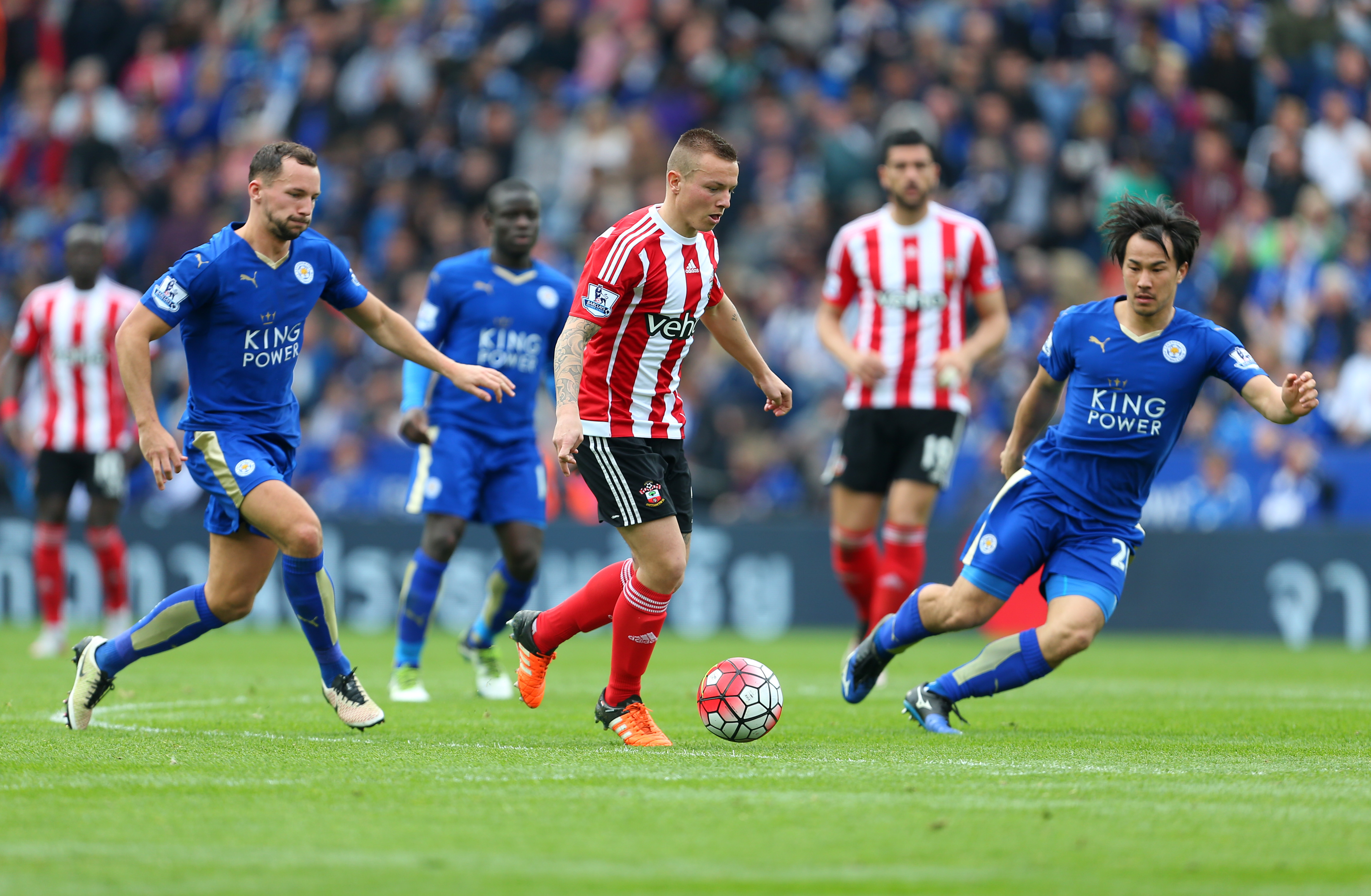Clasie wordt op de huid gezeten door Daniel Drinkwater (l) en Shinji Okazaki van Leicester City / Foto: Orange Pictures