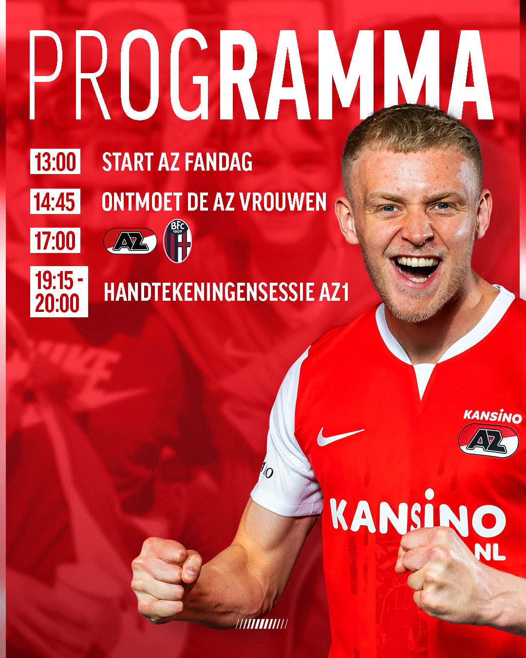 Hieronder vind je een overzicht van het programma tijdens de AZ Fandag. AZ kan helaas niet garanderen dat iedere fan een handtekening kan scoren van álle spelers en speelsters. Om alle fans een eerlijke kans te geven op een handtekening, willen we iedereen vragen maximaal één item te laten signeren. AZ deelt gratis handtekeningenkaarten uit, waarop jij gemakkelijk handtekeningen kan laten zetten. Binnenkort delen wij meer informatie over alle activiteiten die jij kan doen tijdens de AZ Fandag!