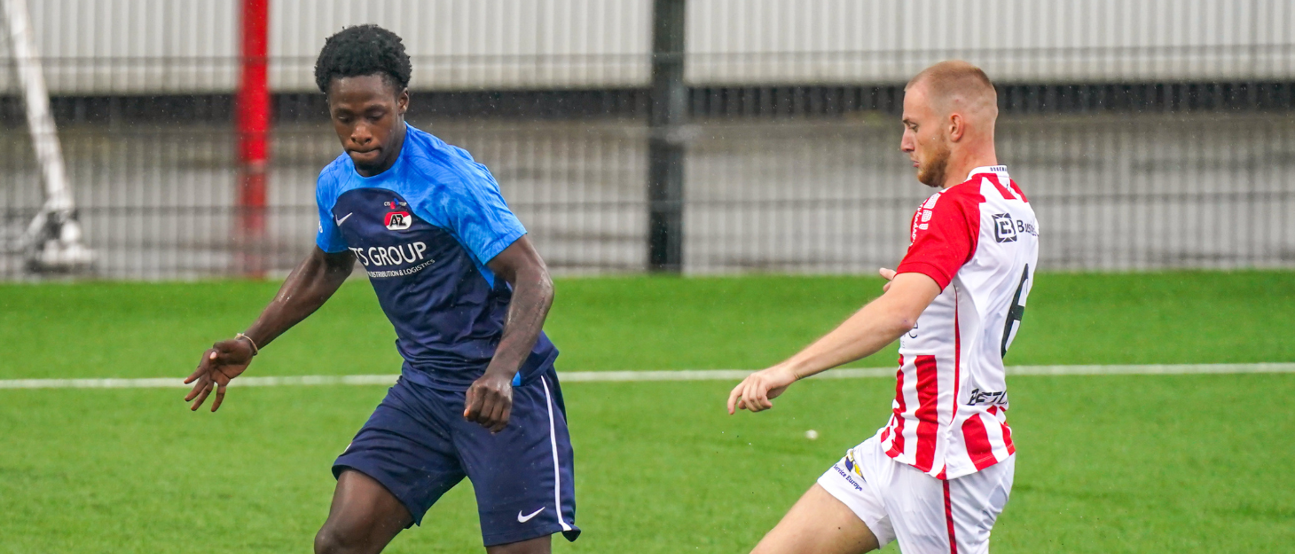 De Alkmaarders kenden een slechte start aan het oefenduel, want na zestien minuten stond de thuisploeg al met 3-0 voor. Kostas Doumtsios opende in de vijfde minuut de score, waarna Arthur Allemeersch met een dubbelslag de tweede en derde maakte. Dat deed hij in de veertiende minuut met een kopbal uit een voorzet, waarna hij in de zestiende minuut binnentikte uit een vrije trap.