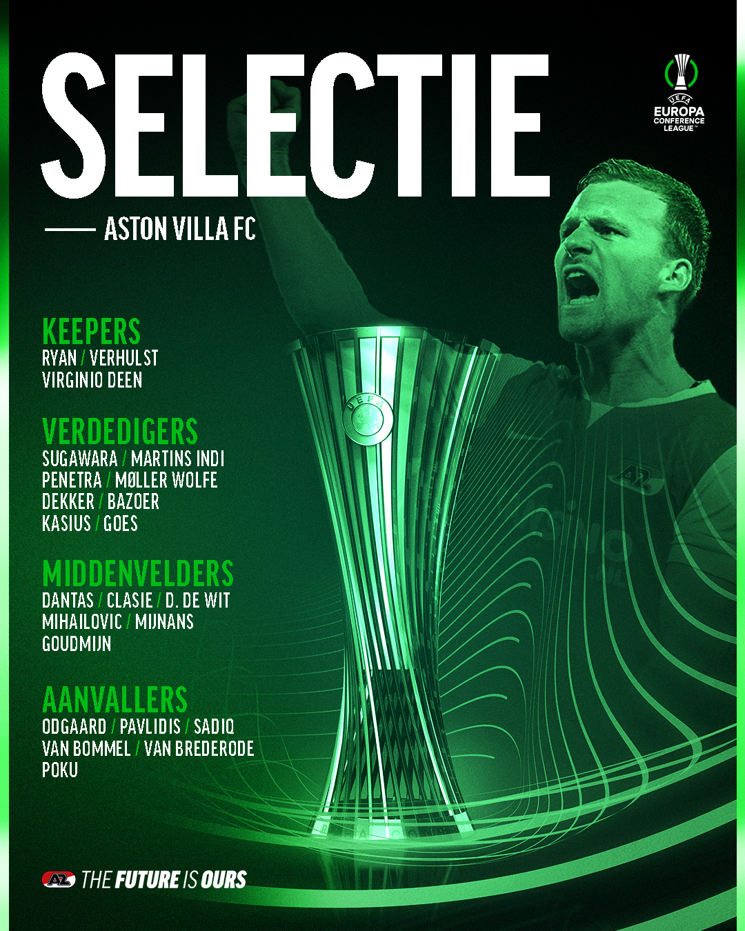 SCHIPHOL-OOST- AZ reist woensdagochtend met 23 spelers af naar Birmingham. Daar is donderdagavond Aston Villa FC de volgende tegenstander in de UEFA Europa Conference League-groepsfase.