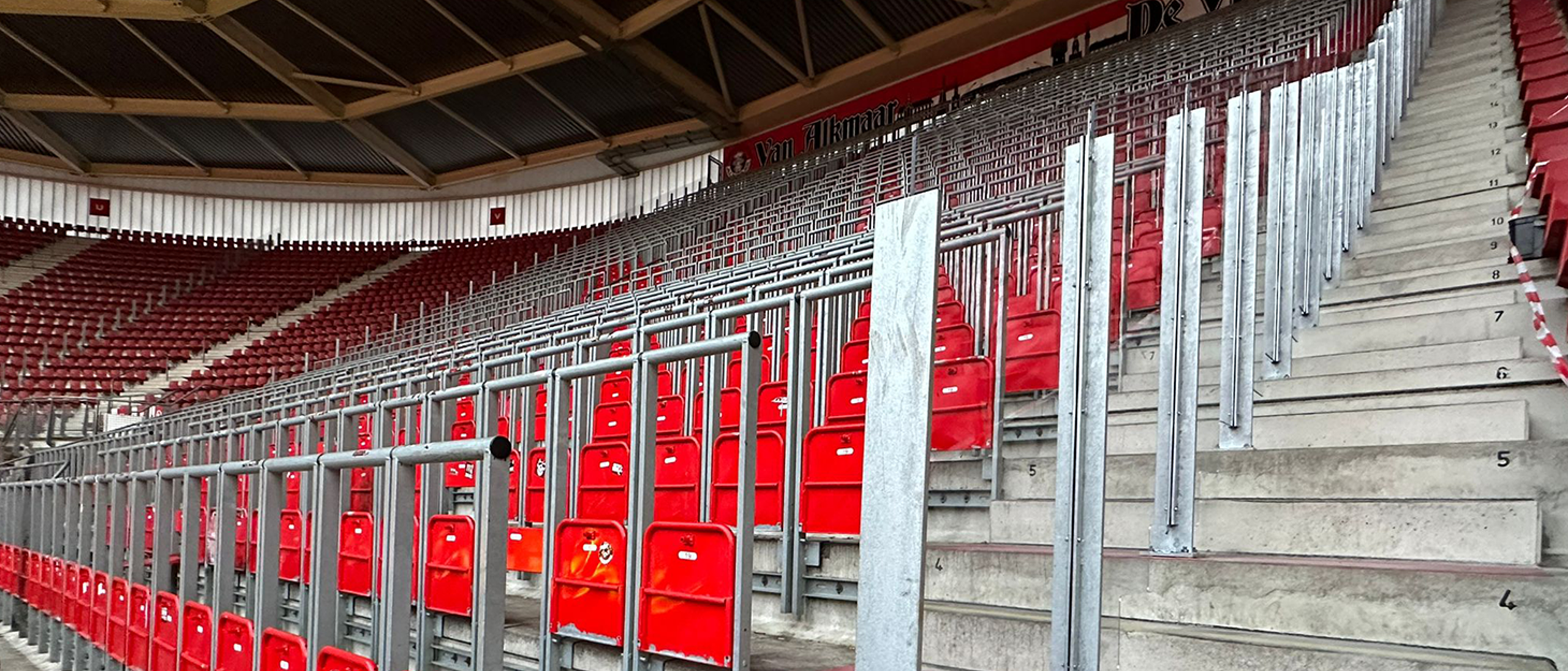 ALKMAAR- AZ is momenteel bezig een aanpassing aan beide zijden van het safe standing-gedeelte van de Van der Ben-tribune aan te brengen. Langs de trappen aan beide kanten van de sfeervakken worden transparante afscheidingen aangebracht. Met die noodzakelijke aanpassing voldoet de safe-standing tribune aan de vereiste voorwaarden.