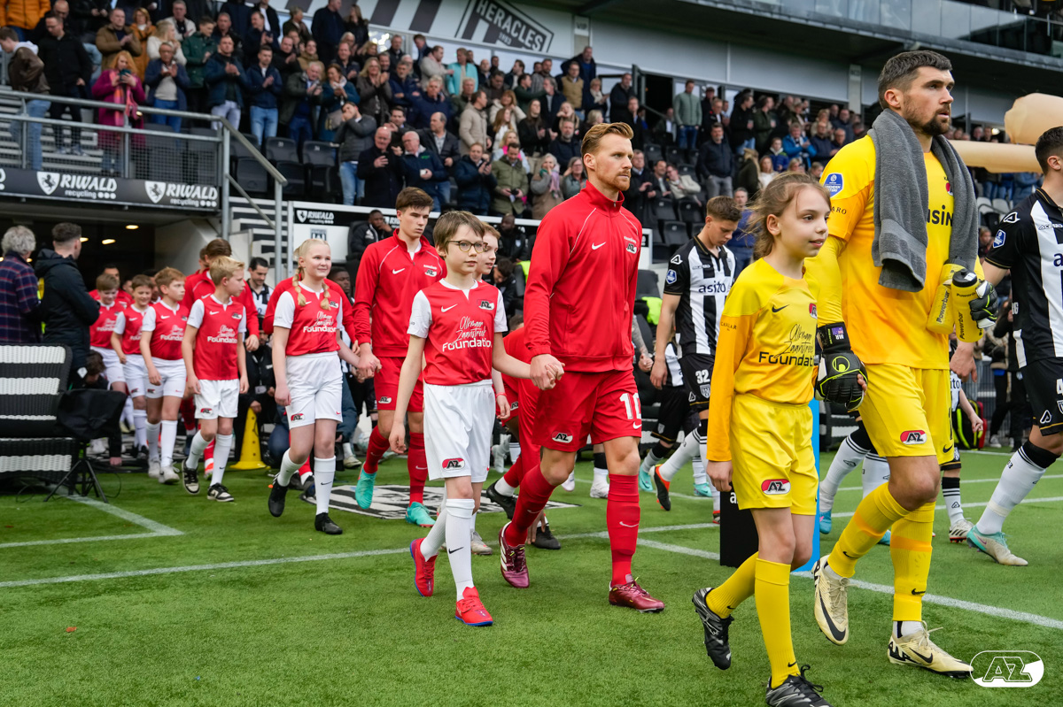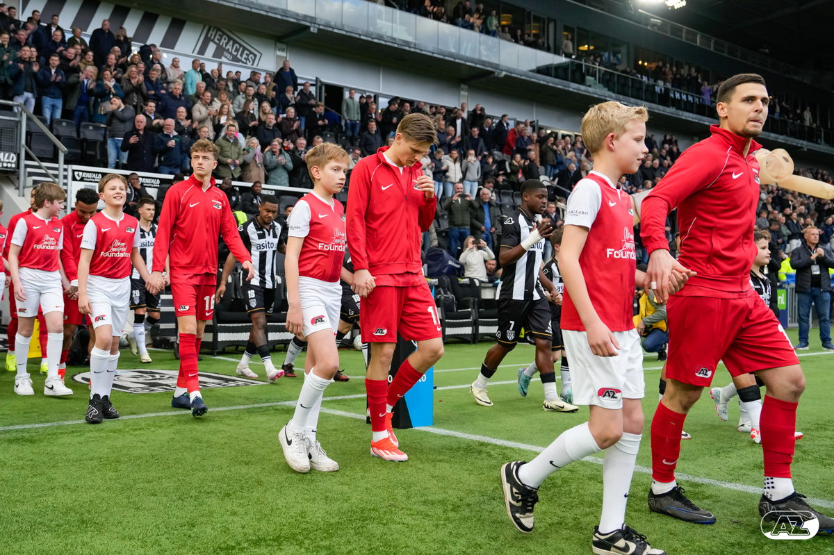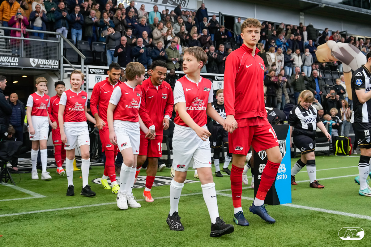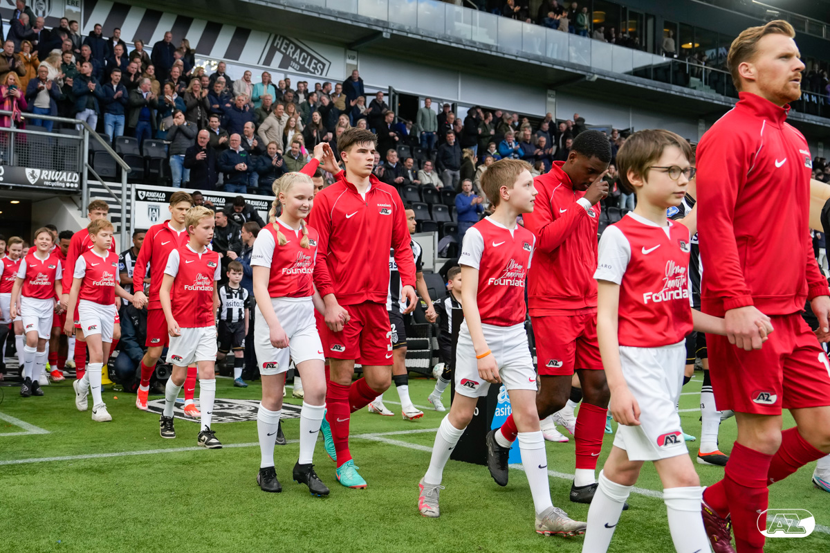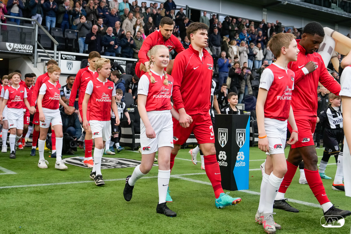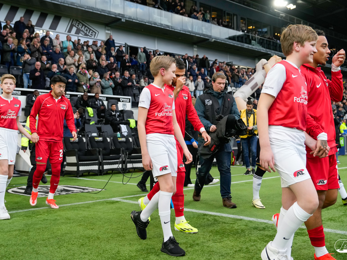 ALMELO- Voorafgaand aan de wedstrijd van de Heracles tegen AZ mochten leden van De Waaghalzen & De AllstarZ mee het veld op als spelersescorte. De Waaghalzen & De AllstarZ bij de wedstrijd tussen Heracles en AZ in beeld.