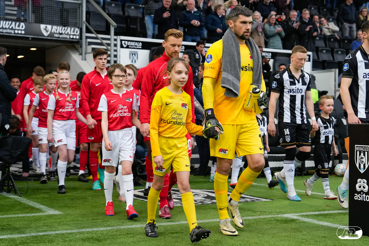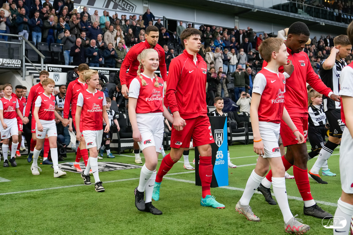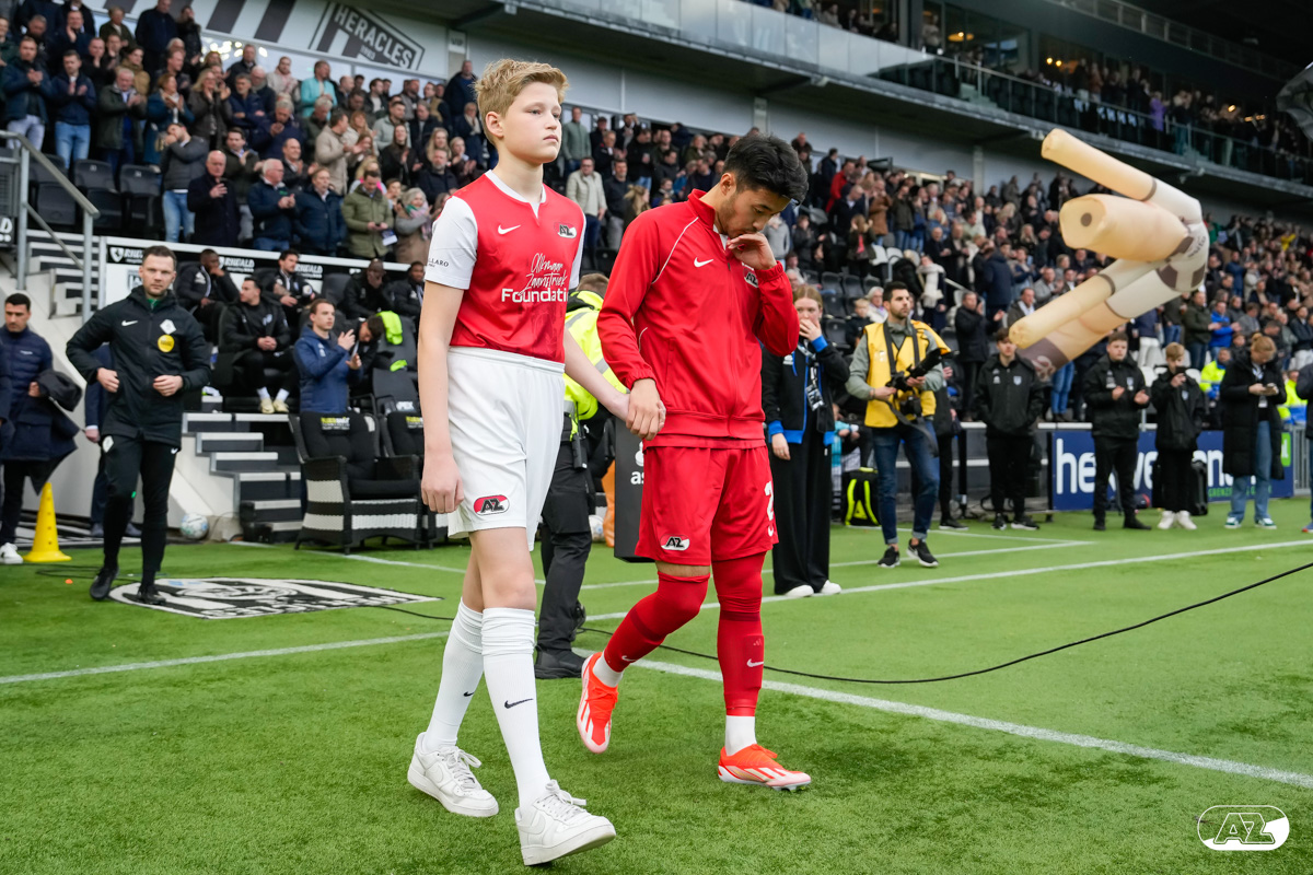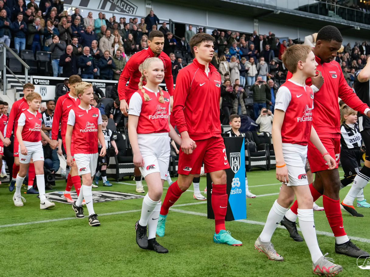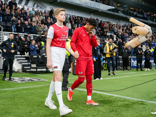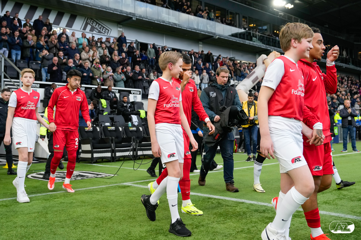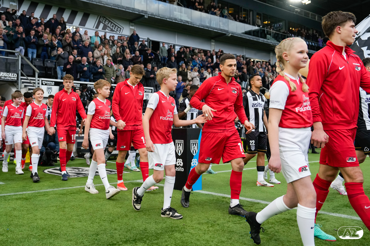 ALMELO- Voorafgaand aan de wedstrijd van de Heracles tegen AZ mochten leden van De Waaghalzen & De AllstarZ mee het veld op als spelersescorte. De Waaghalzen & De AllstarZ bij de wedstrijd tussen Heracles en AZ in beeld.