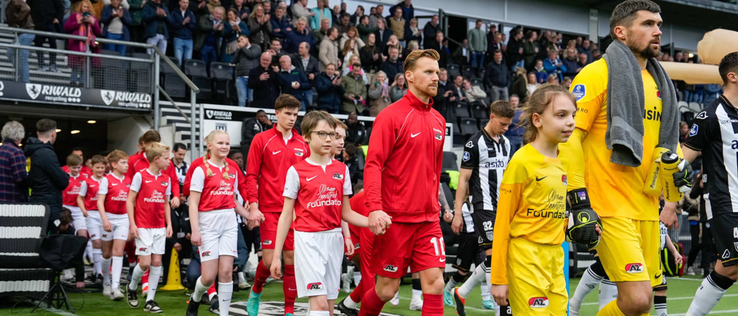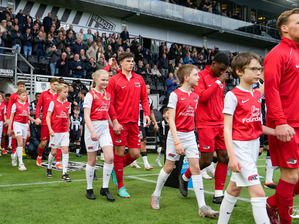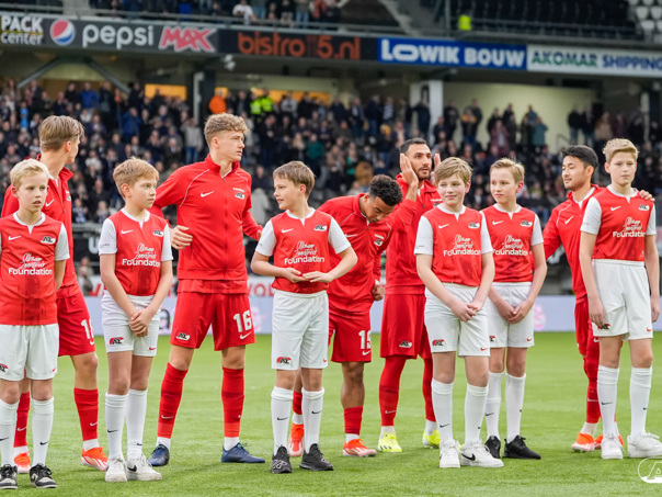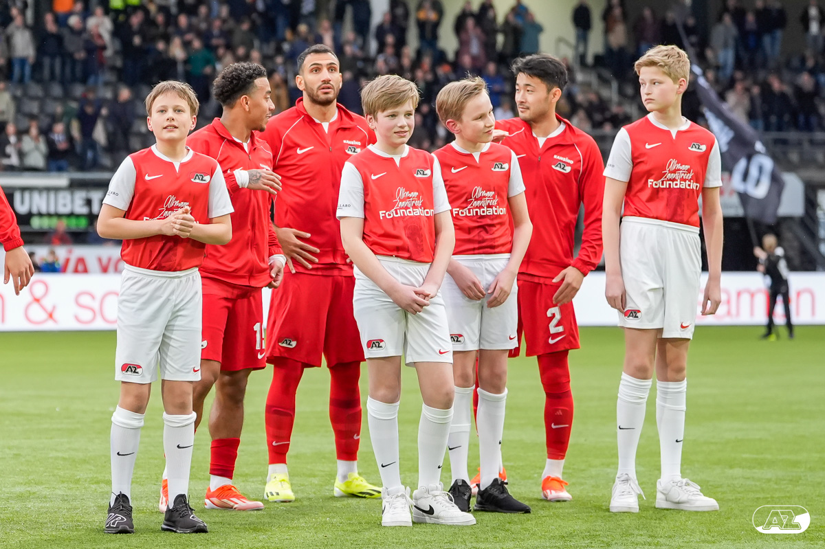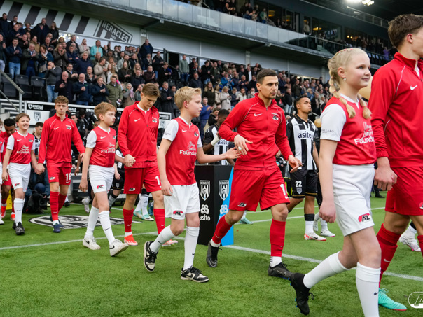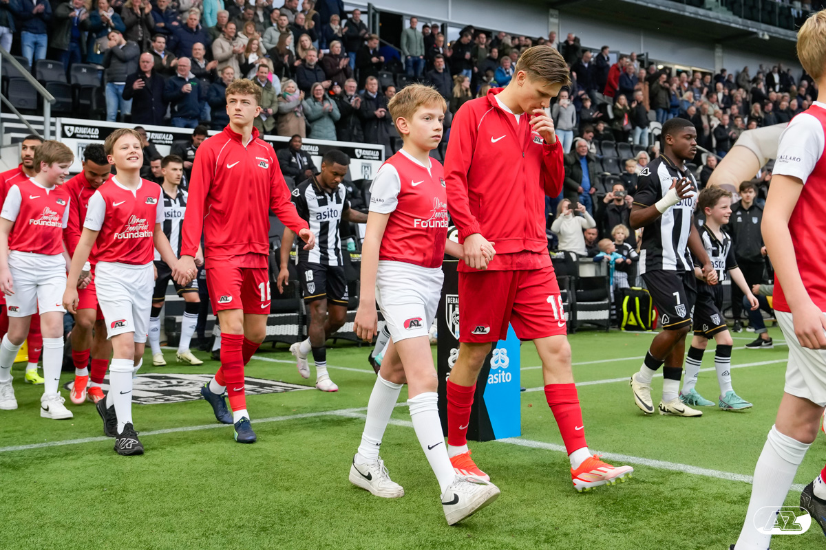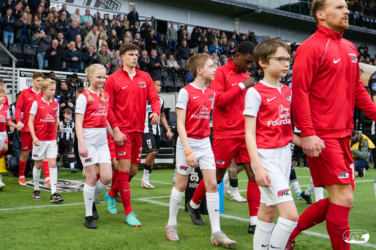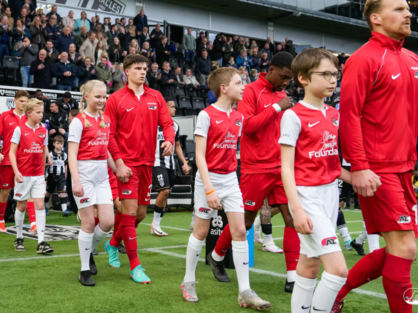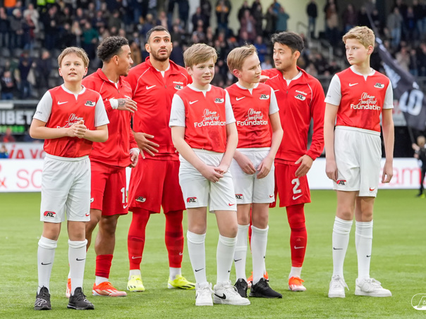 ALMELO- Voorafgaand aan de wedstrijd van de Heracles tegen AZ mochten leden van De Waaghalzen & De AllstarZ mee het veld op als spelersescorte. De Waaghalzen & De AllstarZ bij de wedstrijd tussen Heracles en AZ in beeld.