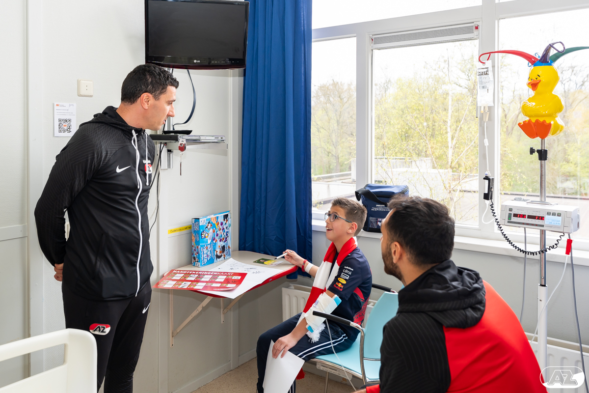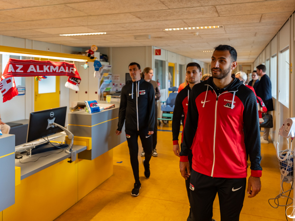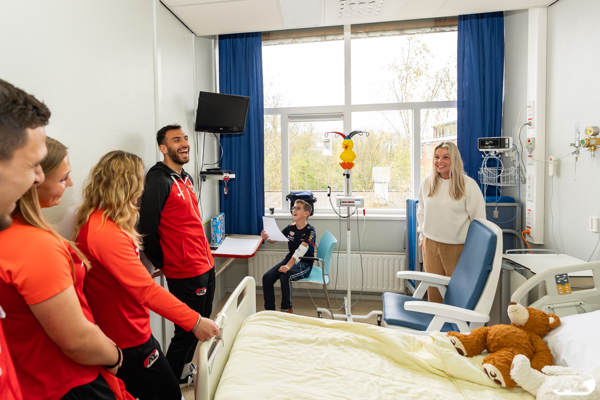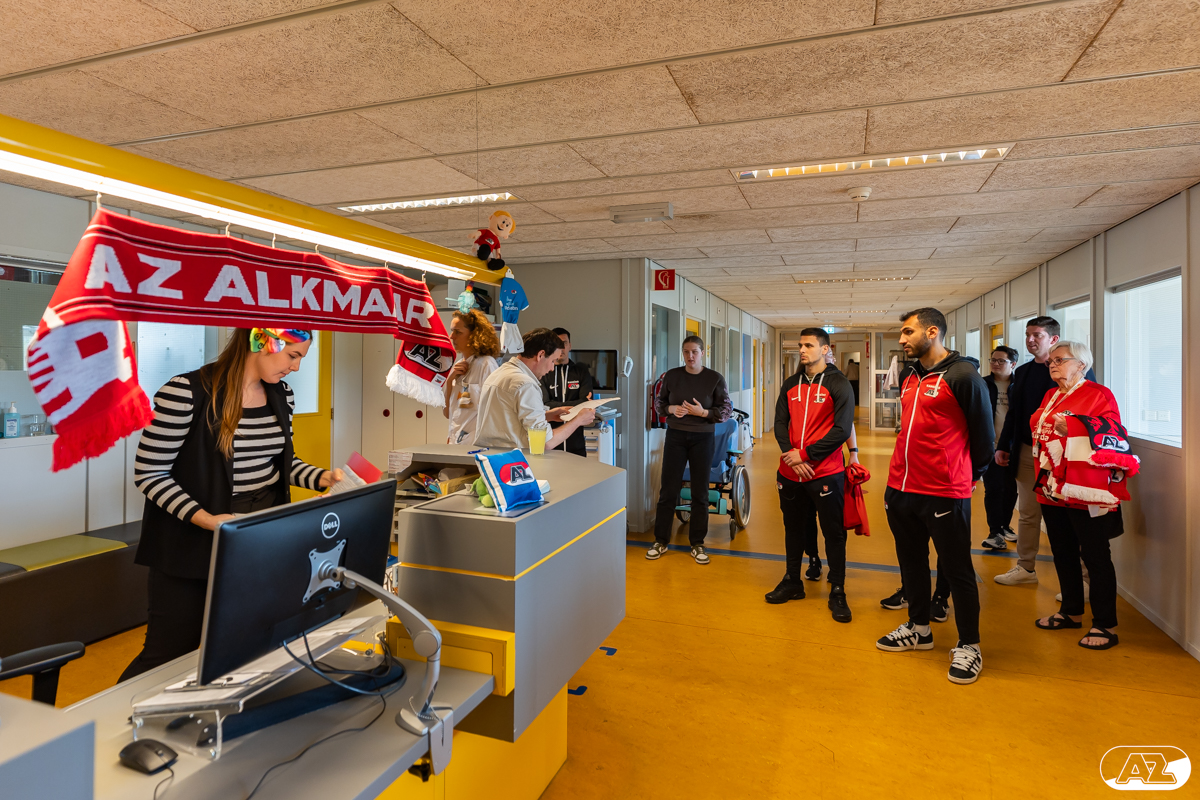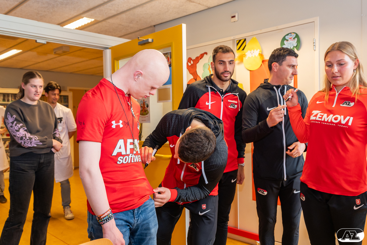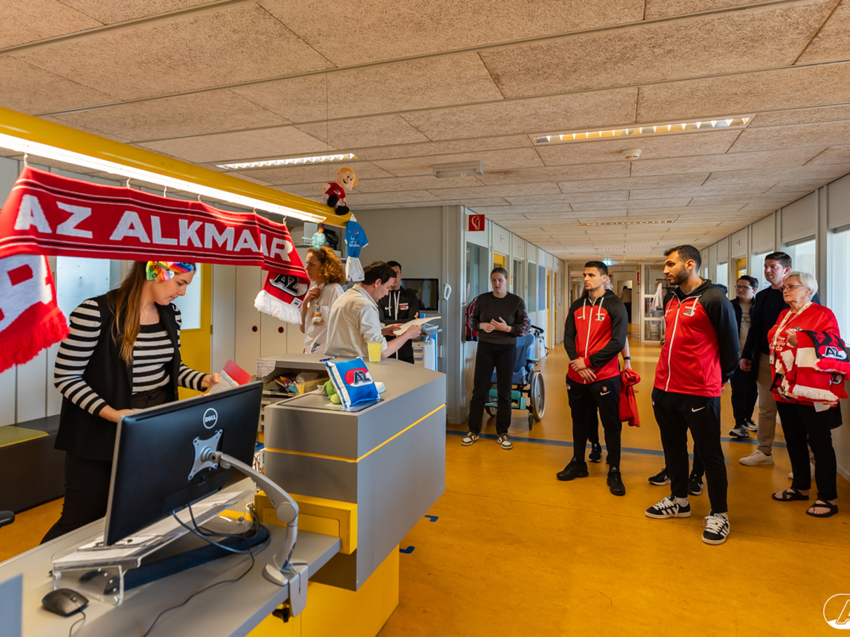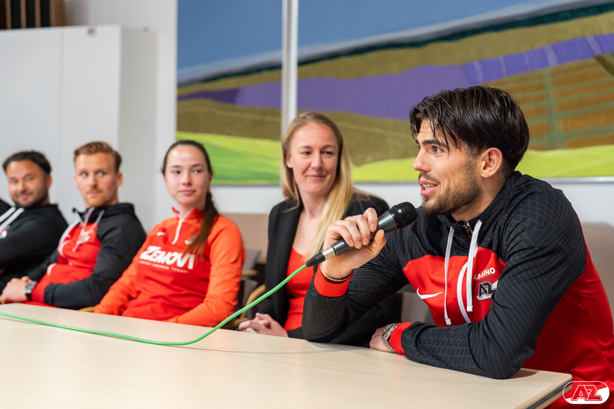 ALKMAAR- Meer dan vijftig kinderen in ziekenhuis Noordwest te Alkmaar werden dinsdag blij verrast door een bezoekje van spelers van AZ 1, speelsters van de AZ Vrouwen en stafleden van beide teams. De kinderen konden bij een persconferentie al hun vragen stellen en ook deelde de AZ-delegatie zich op om verschillende afdelingen te bezoeken. Het ziekenhuisbezoek in beeld. (Foto's: Ed van de Pol)