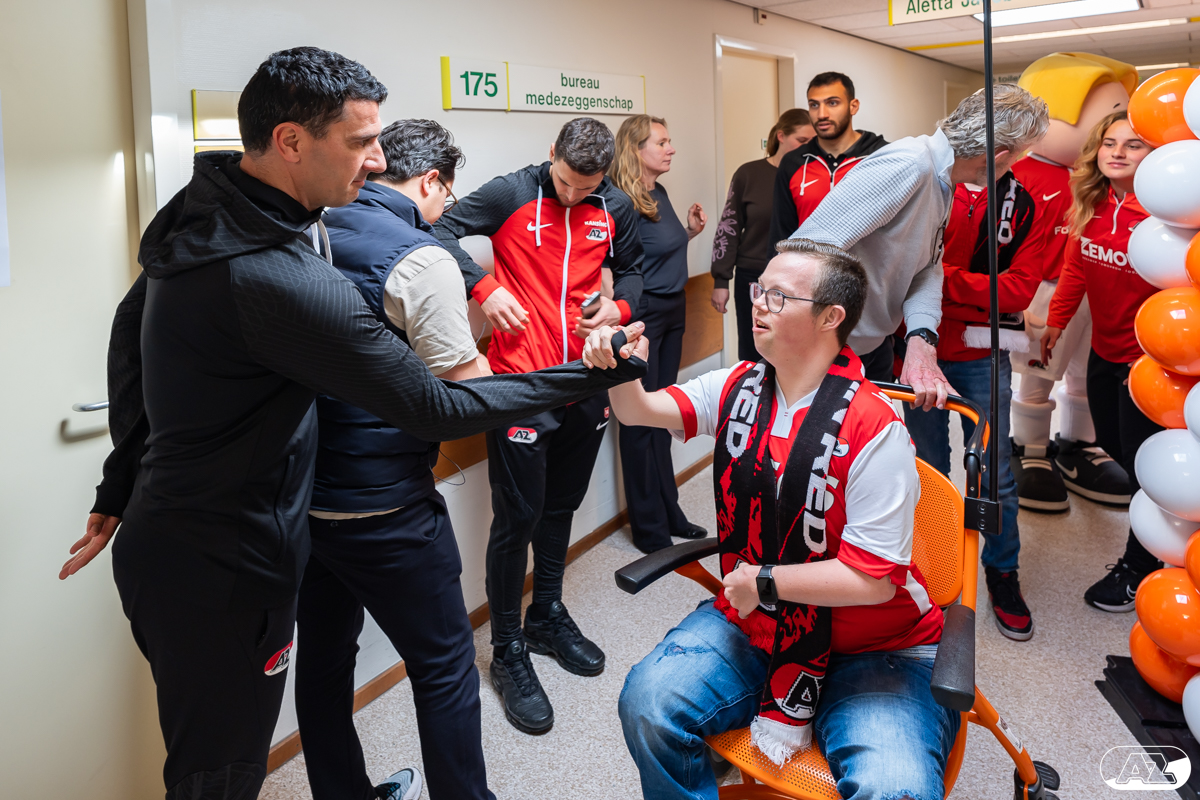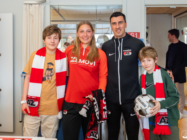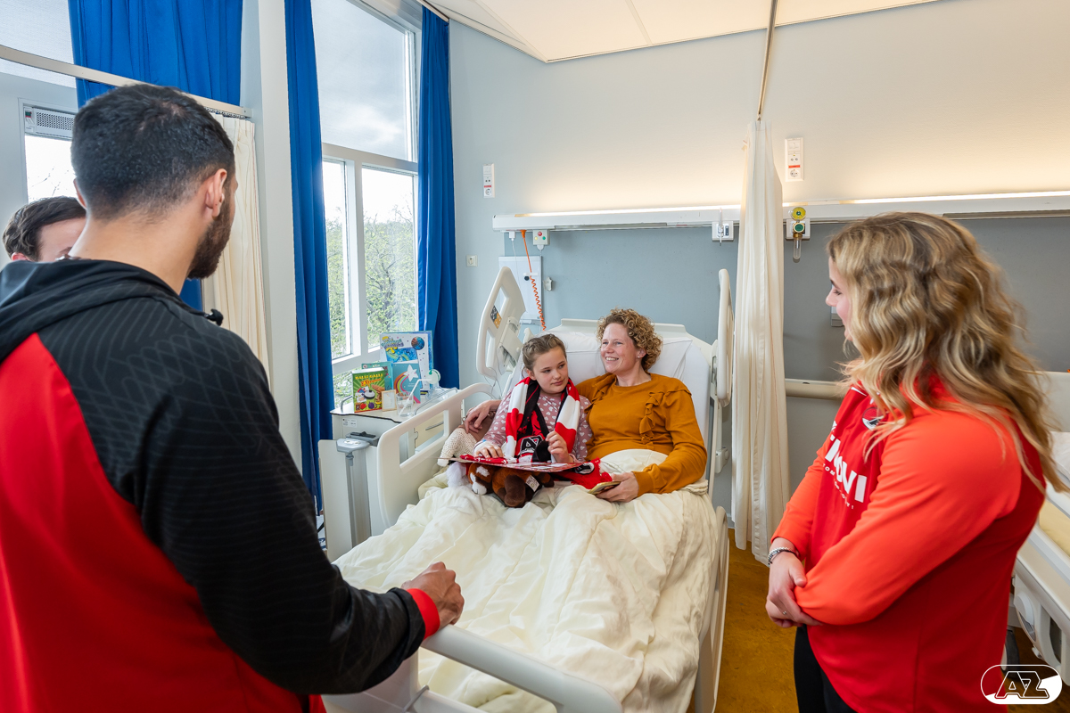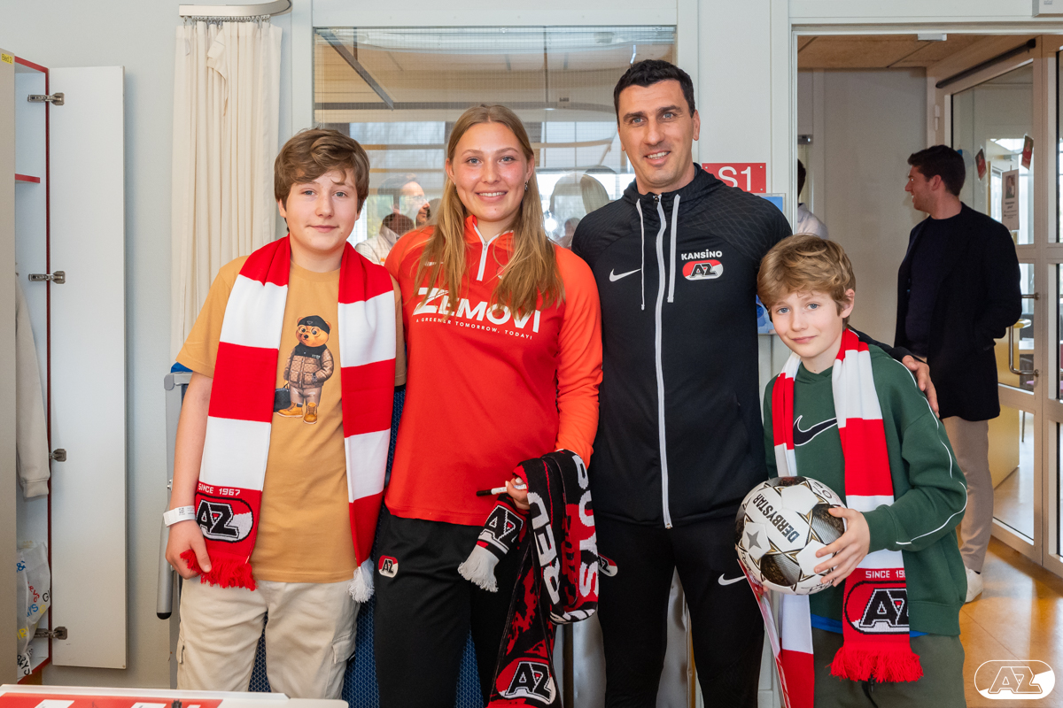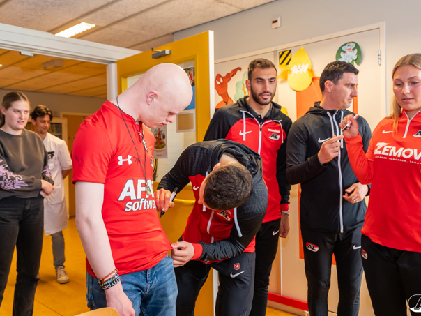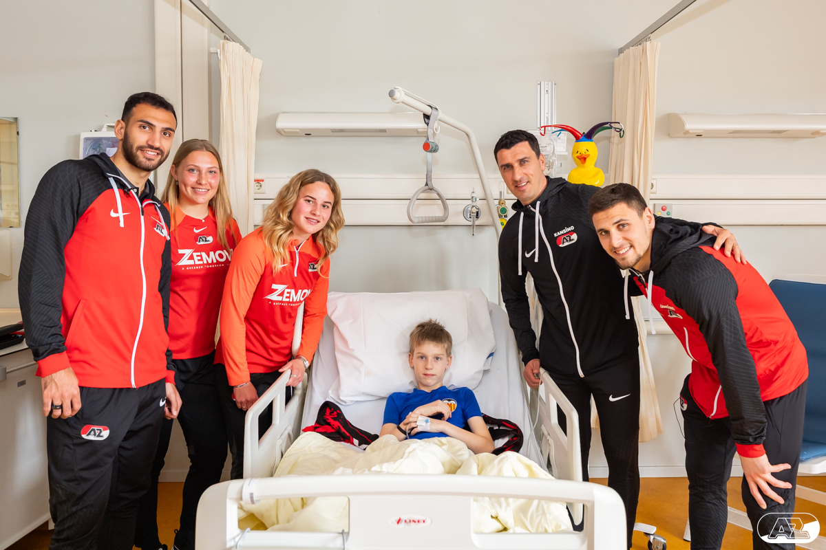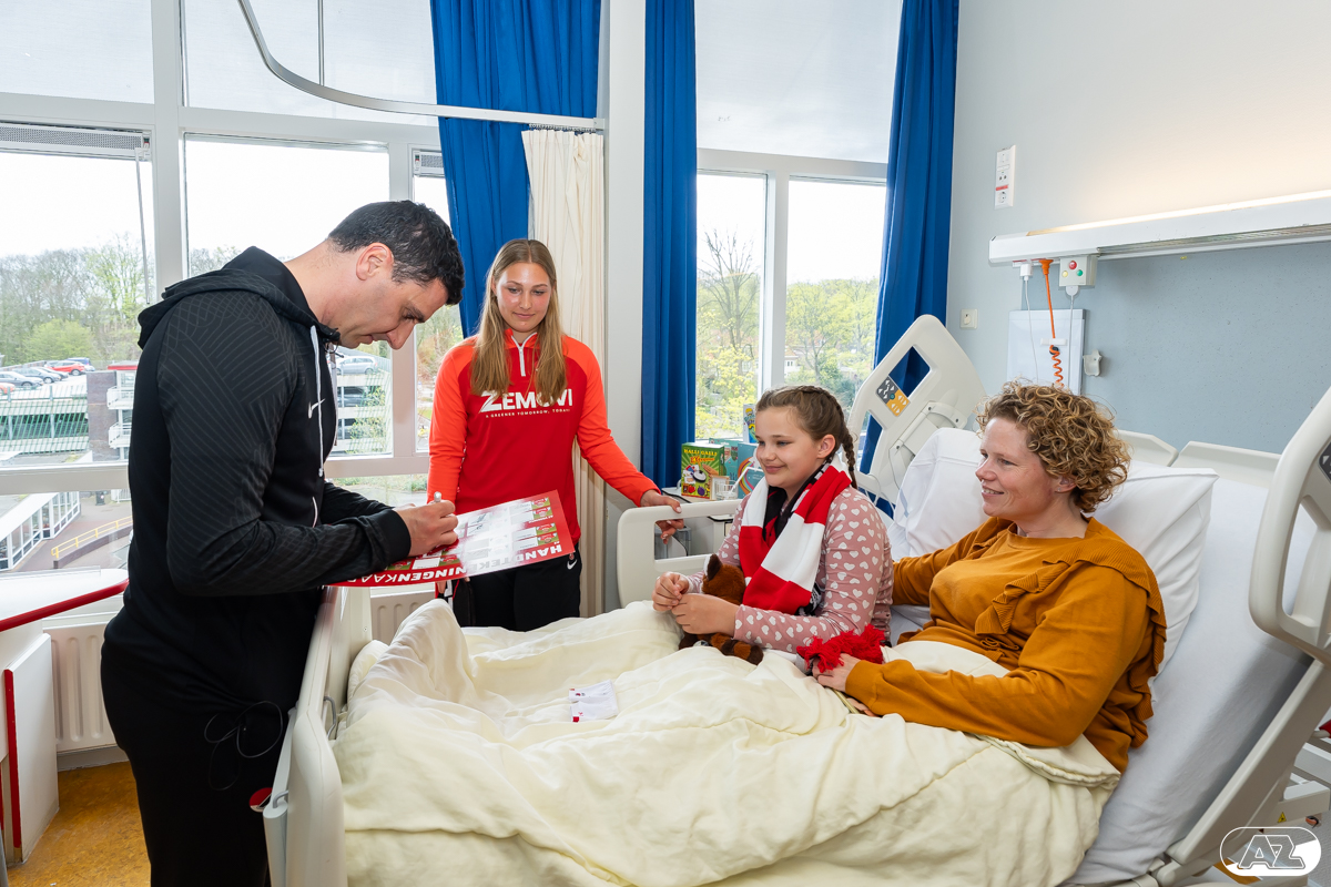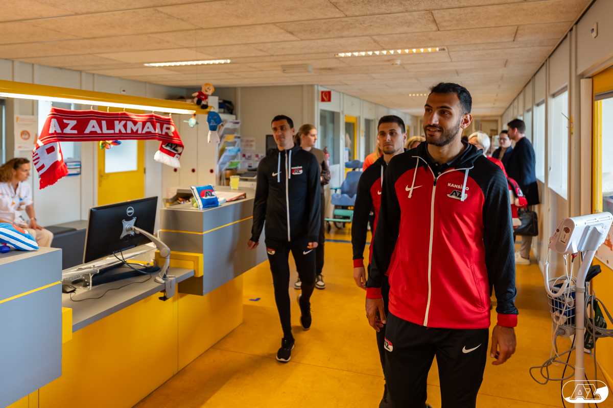 ALKMAAR- Meer dan vijftig kinderen in ziekenhuis Noordwest te Alkmaar werden dinsdag blij verrast door een bezoekje van spelers van AZ 1, speelsters van de AZ Vrouwen en stafleden van beide teams. De kinderen konden bij een persconferentie al hun vragen stellen en ook deelde de AZ-delegatie zich op om verschillende afdelingen te bezoeken. Het ziekenhuisbezoek in beeld. (Foto's: Ed van de Pol)