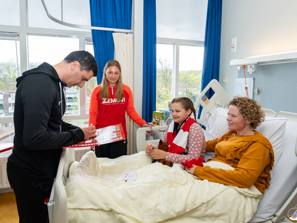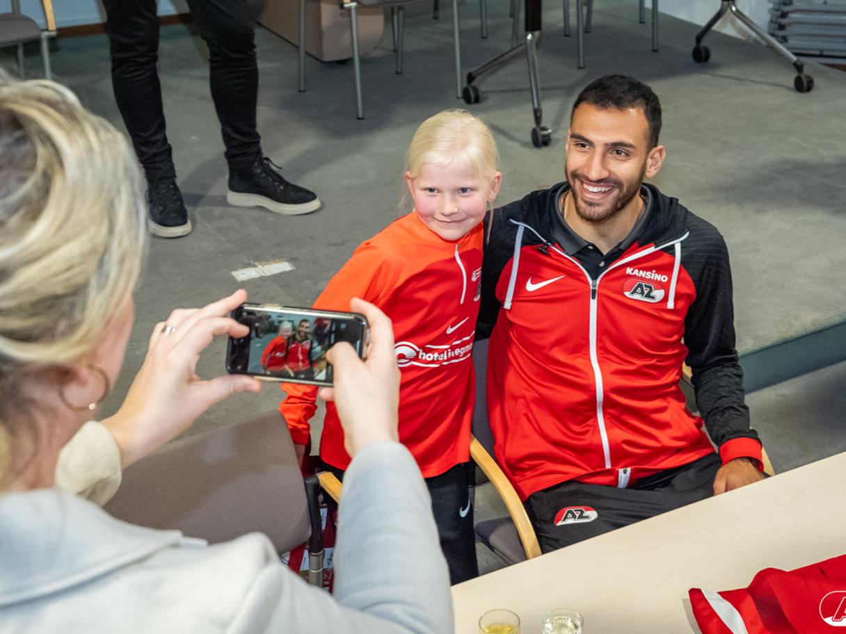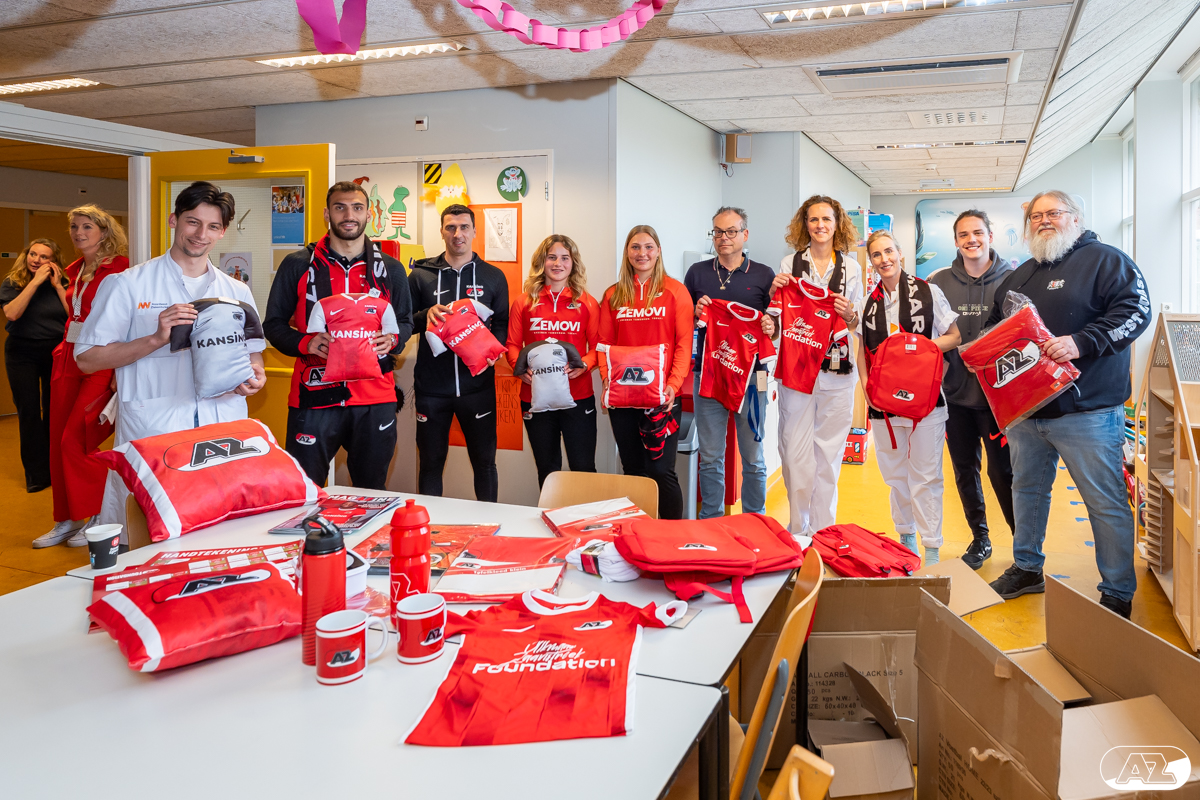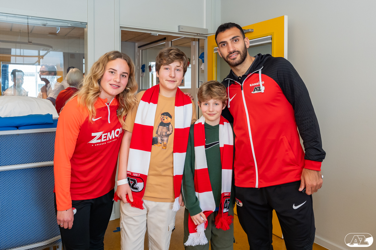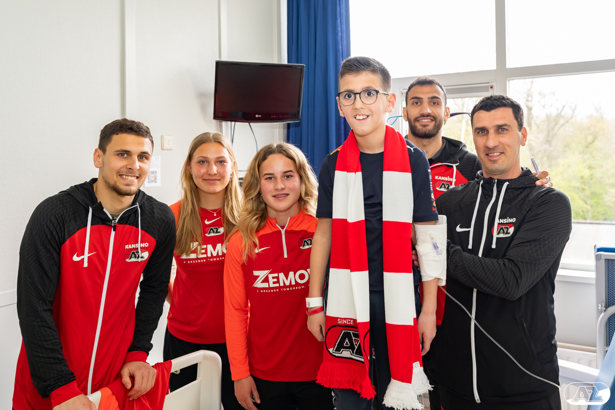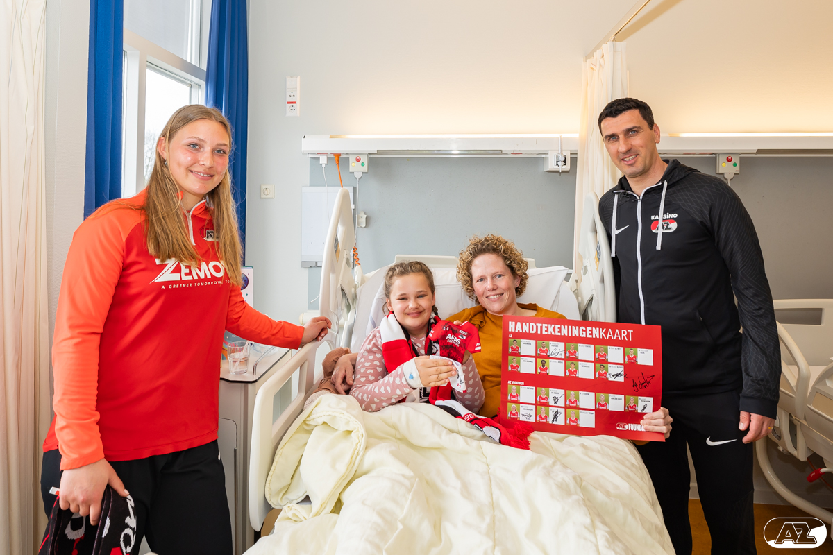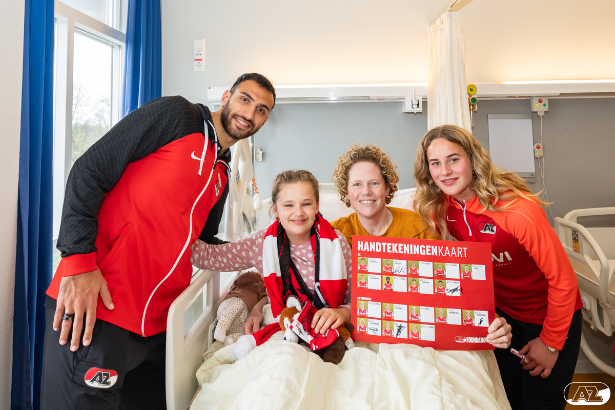 ALKMAAR- Meer dan vijftig kinderen in ziekenhuis Noordwest te Alkmaar werden dinsdag blij verrast door een bezoekje van spelers van AZ 1, speelsters van de AZ Vrouwen en stafleden van beide teams. De kinderen konden bij een persconferentie al hun vragen stellen en ook deelde de AZ-delegatie zich op om verschillende afdelingen te bezoeken. Het ziekenhuisbezoek in beeld. (Foto's: Ed van de Pol)