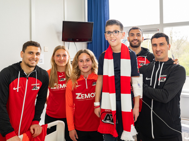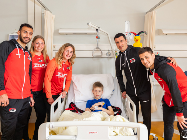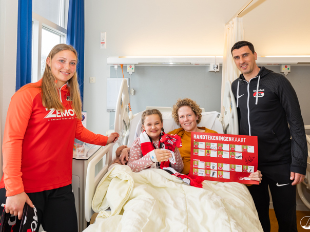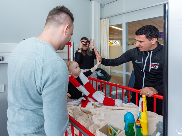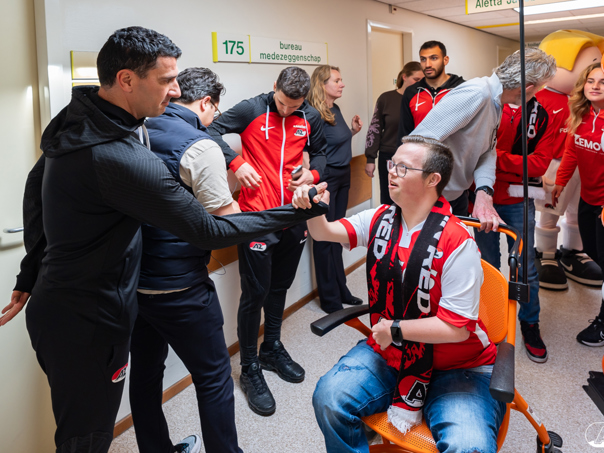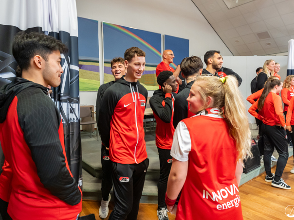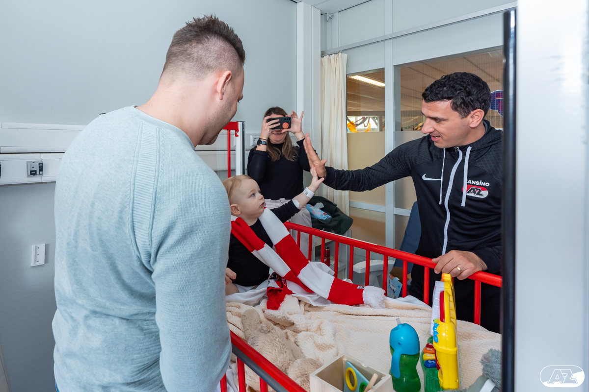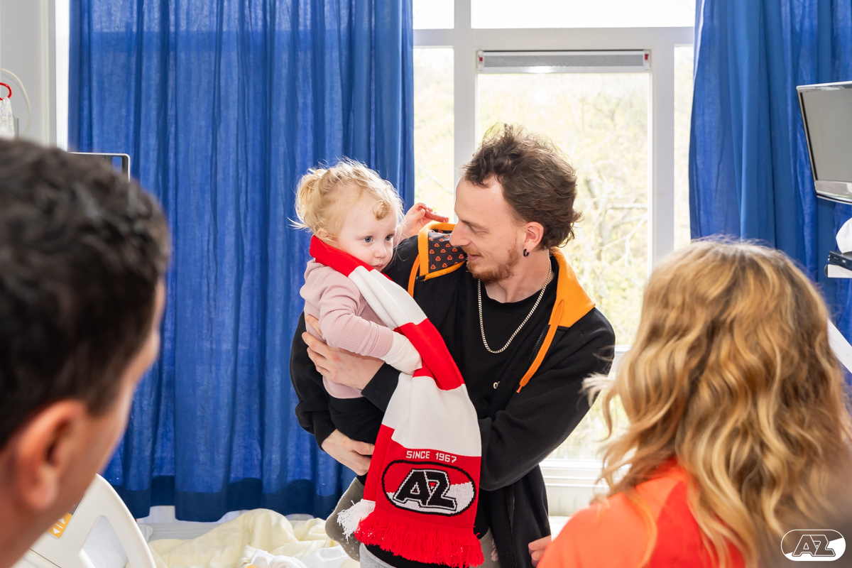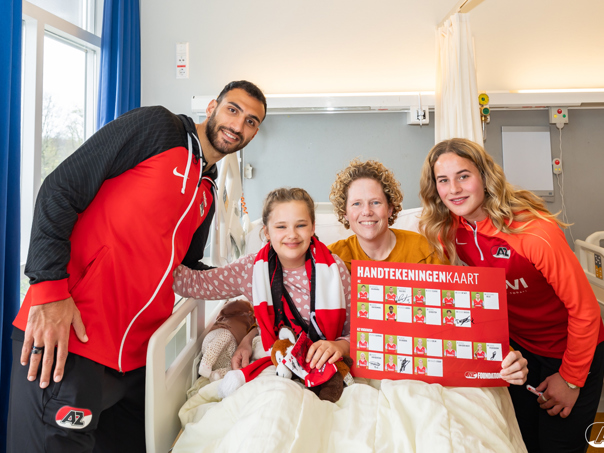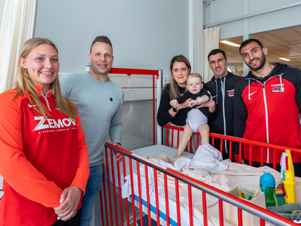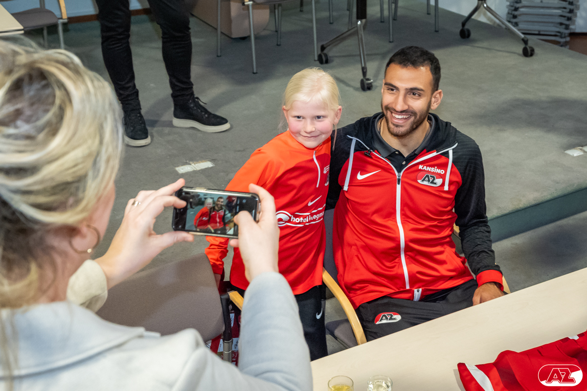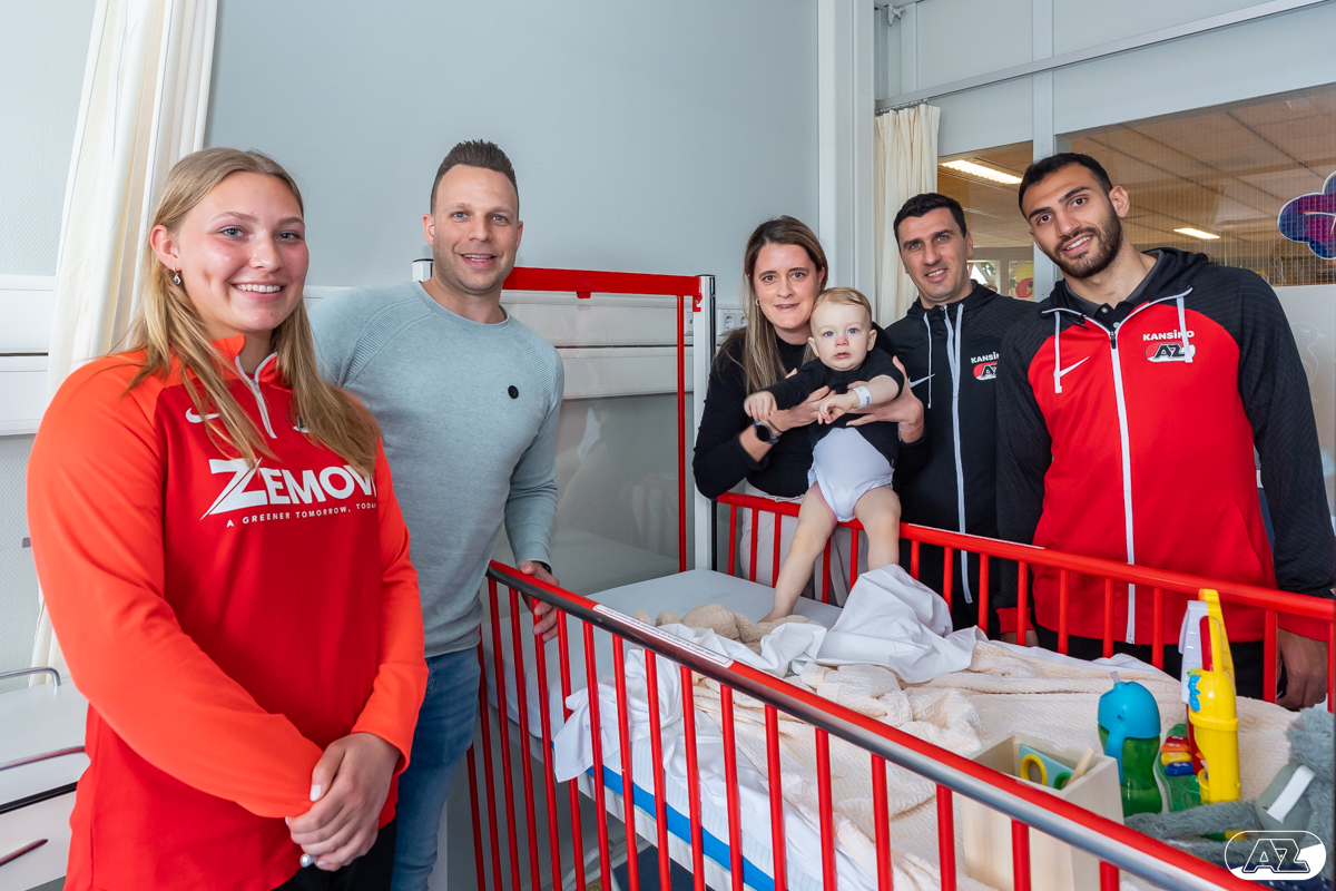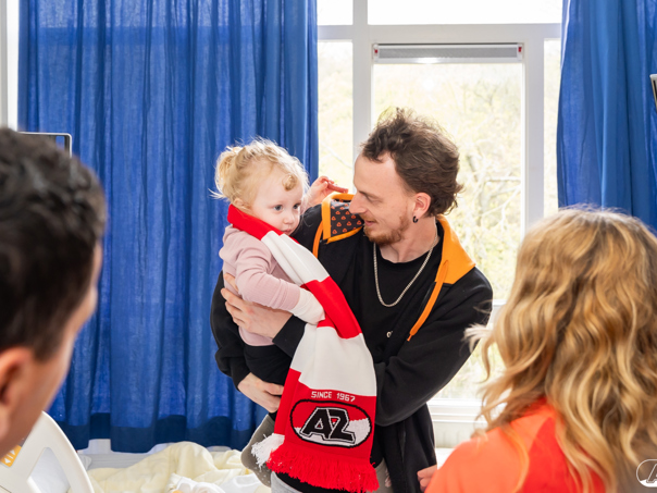 ALKMAAR- Meer dan vijftig kinderen in ziekenhuis Noordwest te Alkmaar werden dinsdag blij verrast door een bezoekje van spelers van AZ 1, speelsters van de AZ Vrouwen en stafleden van beide teams. De kinderen konden bij een persconferentie al hun vragen stellen en ook deelde de AZ-delegatie zich op om verschillende afdelingen te bezoeken. Het ziekenhuisbezoek in beeld. (Foto's: Ed van de Pol)