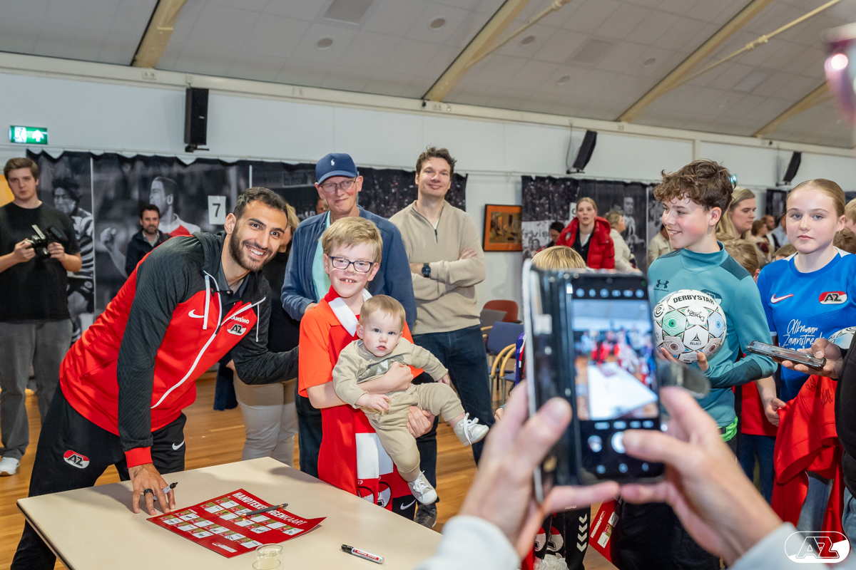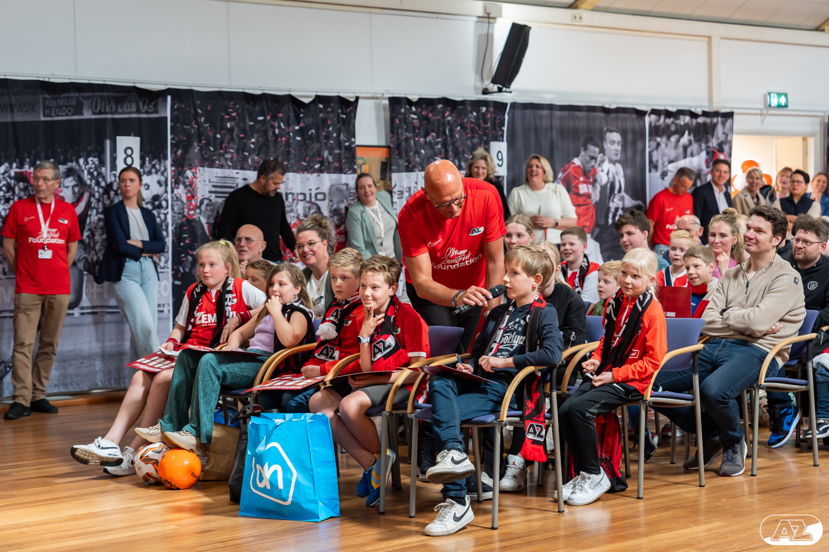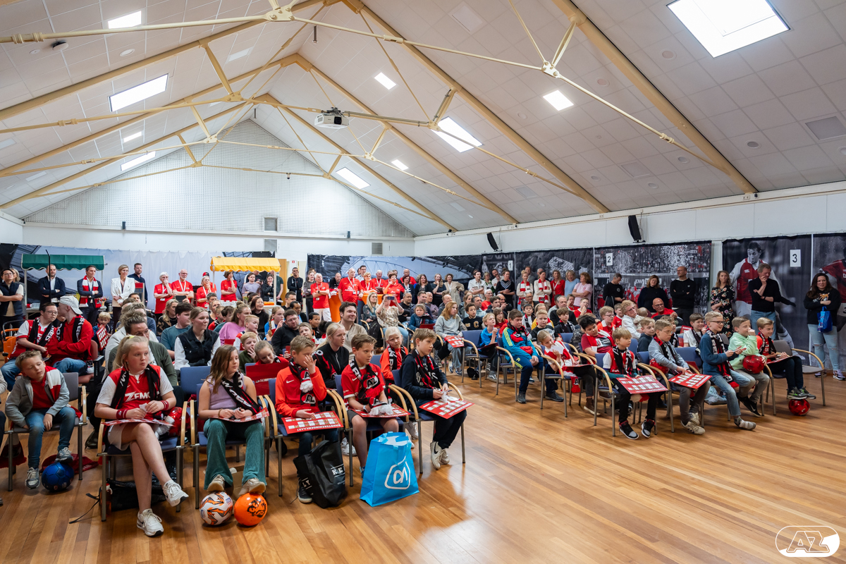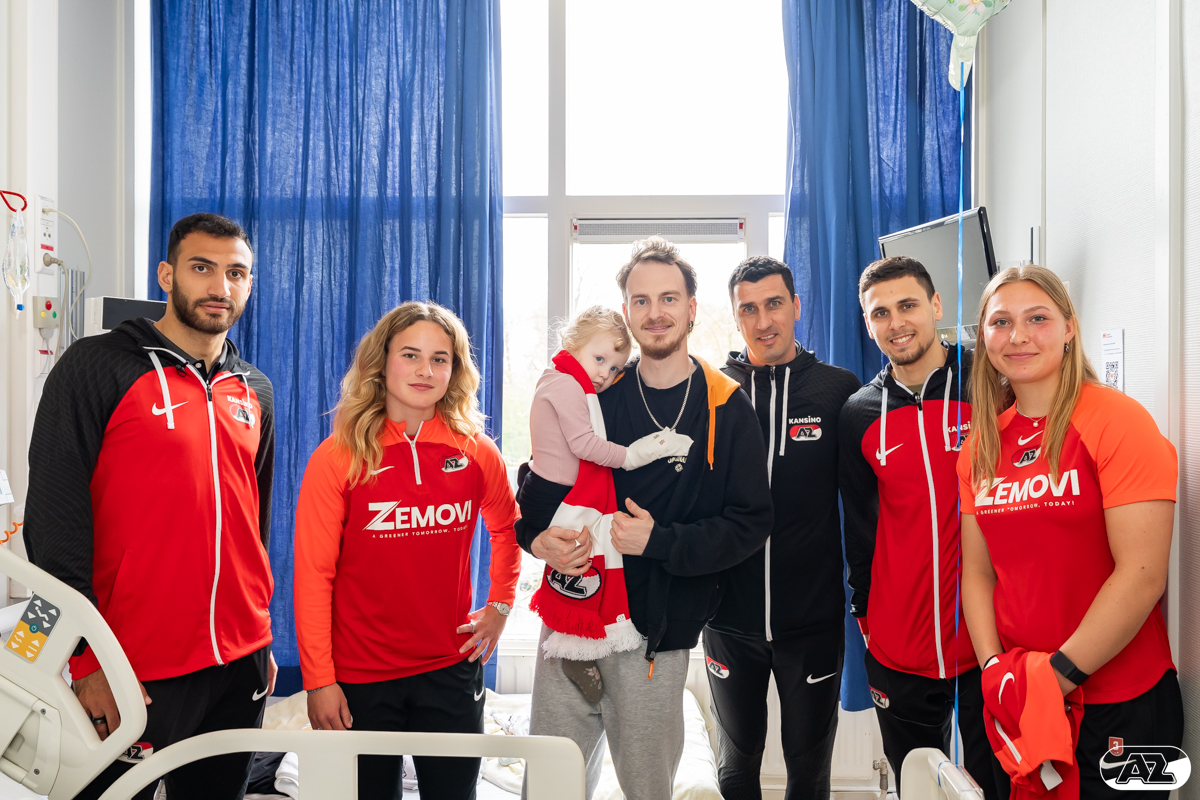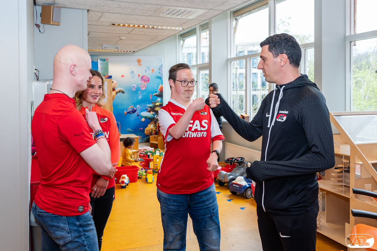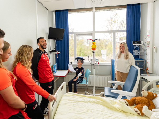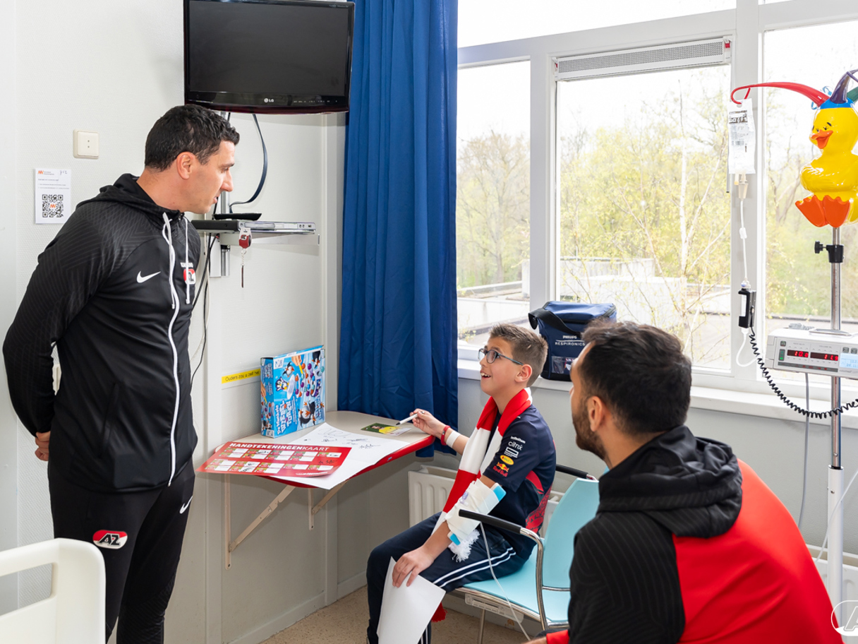 ALKMAAR- Meer dan vijftig kinderen in ziekenhuis Noordwest te Alkmaar werden dinsdag blij verrast door een bezoekje van spelers van AZ 1, speelsters van de AZ Vrouwen en stafleden van beide teams. De kinderen konden bij een persconferentie al hun vragen stellen en ook deelde de AZ-delegatie zich op om verschillende afdelingen te bezoeken. Het ziekenhuisbezoek in beeld. (Foto's: Ed van de Pol)