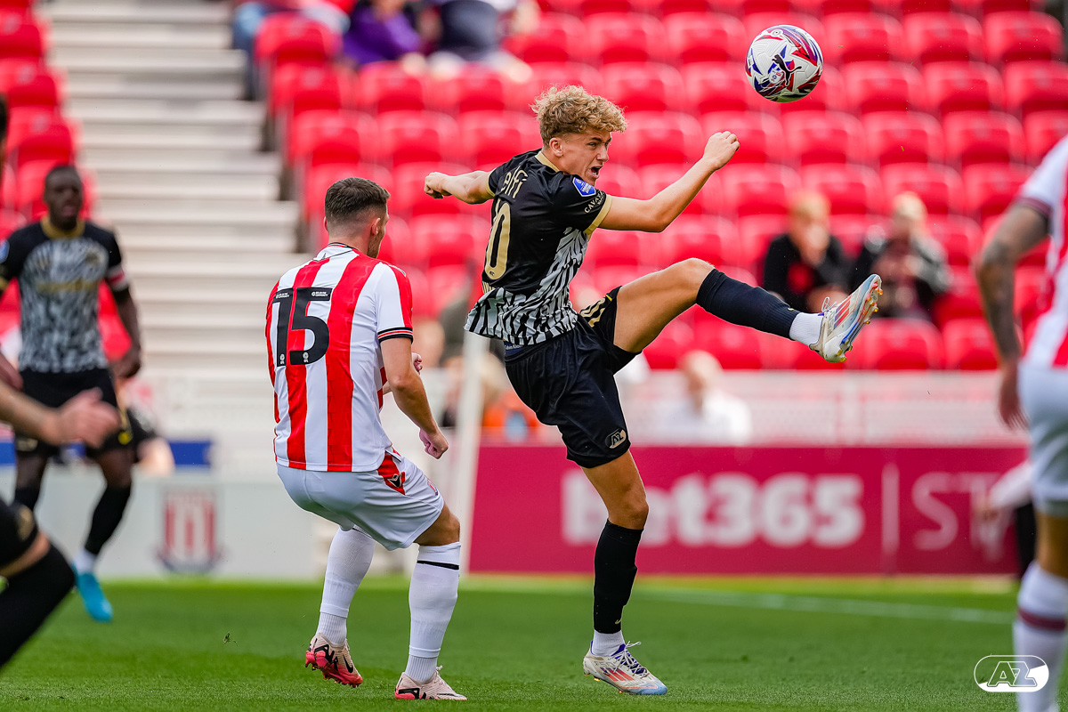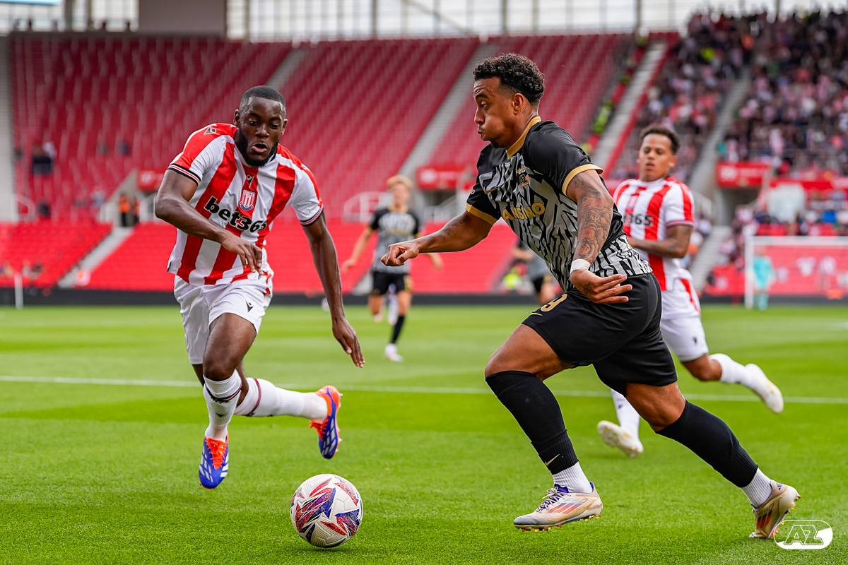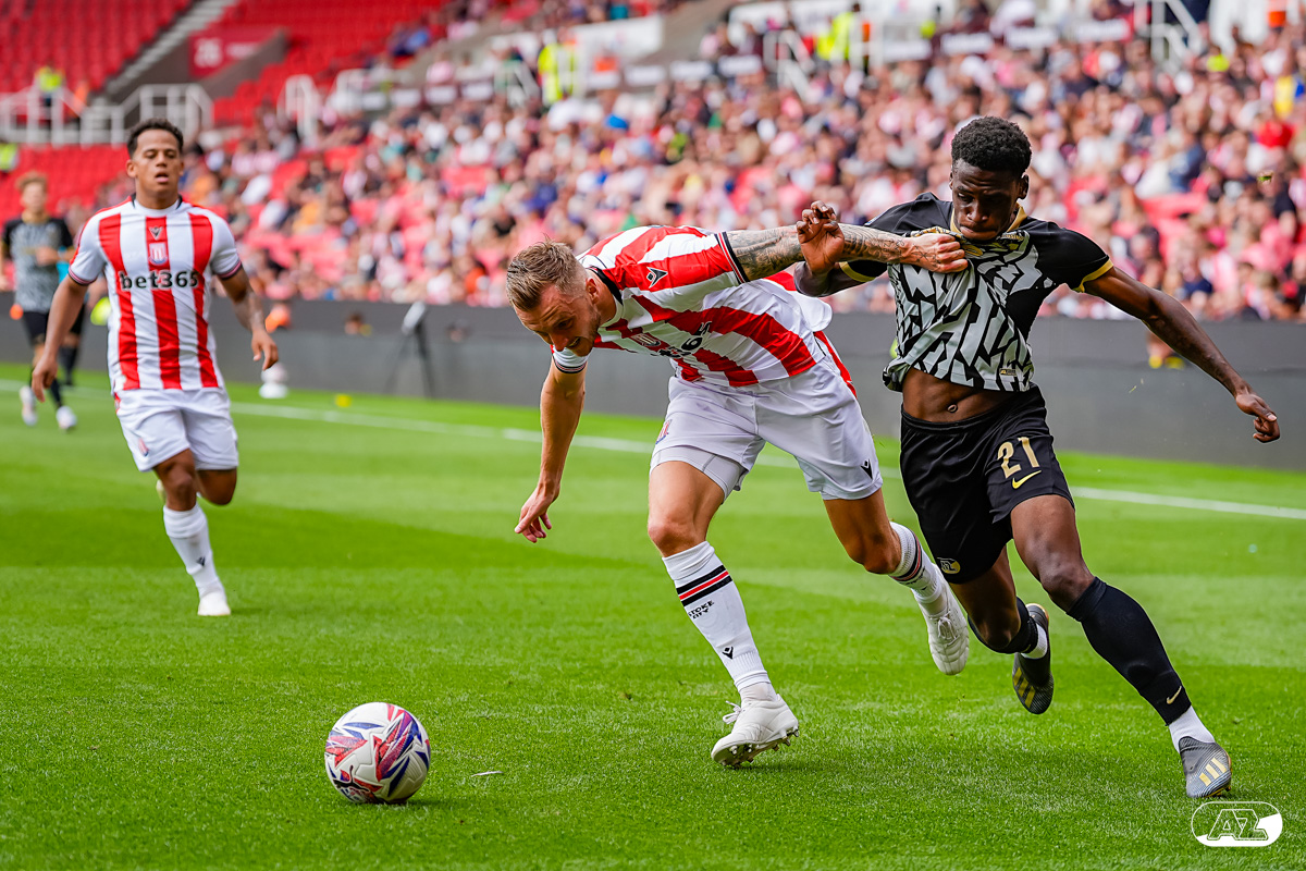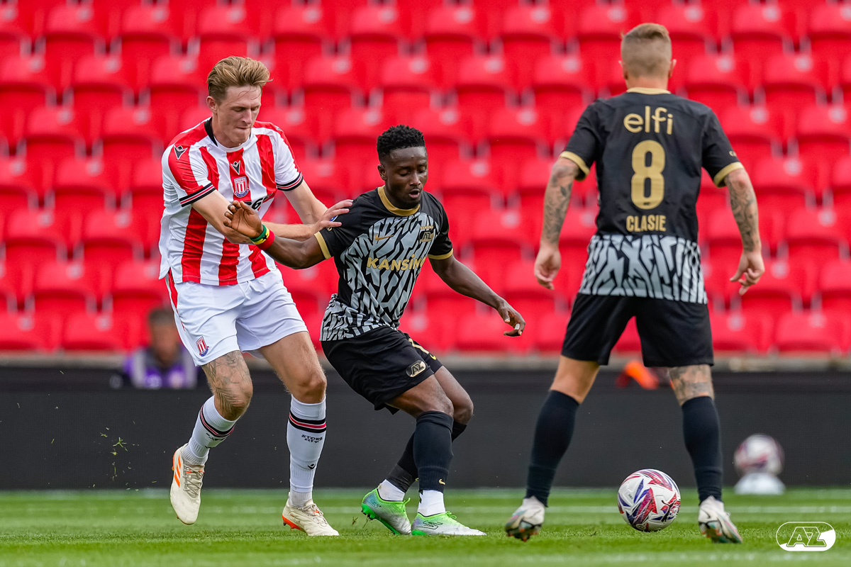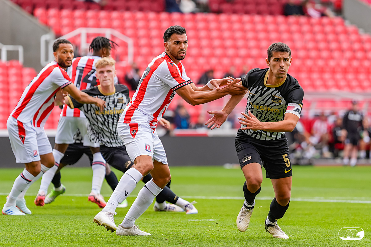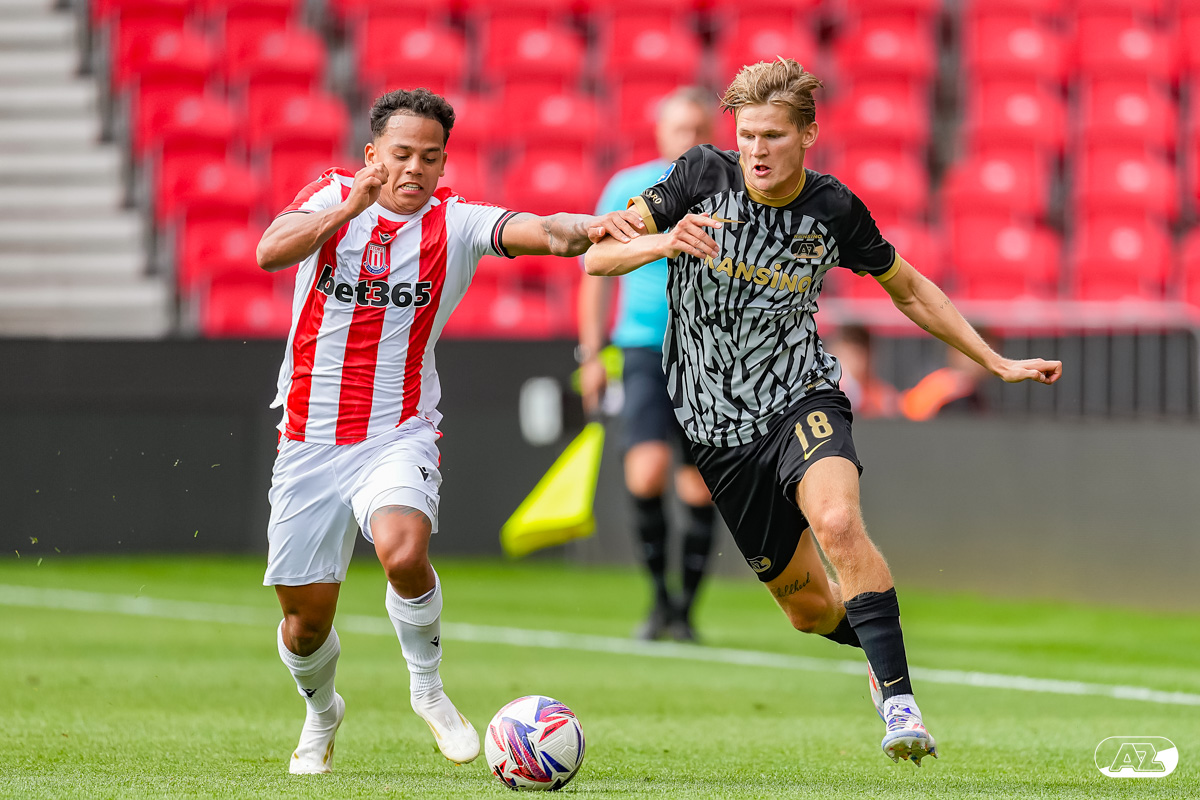 STOKE-ON-TRENT- AZ boekte zaterdagmiddag een overwinning op het Engelse Stoke City FC. In het Bet365 Stadium maakte Troy Parrott de enige goal van de wedstrijd, wat resulteerde in een 0-1 uitzege. Het duel met The Potters was voor de club uit Alkmaar de laatste wedstrijd in de voorbereiding op het nieuwe seizoen. De confrontatie in beeld. (Foto's: Ed van de Pol)
