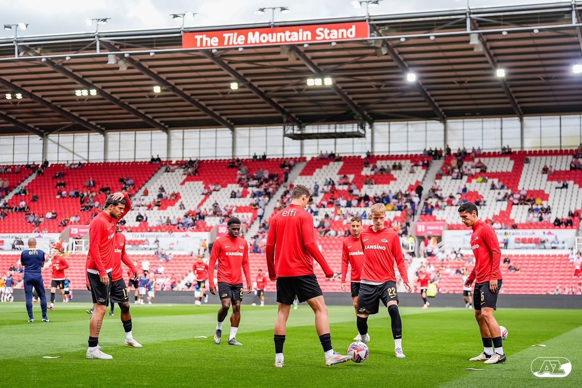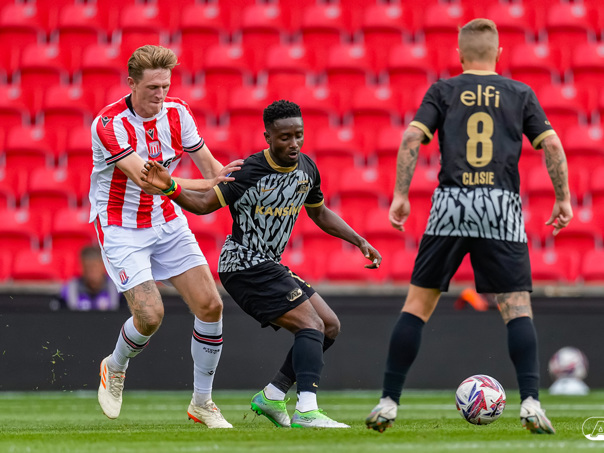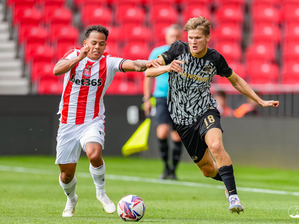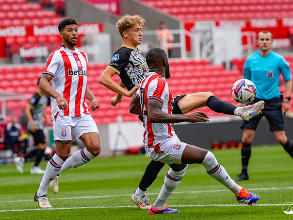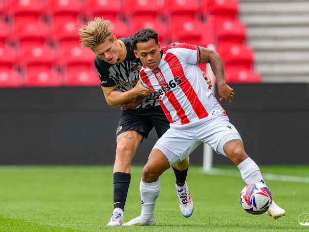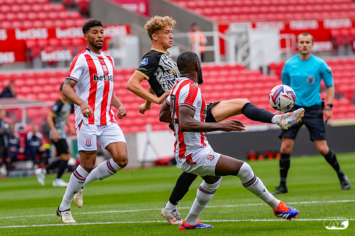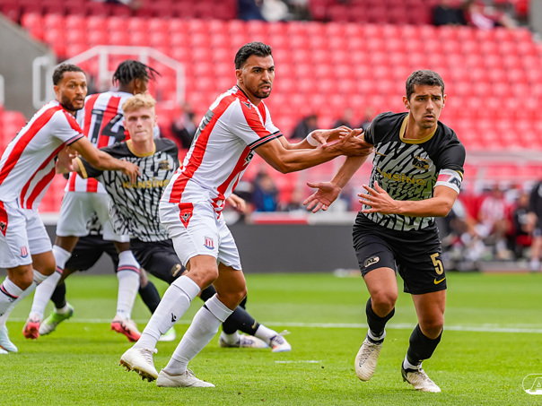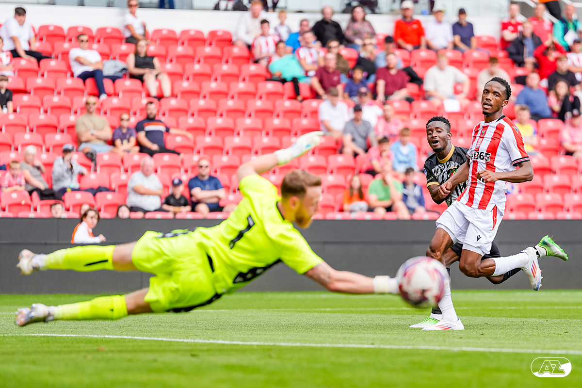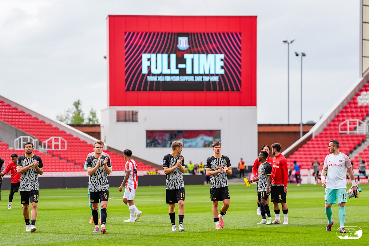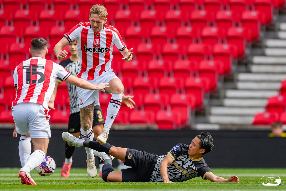 STOKE-ON-TRENT- AZ boekte zaterdagmiddag een overwinning op het Engelse Stoke City FC. In het Bet365 Stadium maakte Troy Parrott de enige goal van de wedstrijd, wat resulteerde in een 0-1 uitzege. Het duel met The Potters was voor de club uit Alkmaar de laatste wedstrijd in de voorbereiding op het nieuwe seizoen. De confrontatie in beeld. (Foto's: Ed van de Pol)