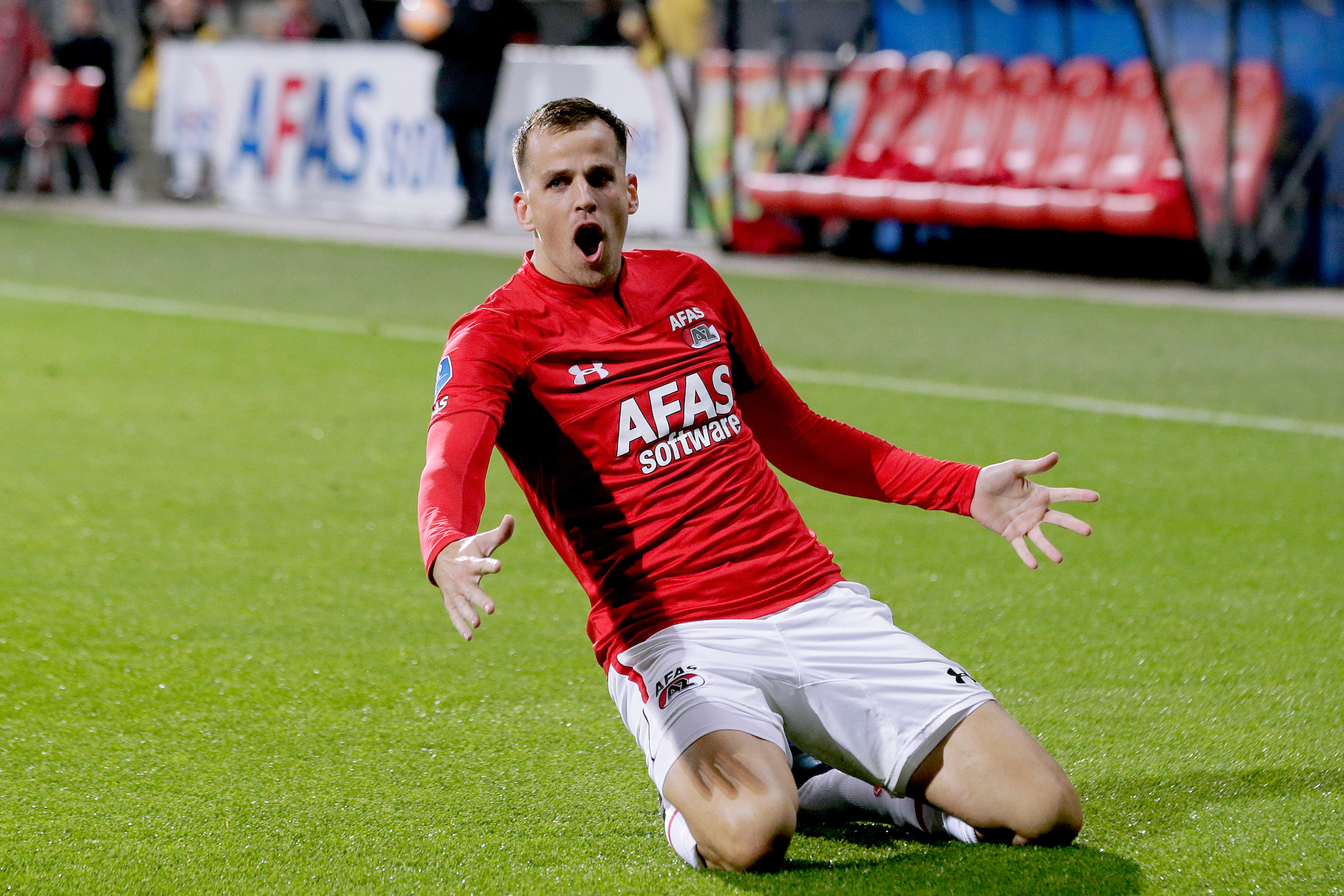 Mats Seuntjens viert zijn doelpunt namens AZ. (Foto: Ed van de Pol).