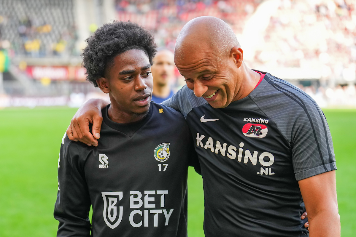 Iman Griffith met assistent-trainer Kenneth Goudmijn voorafgaand aan AZ - Fortuna Sittard eerder dit seizoen.