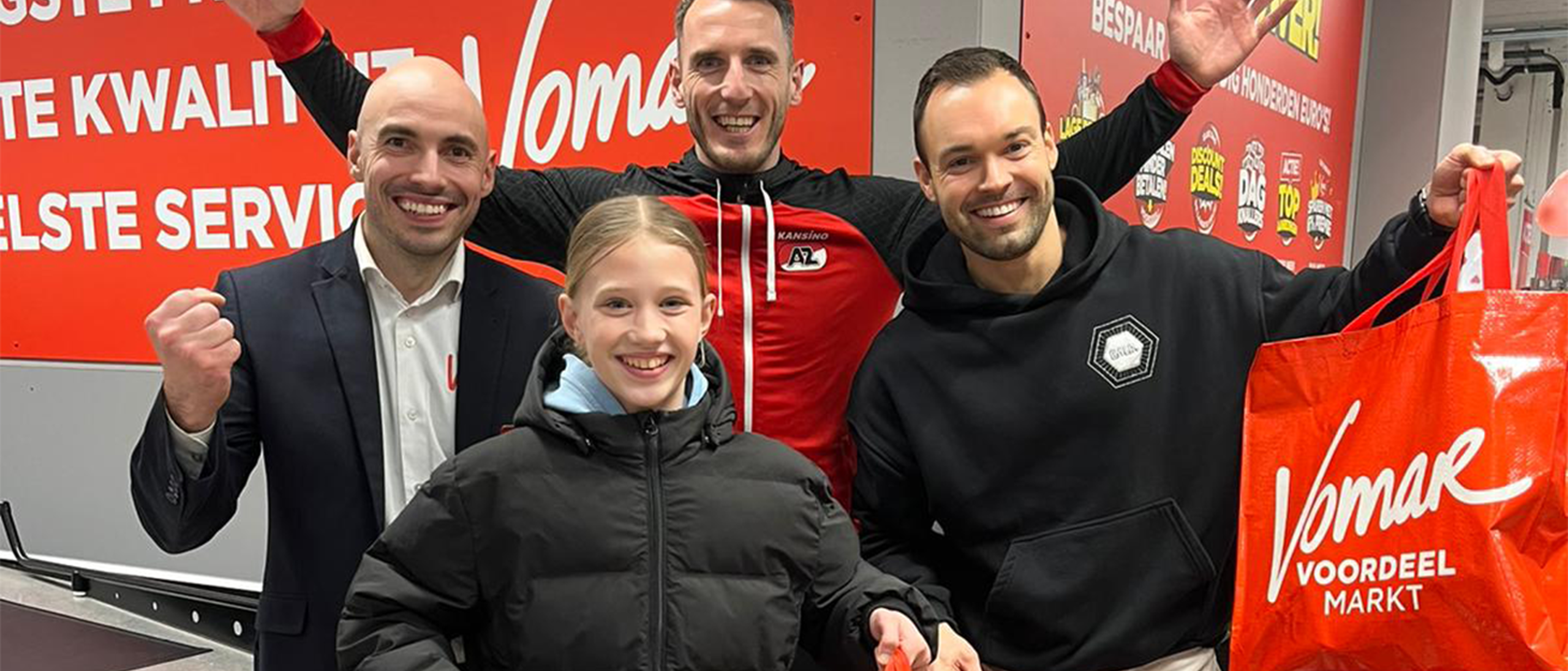 In de rust bij AZ - Heracles Almelo hadden Niels Groot en Isa van Duin een minuut gratis winkelen gewonnen door het hardst te juichen. Zij werden uitgenodigd in Vomar De Mare.