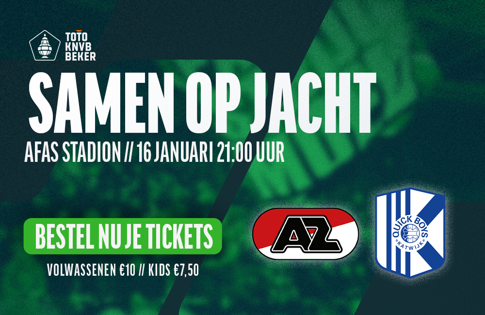 De wedstrijd AZ - Quick Boys wordt dinsdag 16 januari om 21:00 uur afgetrapt. Jij bent er toch ook bij in de jacht op succes in de beker? Bestel nu nog jouw ticket(s)!