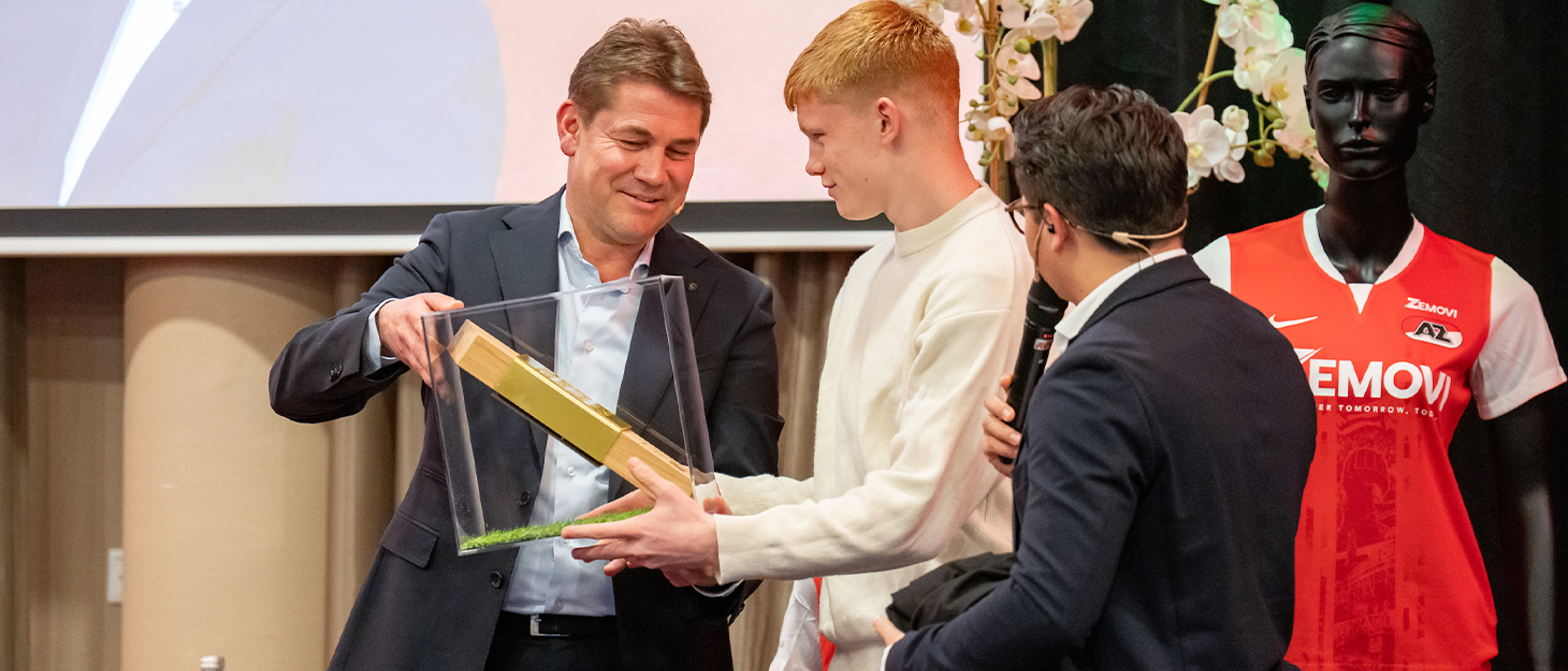 Zoals gezegd kreeg Smit de award uit handen van Huiberts. De Directeur Voetbalzaken had mooie woorden voor de doelpuntenmaker. "Misschien had je het wel verwacht, Kees", zei hij. "Jouw naam staat in de envelop. Het doelpunt heeft met de Youth League een mooie prijs opgeleverd. Het afstandsschot zegt iets over jouw inzicht, één van jouw sterke punten. Ik hoop maar op één ding en dat is dat ik hoop dat je dit ooit voor AZ gaat doen in de grote mannen Champions League."