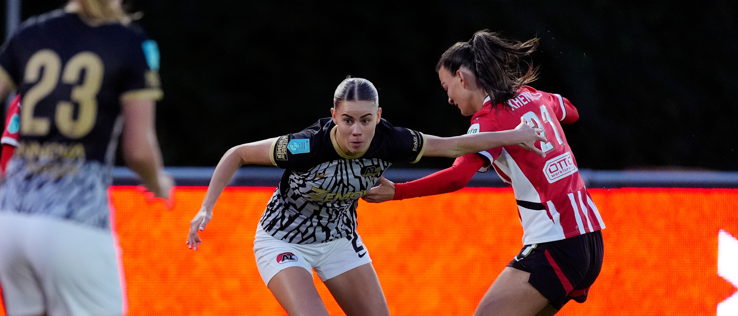 Het antwoord van de Eindhovenaren volgde nog voor rust. Een vrije trap vanaf links werd binnengekopt door middenveldster Sisca Folkertsma. Niet veel later werd de stand bijna weer gelijk, maar Floor Spaan mikte van afstand net boven de lat waardoor AZ met een 2-1 achterstand de rust inging.