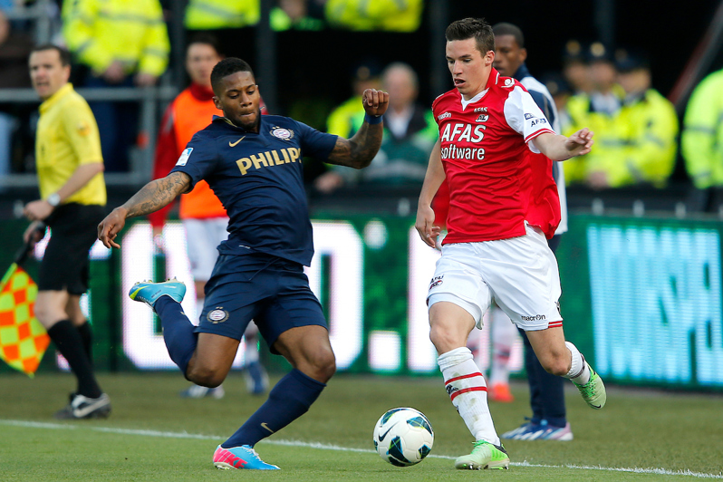 Nick Viergever namens AZ in duel met Jeremain Lens. (Foto: Ed van de Pol).