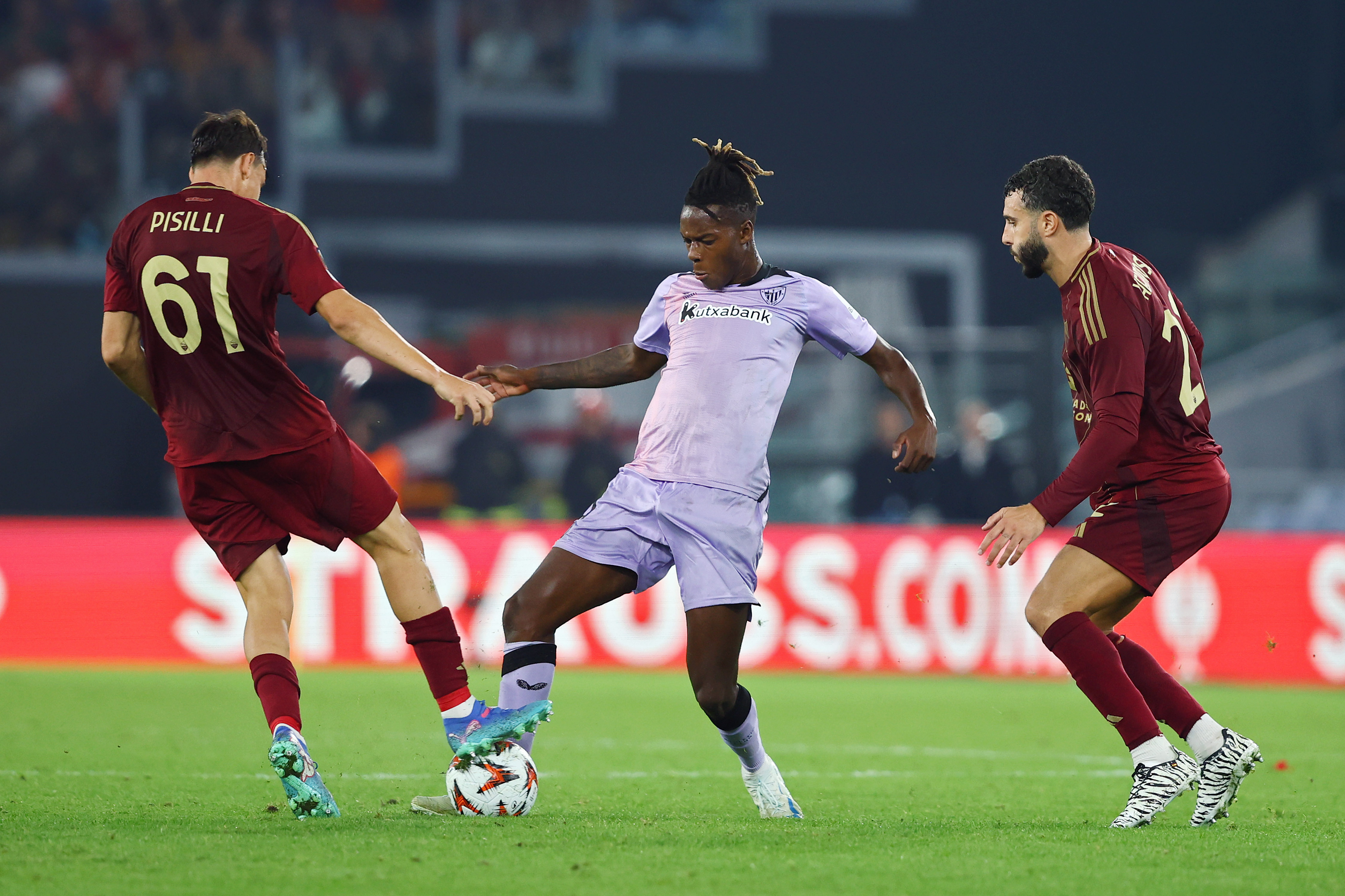 Nico Williams van Athletic Bilbao in duel om de bal met Niccolo Pisilli en Mario Hermoso van AS Roma.