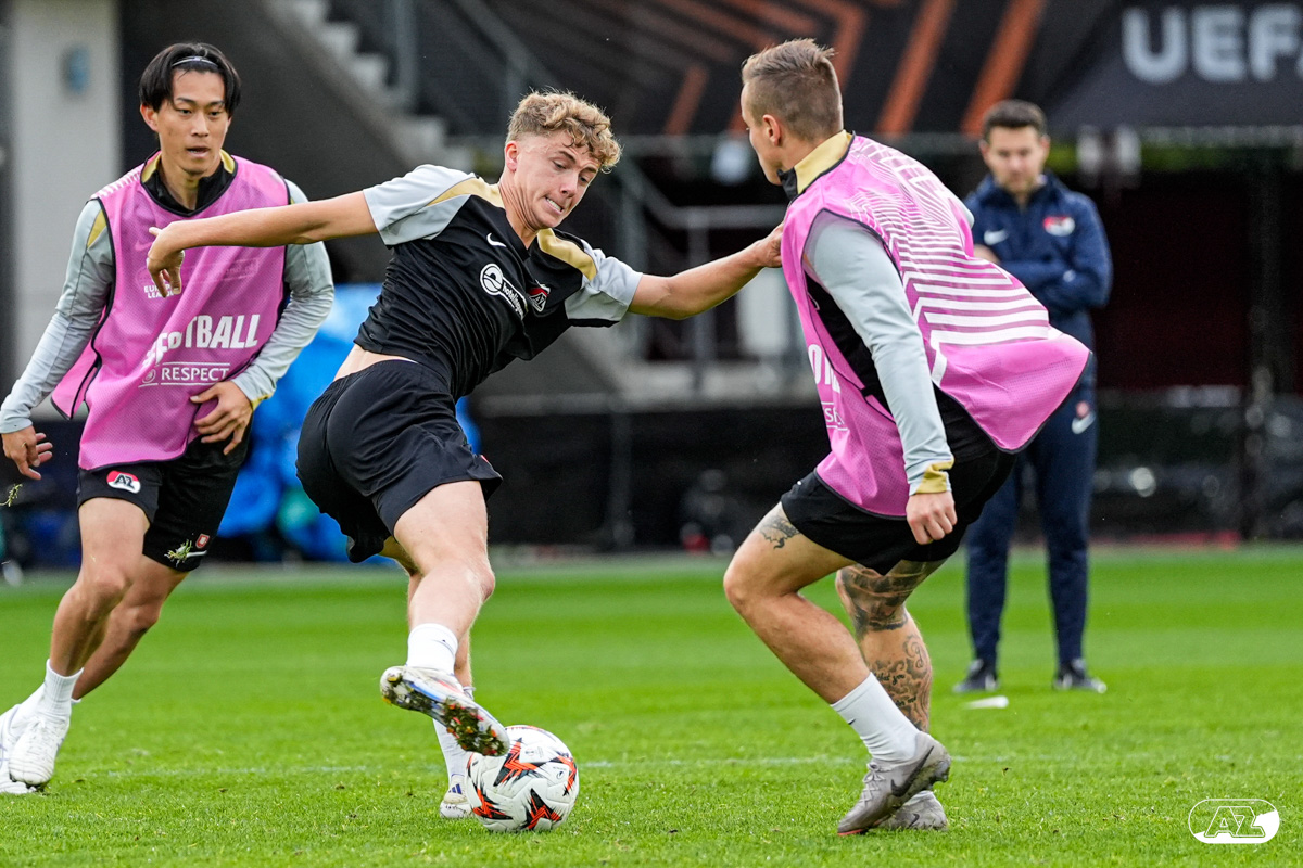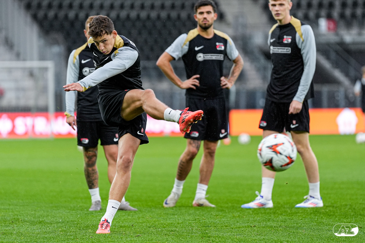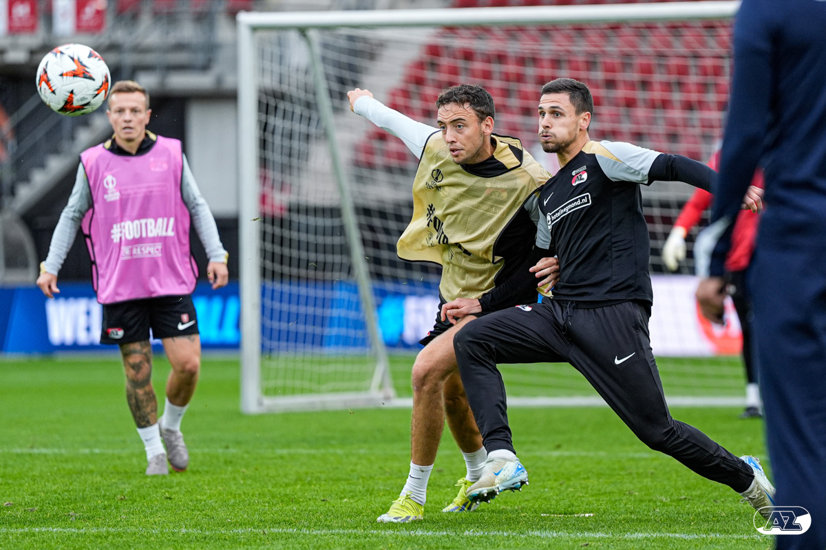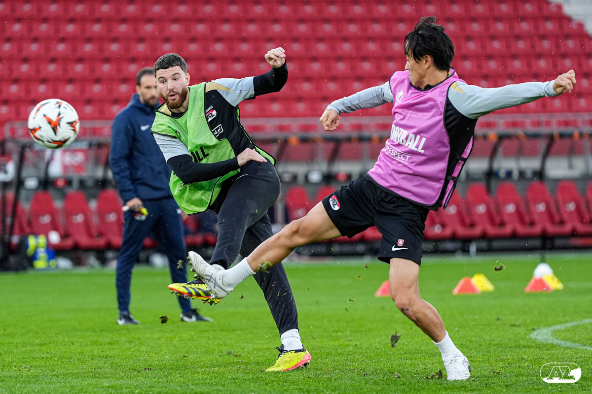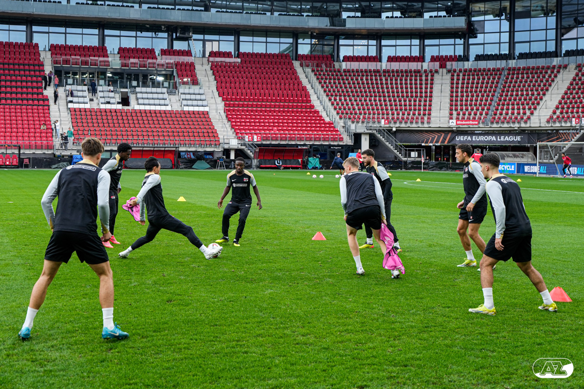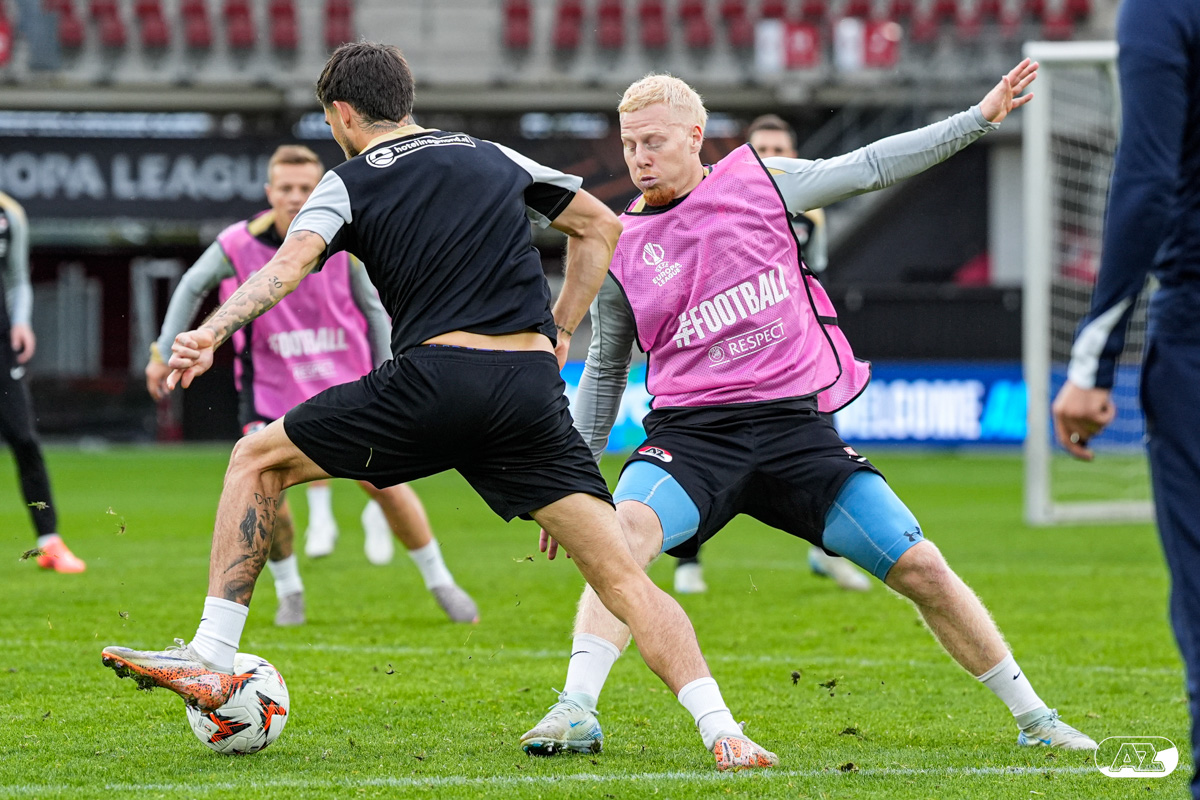 ALKMAAR- AZ staat woensdagavond in de UEFA Europa League tegenover het Zweedse IF Elfsborg. In het AFAS Stadion werkte de ploeg van trainer Maarten Martens dinsdagmiddag toe naar het honderdste Europese thuisduel. De training in beeld. (Foto's: Ed van de Pol)