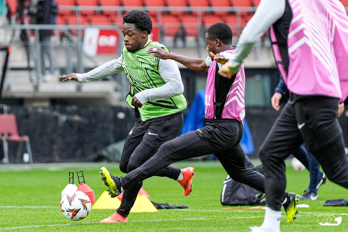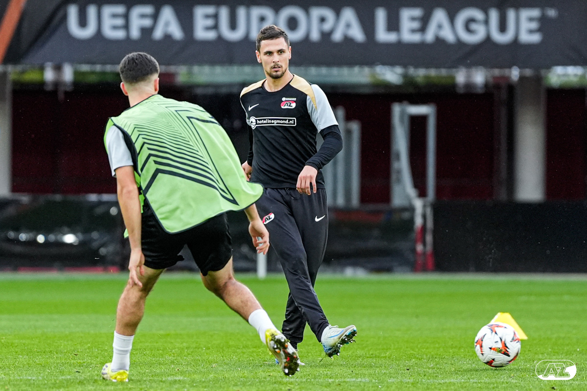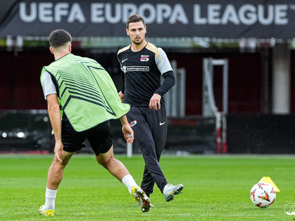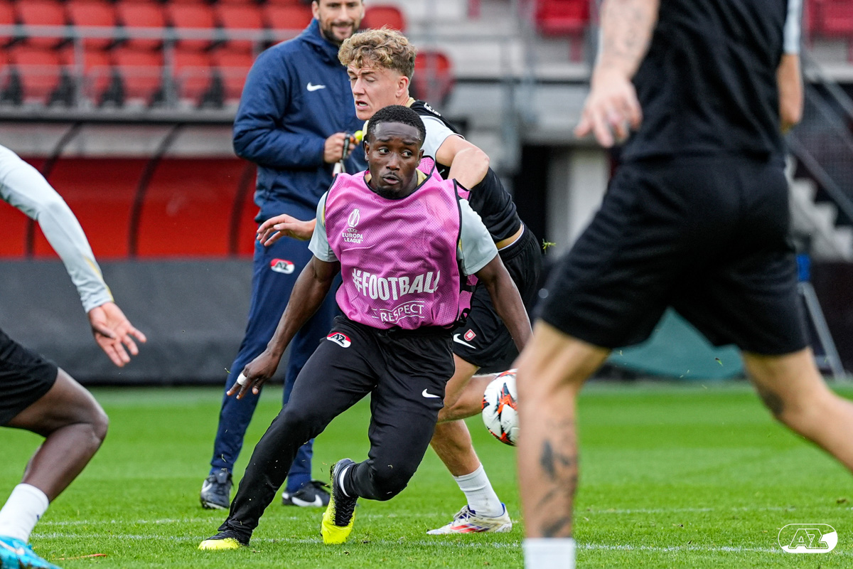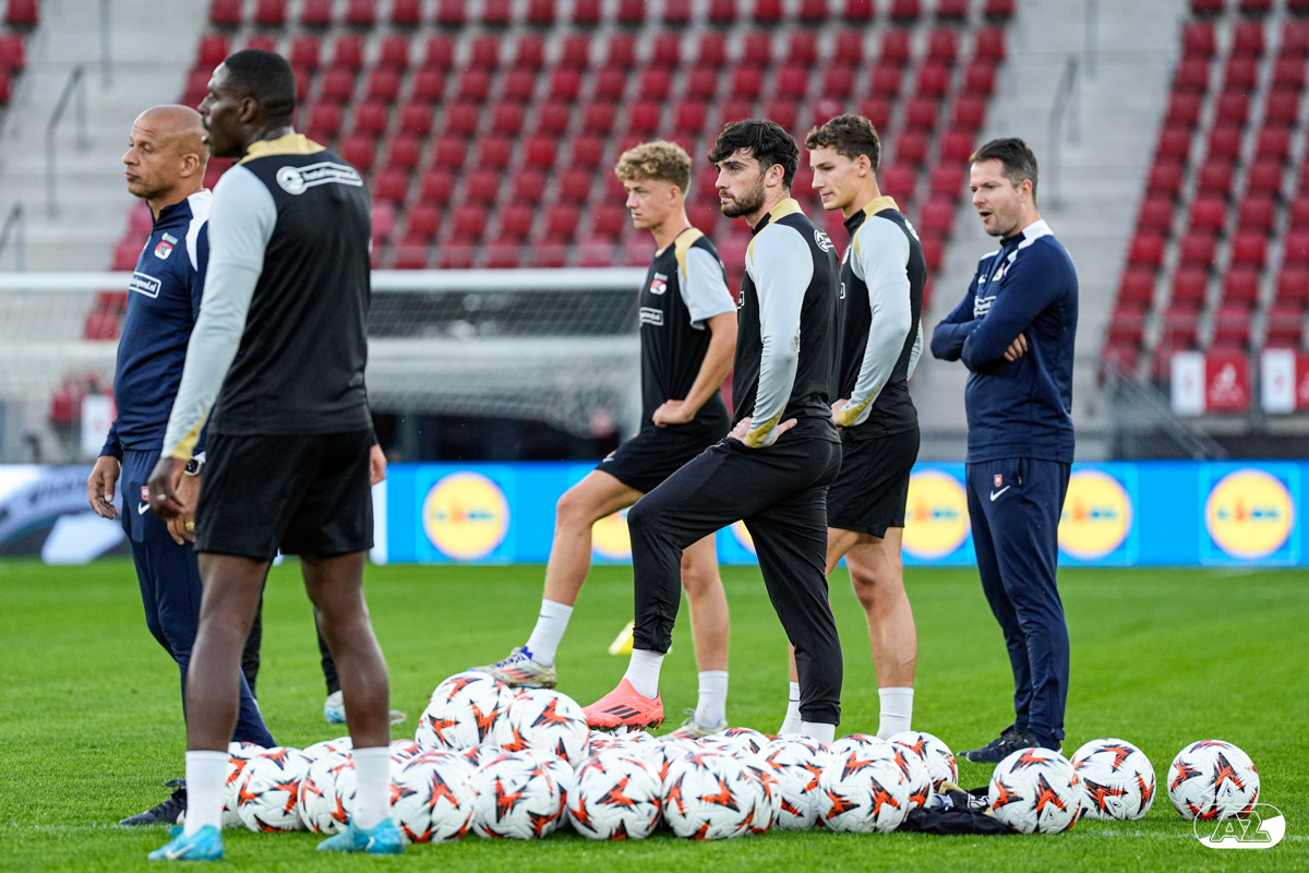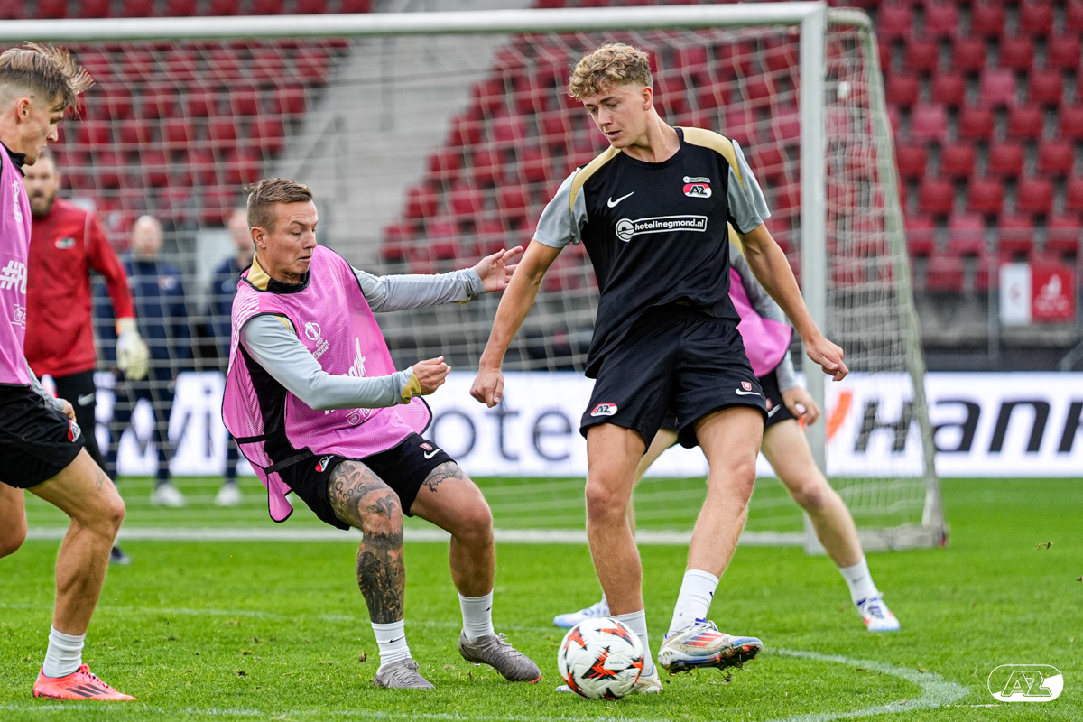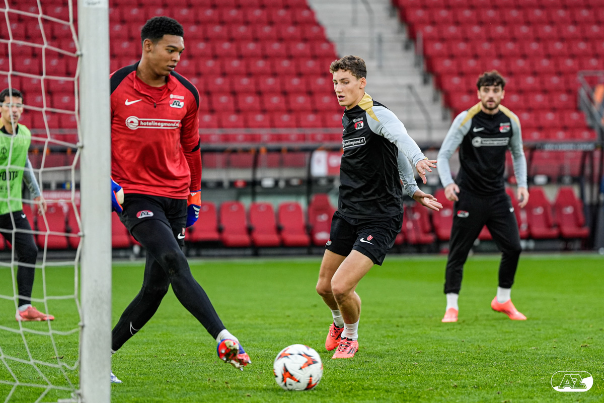 ALKMAAR- AZ staat woensdagavond in de UEFA Europa League tegenover het Zweedse IF Elfsborg. In het AFAS Stadion werkte de ploeg van trainer Maarten Martens dinsdagmiddag toe naar het honderdste Europese thuisduel. De training in beeld. (Foto's: Ed van de Pol)