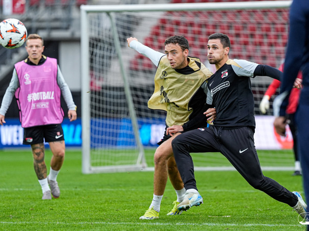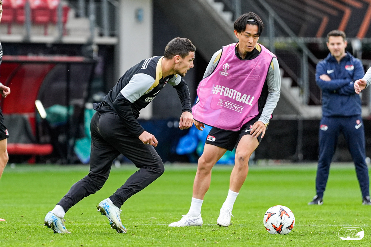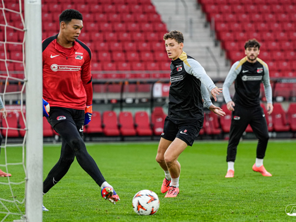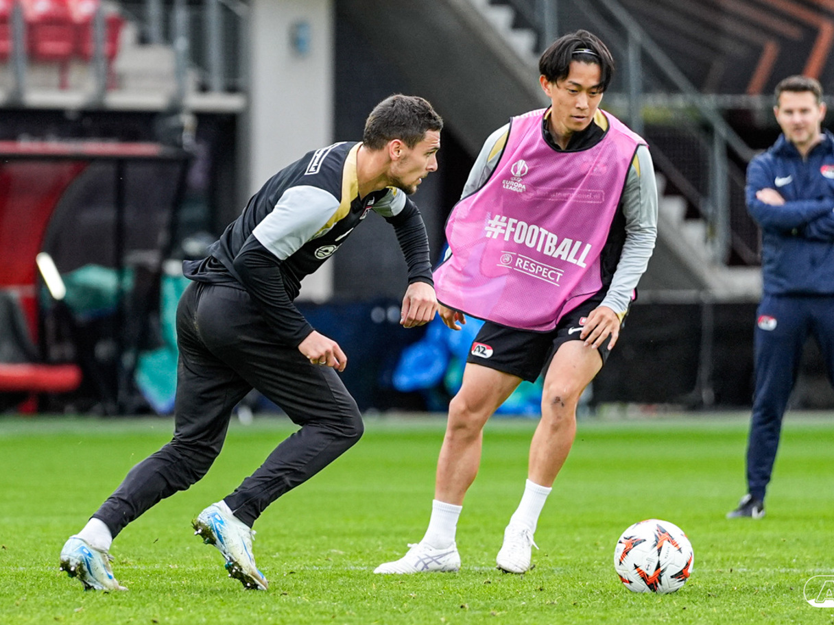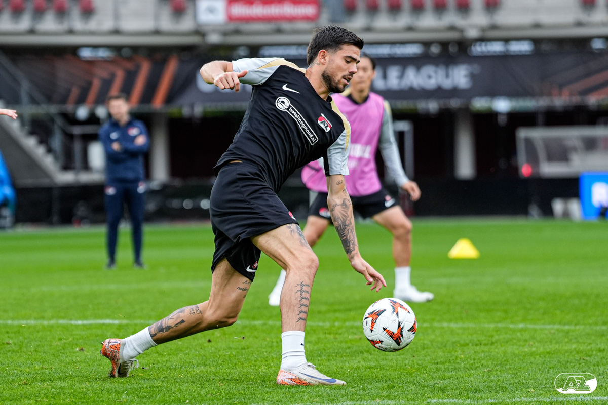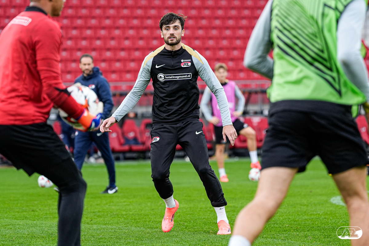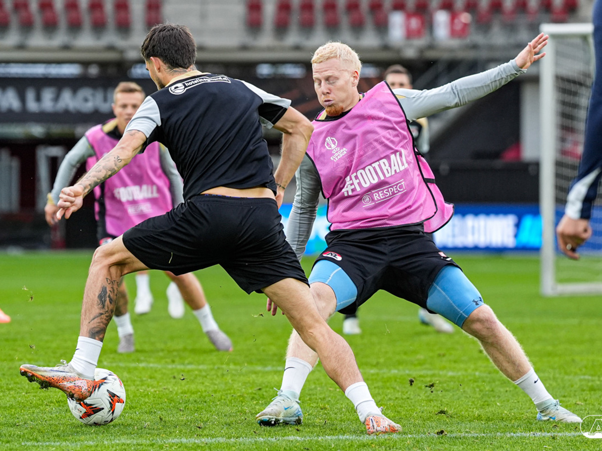 ALKMAAR- AZ staat woensdagavond in de UEFA Europa League tegenover het Zweedse IF Elfsborg. In het AFAS Stadion werkte de ploeg van trainer Maarten Martens dinsdagmiddag toe naar het honderdste Europese thuisduel. De training in beeld. (Foto's: Ed van de Pol)