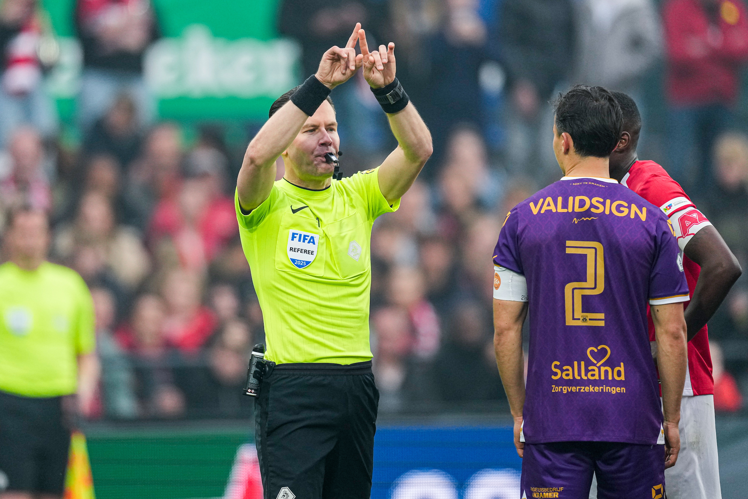 Poku gaat neer in de zestien na een hoog been van Kramer. Na overleg met de VAR wijst Makkelie naar de stip!