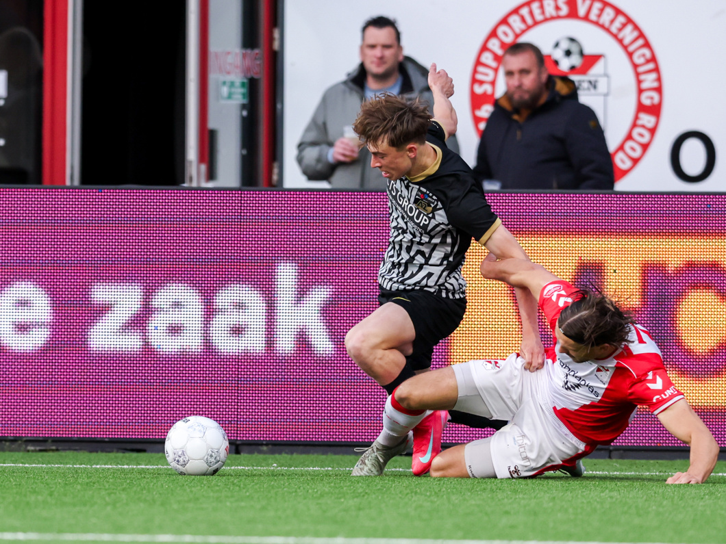 Linksback Robin Schouten neemt een voorzet direct op de schoen, maar Mathijs Menu blokt de inzet.