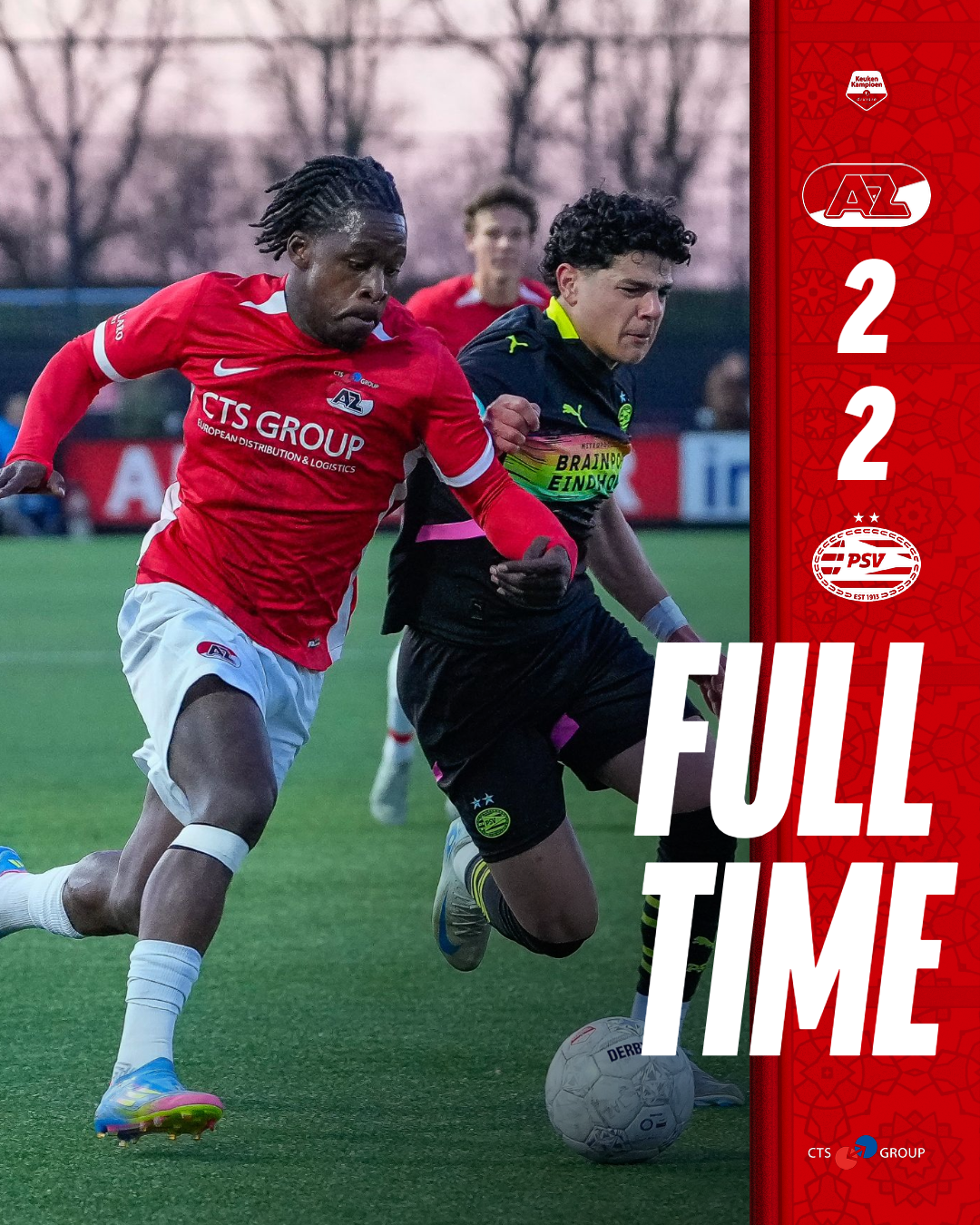 ZAANSTAD- Jong AZ kwam maandagavond niet verder dan een gelijkspel tegen Jong PSV. Op het AFAS Trainingscomplex kwamen de Alkmaarders aanvankelijk op achterstand, maar namen zij aan het begin van de tweede helft de leiding dankzij doelpunten van Elijah Dijkstra en Anthony Smits. Halverwege de tweede helft kwamen de Eindhovenaren echter weer op gelijke hoogte via een benutte strafschop, met een 2-2 gelijkspel als resultaat.