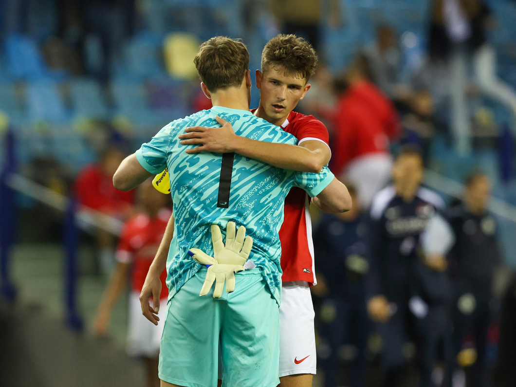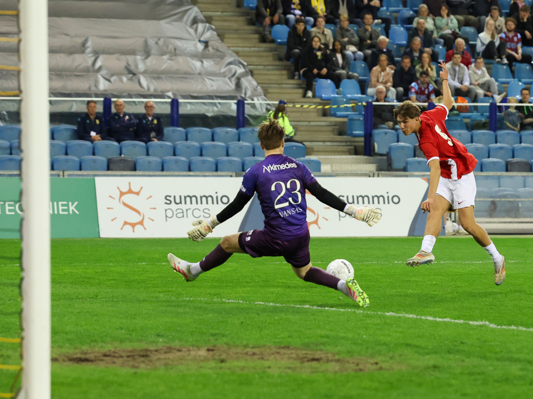 Jong AZ heel dichtbij de winnende goal, maar het schot van Engel raakt de paal.