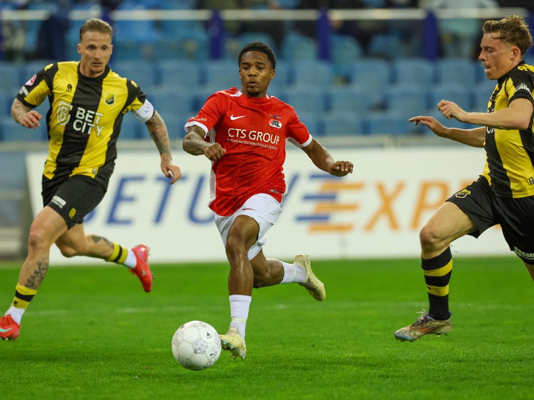 De linksback stoomt op langs de flank en mag ver komen, maar zijn doelpoging wordt geblokt door Vitesse-verdediger Van Zwam.