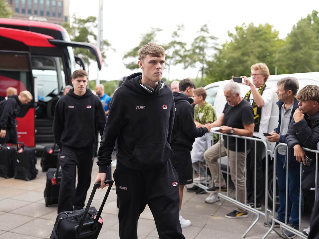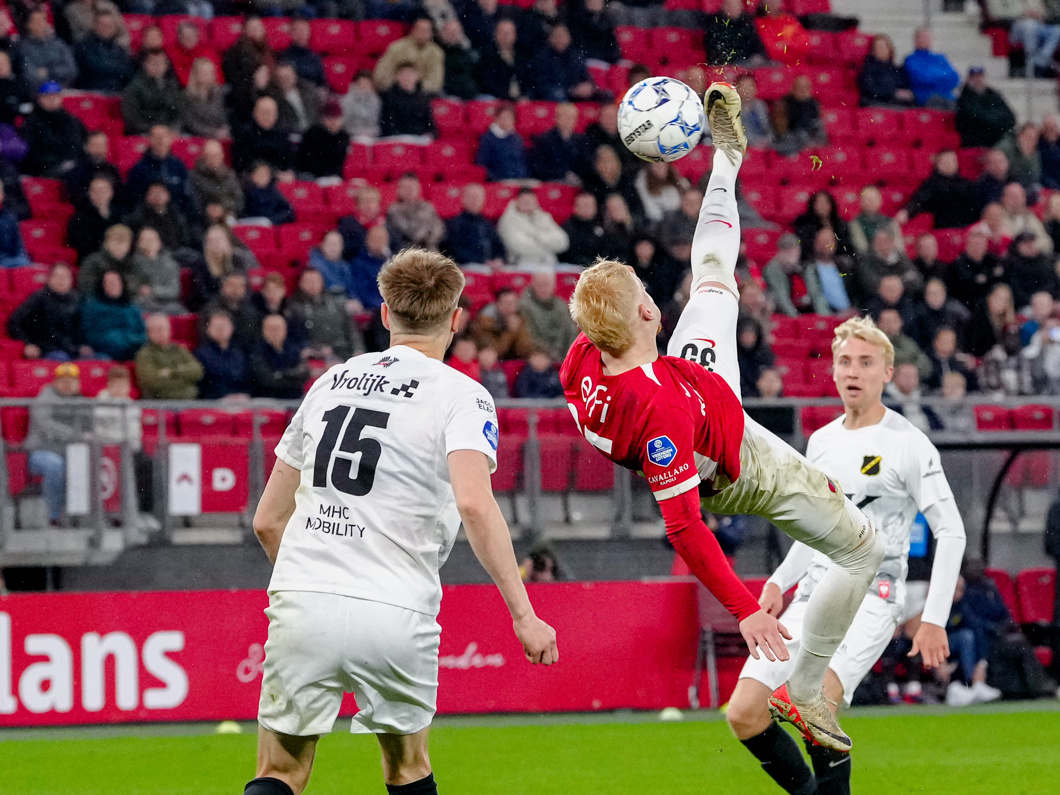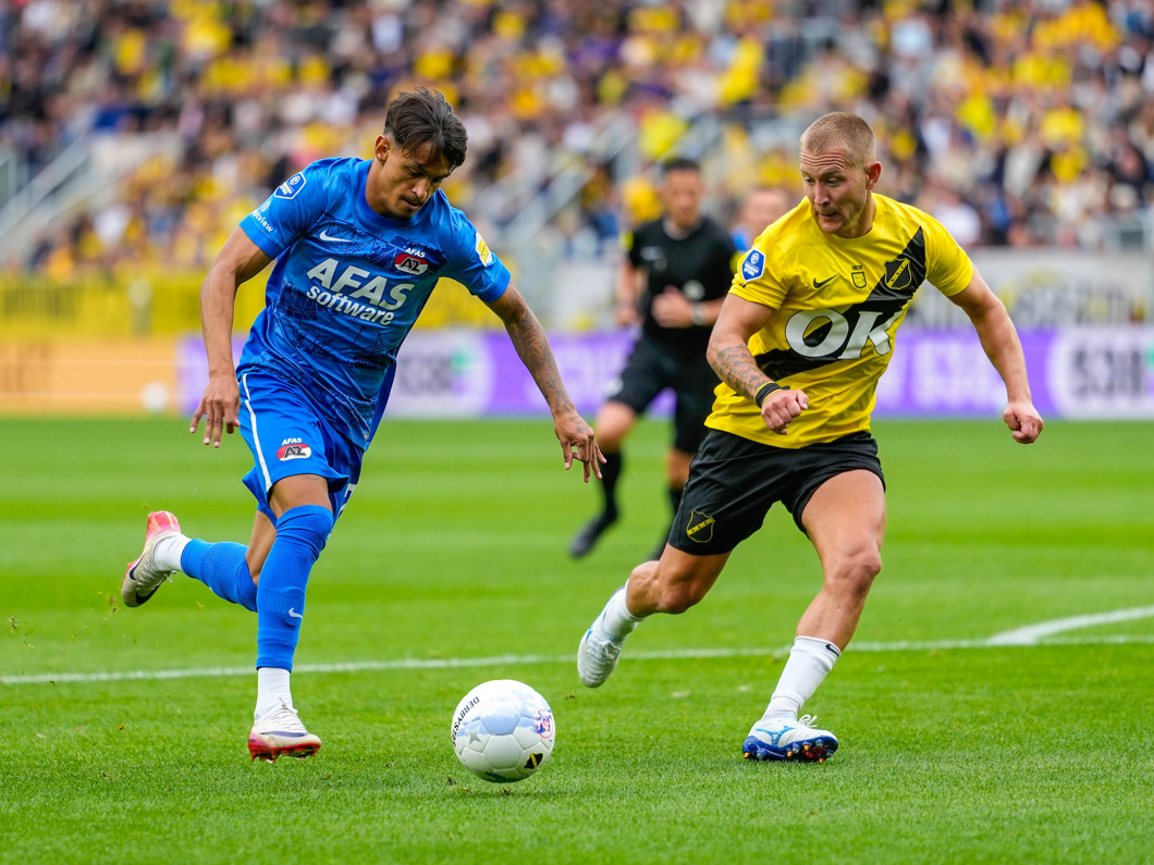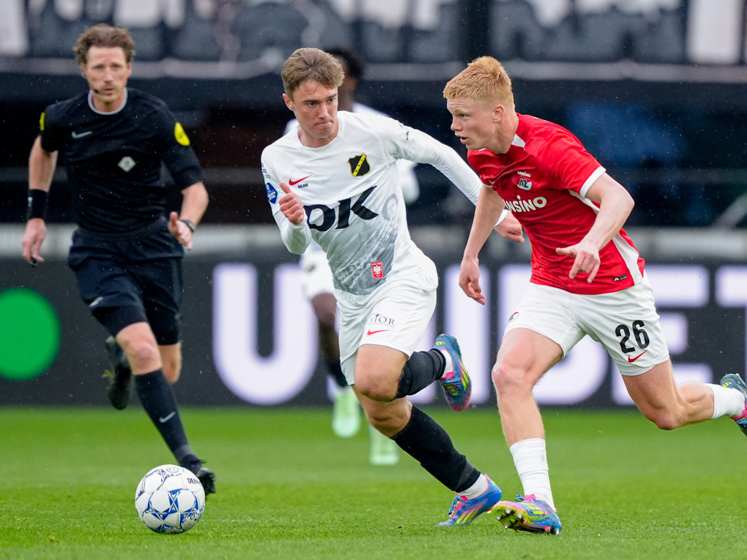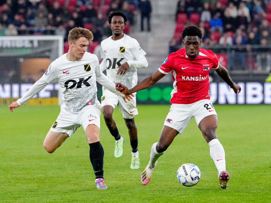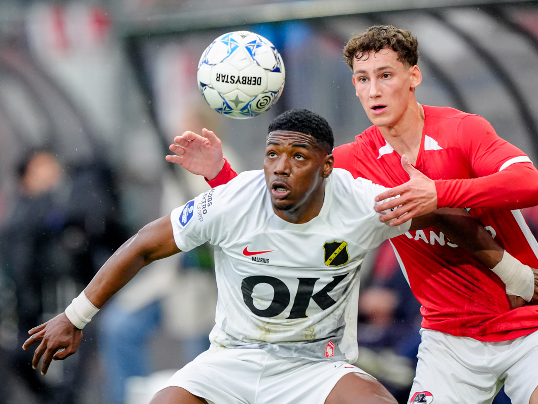Na een goede interceptie van Jordy Clasie wordt Mexx Meerdink bereikt. De Alkmaarse spits gaat voor de korte hoek, maar NAC-verdediger Leo Greiml zit ertussen.