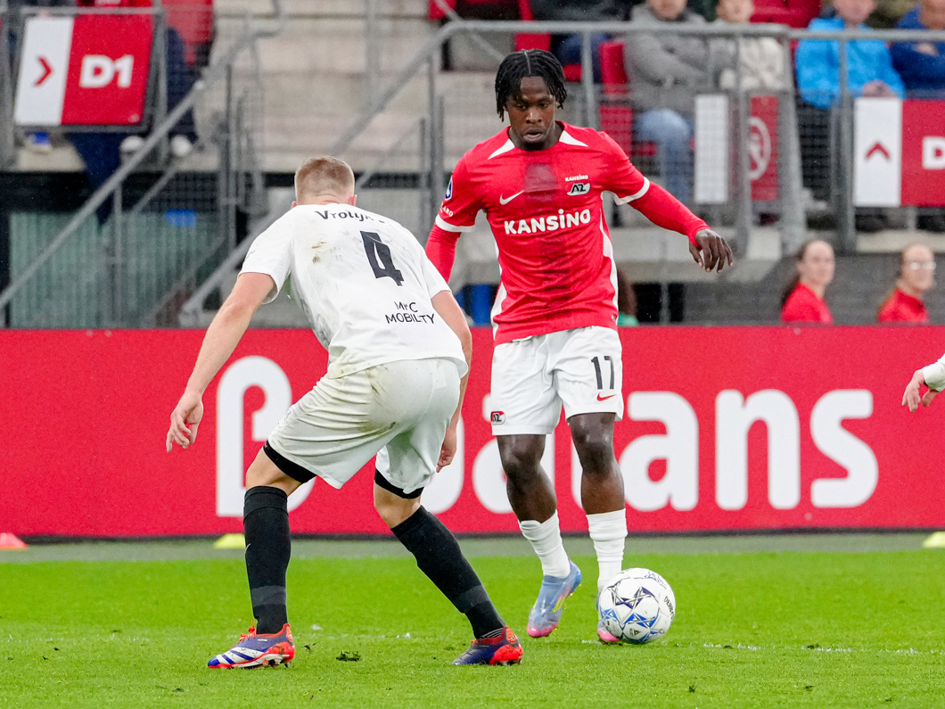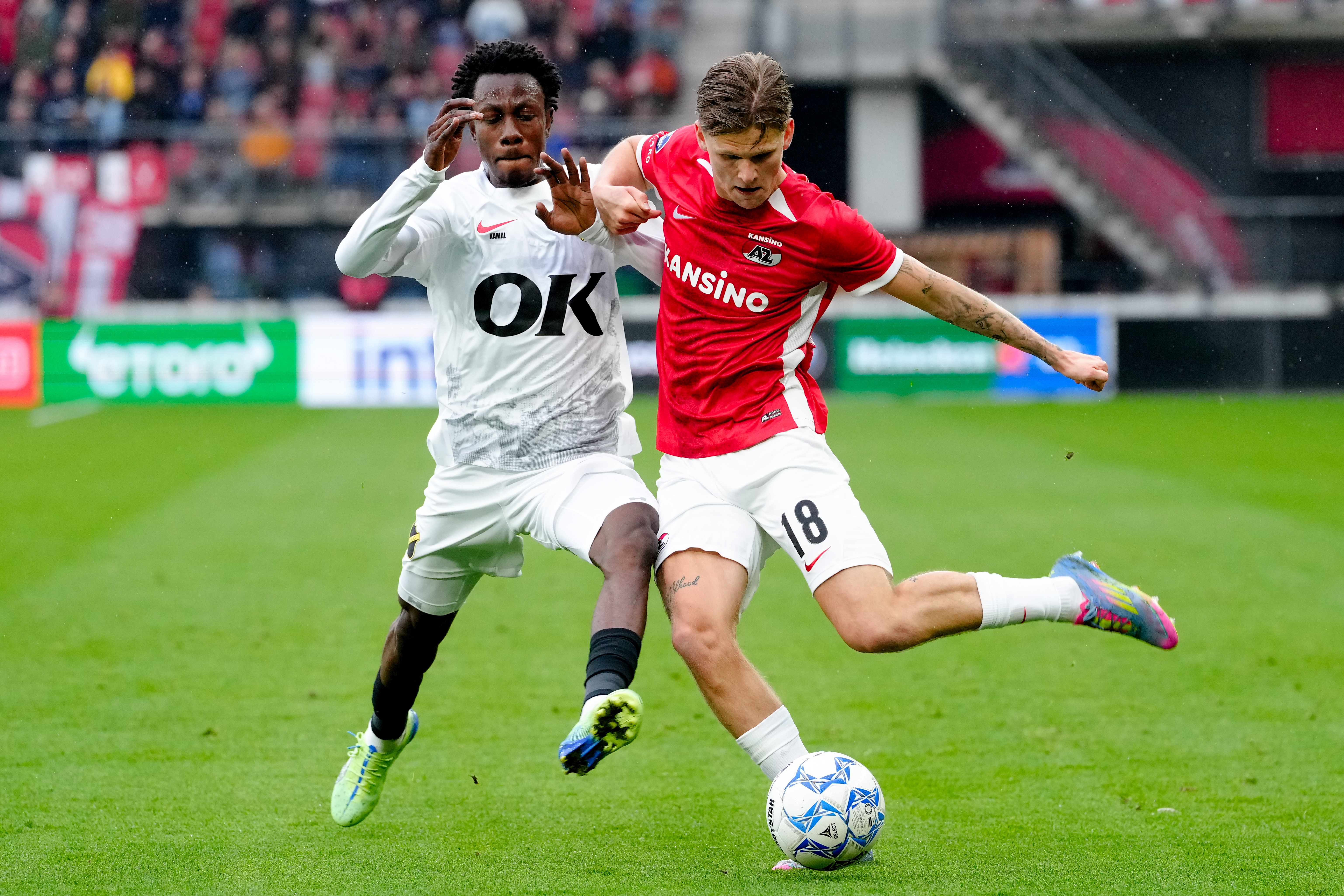 Het is druk in het strafschopgebied en via Kamal Sowah gaat de bal bijna in het Alkmaarse doel.
