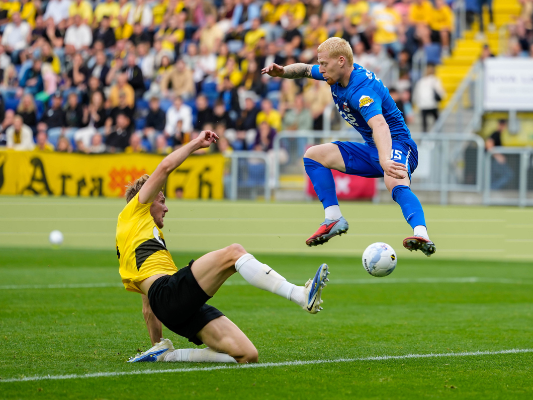 Mees de Wit zoekt de verre hoek met een goed schot, maar doelman Daniel Bielica maakt en knappe redding en voorkomt de 0-1.