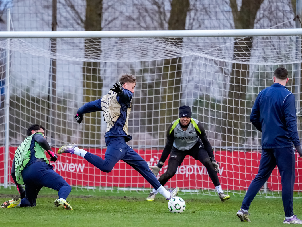 Mees de Wit haalt vanaf randje zestien uit op doel, maar zijn schot wordt geblokt.