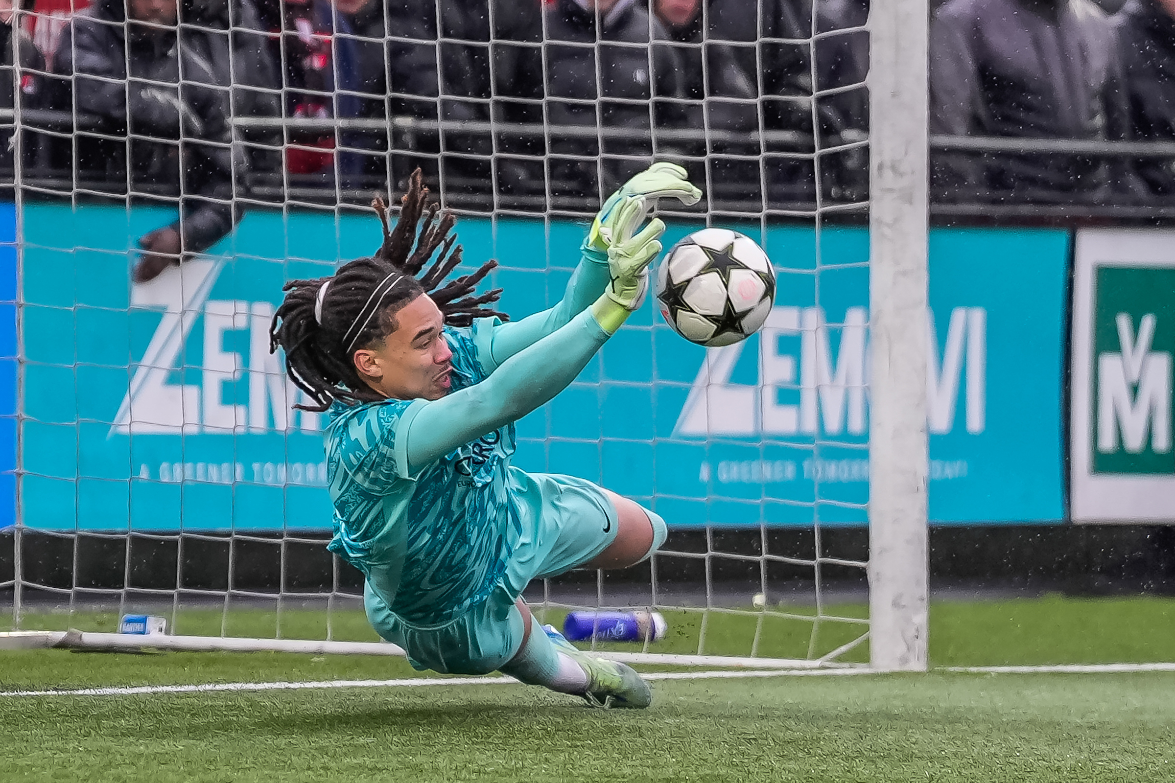 Doelman Kiyani Zeggen stopt de penalty.