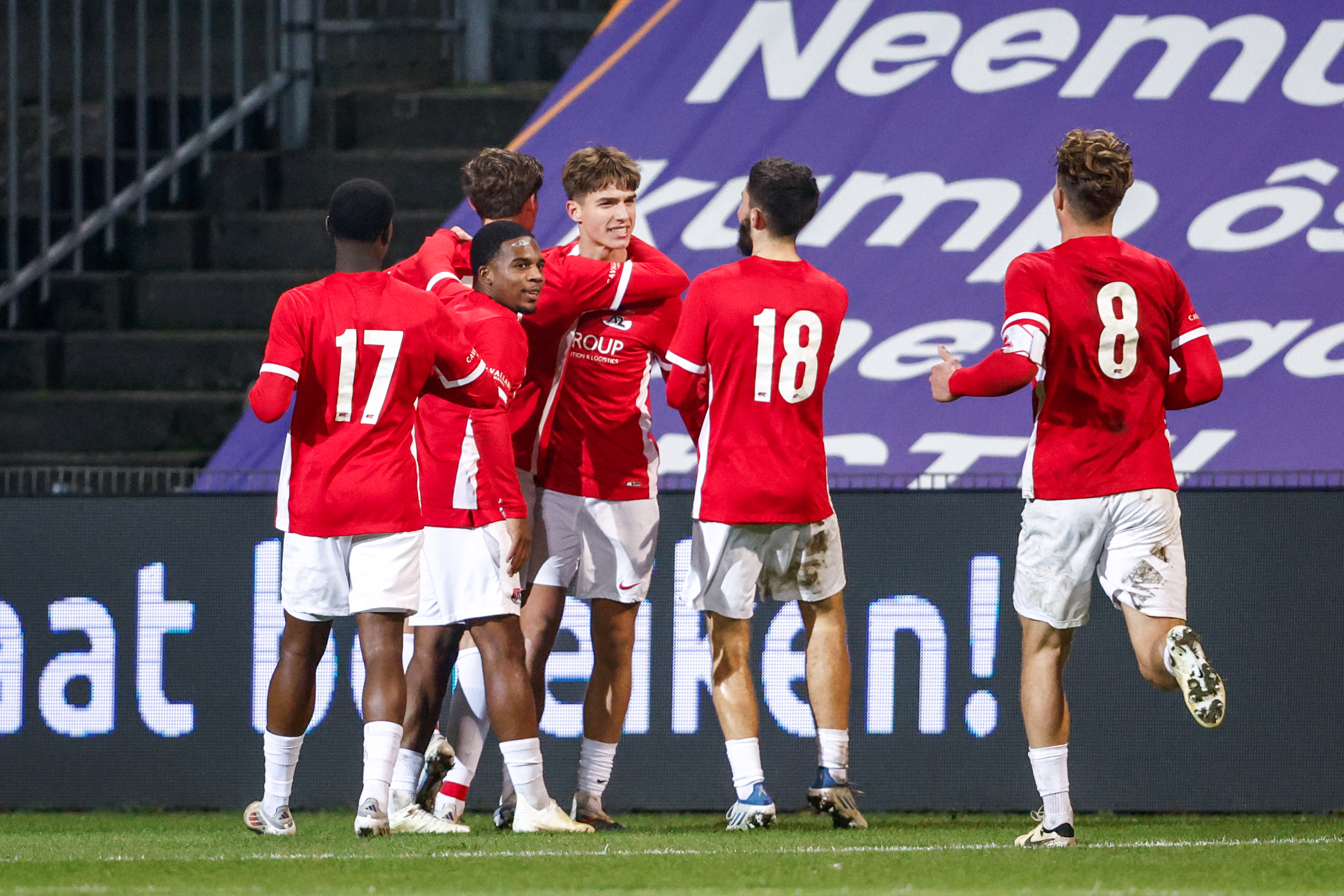Jong AZ viert de late openingstreffer van Rio Robbemond in Venlo.
