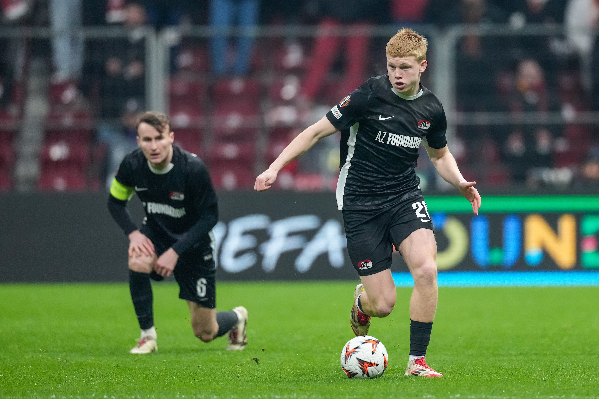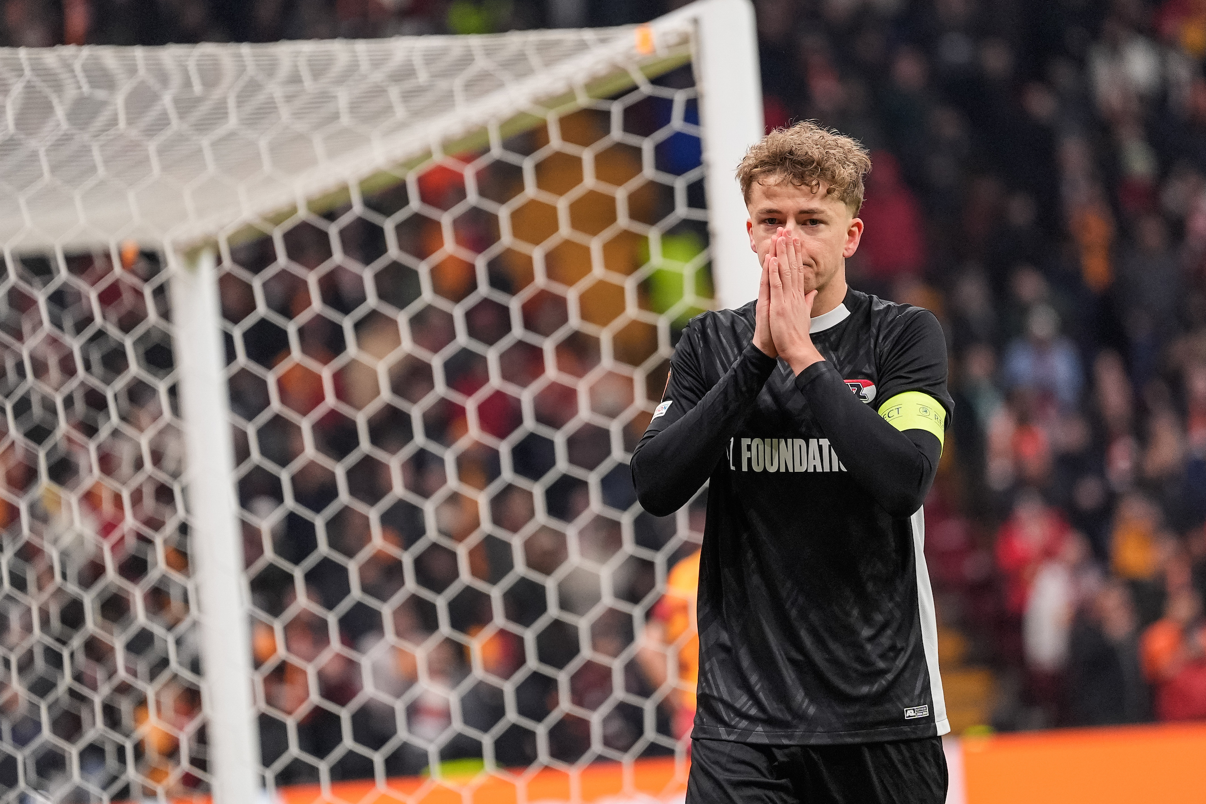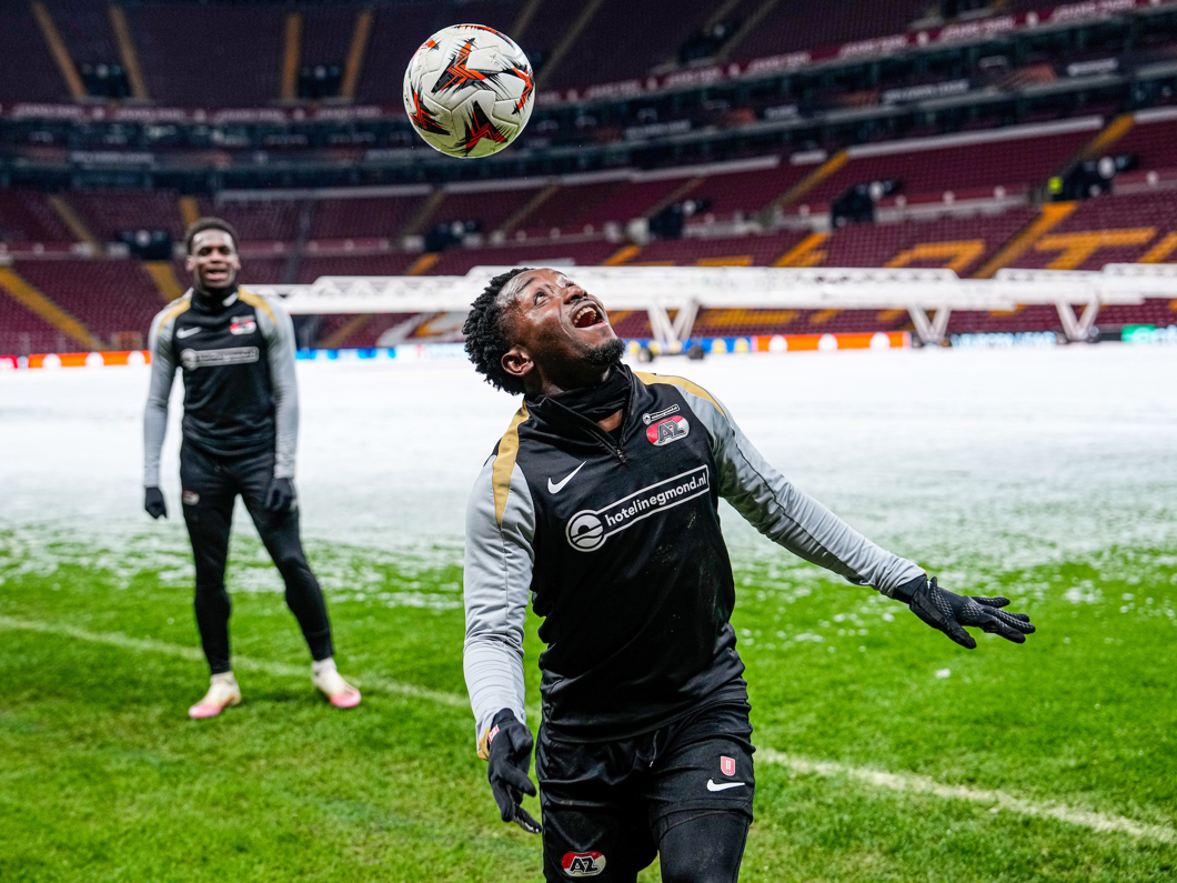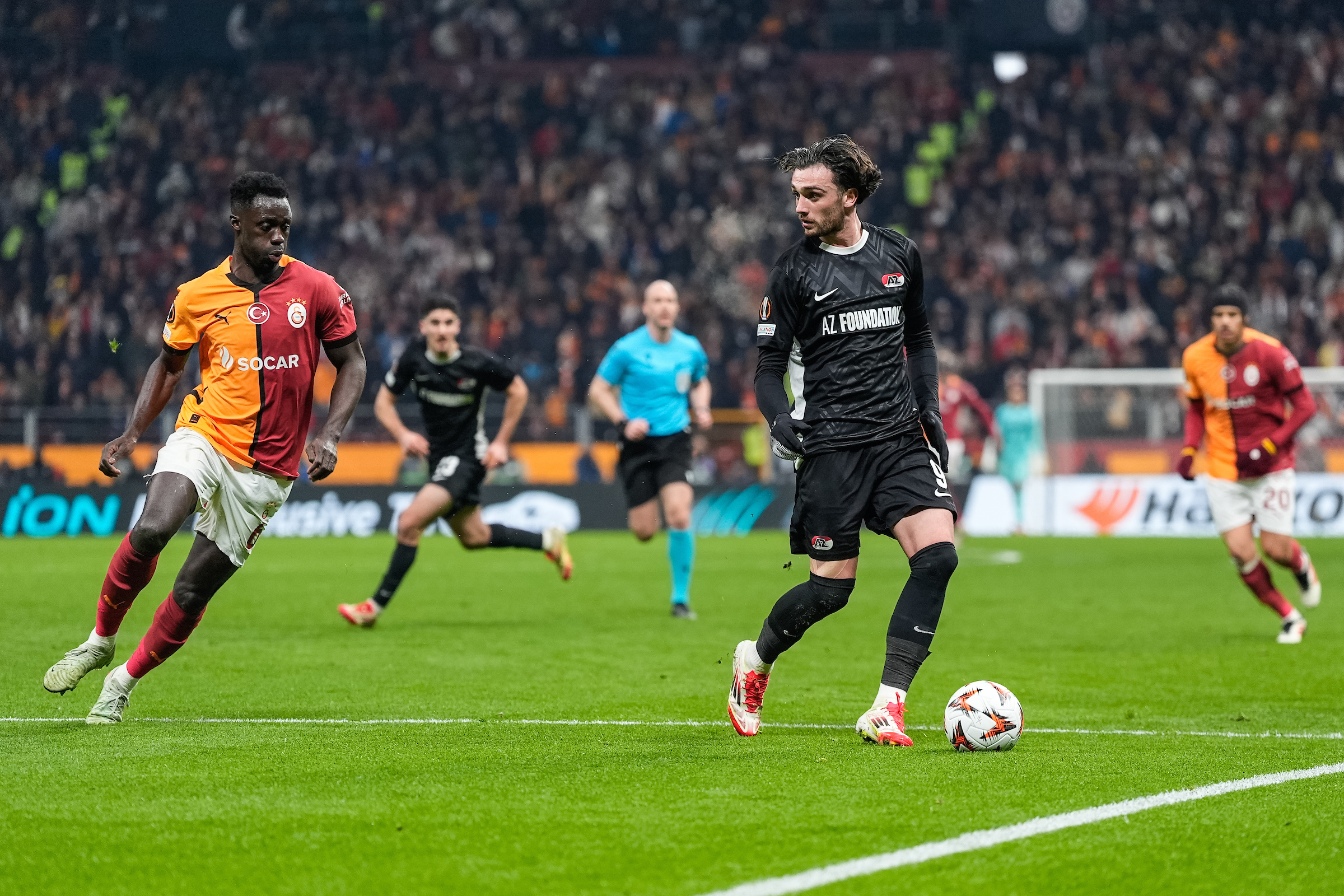 Sven Mijnans haalt uit op aangeven van Peer Koopmeiners, maar Galatasaray-doelman Günay Güvenç voorkomt een vroege Alkmaarse treffer.