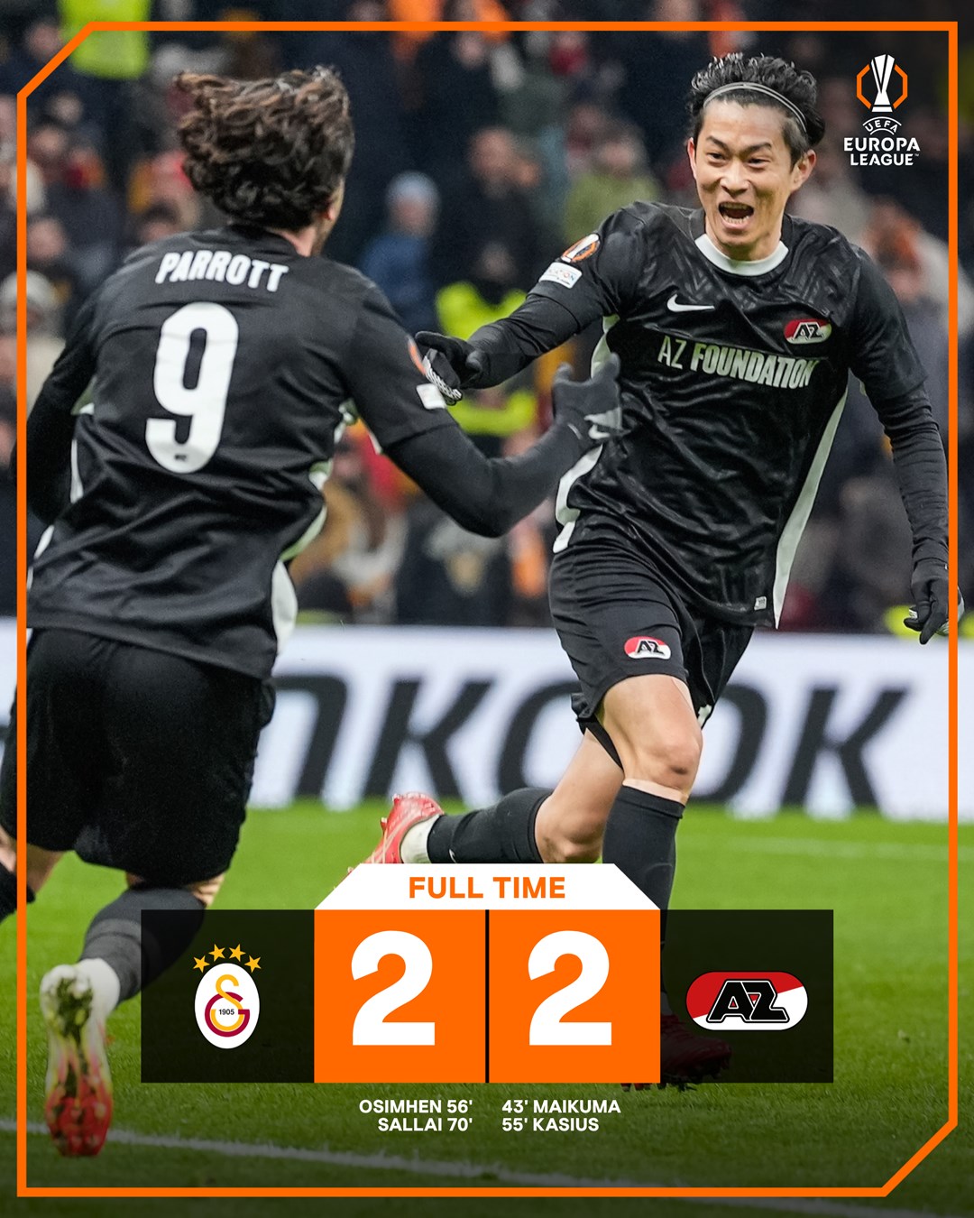 ISTANBOEL- AZ heeft zich geplaatst voor de achtste finales van de UEFA Europa League. De ploeg van Maarten Martens speelde donderdagavond met 2-2 gelijk tegen Galatasaray SK in een kolkend RAMS Park. Dankzij de 4-1 overwinning in Alkmaar was dat resultaat voldoende om door te stoten naar de volgende ronde. Seiya Maikuma en Denso Kasius waren trefzeker voor AZ, terwijl de thuisploeg via Victor Osimhen en Roland Sallai nog terugkwam in de wedstrijd.