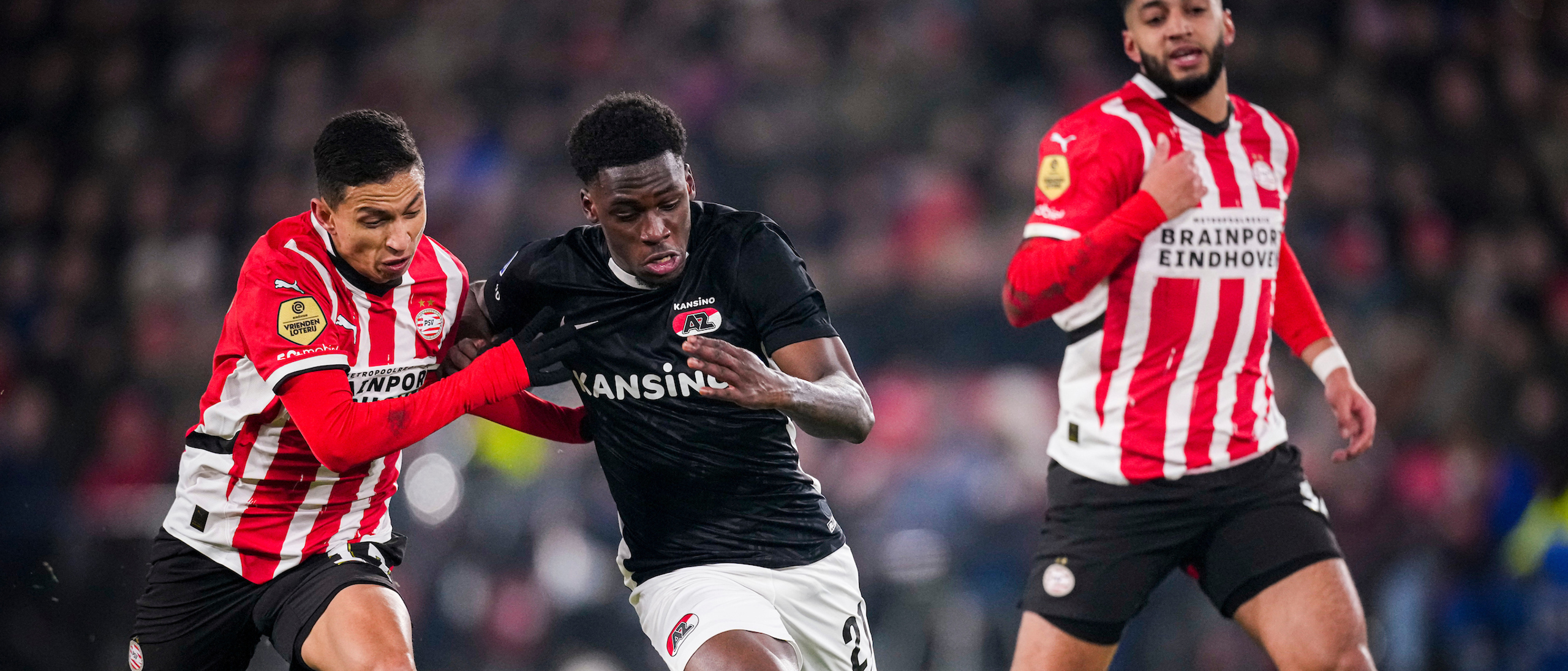 AZ kreeg enkele grote kansen om de score te openen. Troy Parrott was dicht bij een treffer toen hij een voorzet van David Møller Wolfe op doel kopte, maar PSV-doelman Walter Benítez wist met een knappe redding een achterstand te voorkomen. In de rebound schoot Parrott net naast. Niet veel later kreeg de Ierse spits opnieuw een mogelijkheid, maar zijn schot miste kracht en werd op tijd van de lijn gehaald door PSV-verdediger Richard Ledezma.