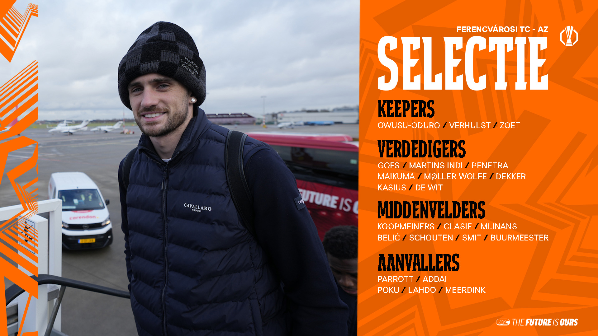 AZ reist met 23 spelers naar de Hongaarse hoofdstad af voor het duel met Ferencvárosi TC. Ruben van Bommel en Ibrahim Sadiq zijn nog niet fit en blijven achter op het AFAS Trainingscomplex. Maarten Martens heeft verder iedereen tot zijn beschikking.