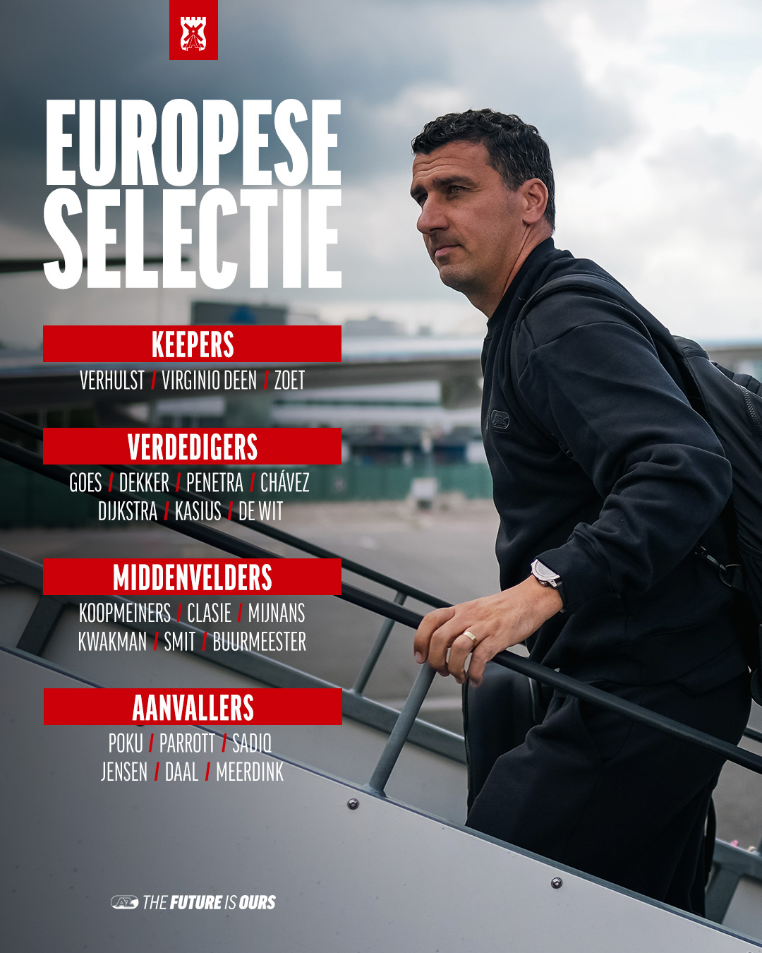Maarten Martens heeft 22 spelers meegenomen voor de eerste wedstrijd van de tweede kwalificatieronde voor de UEFA Conference League. Een aantal spelers is in Nederland achtergebleven met pijntjes en lichte klachten, waaronder Seiya Maikuma, David Møller Wolfe en Lequincio Zeefuik.