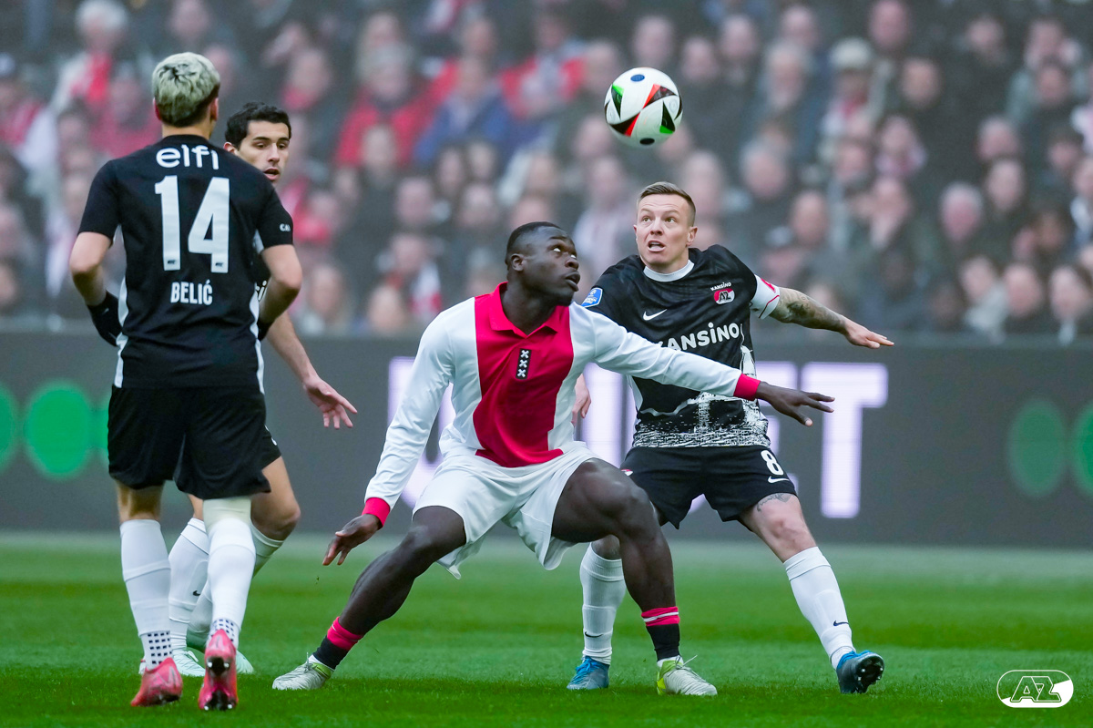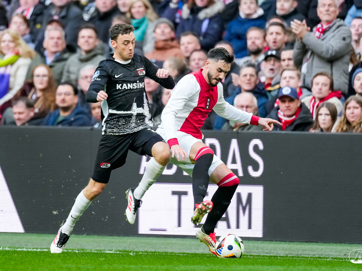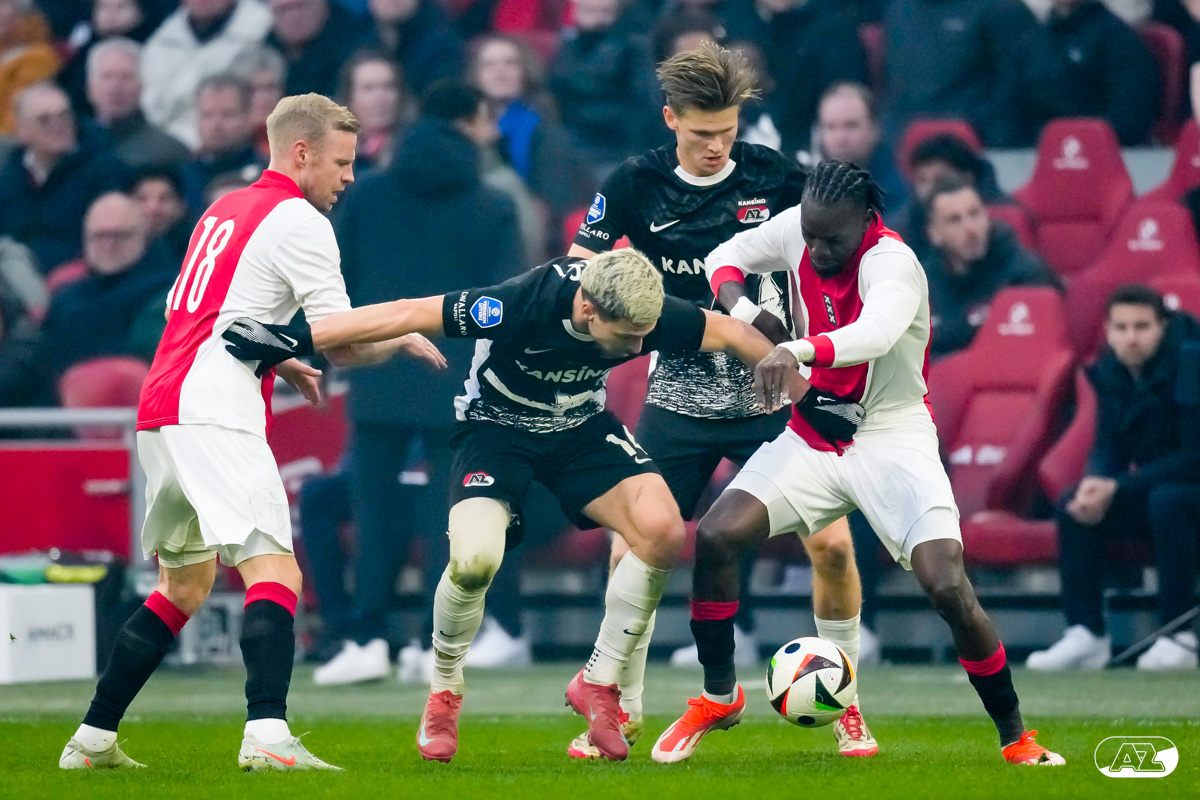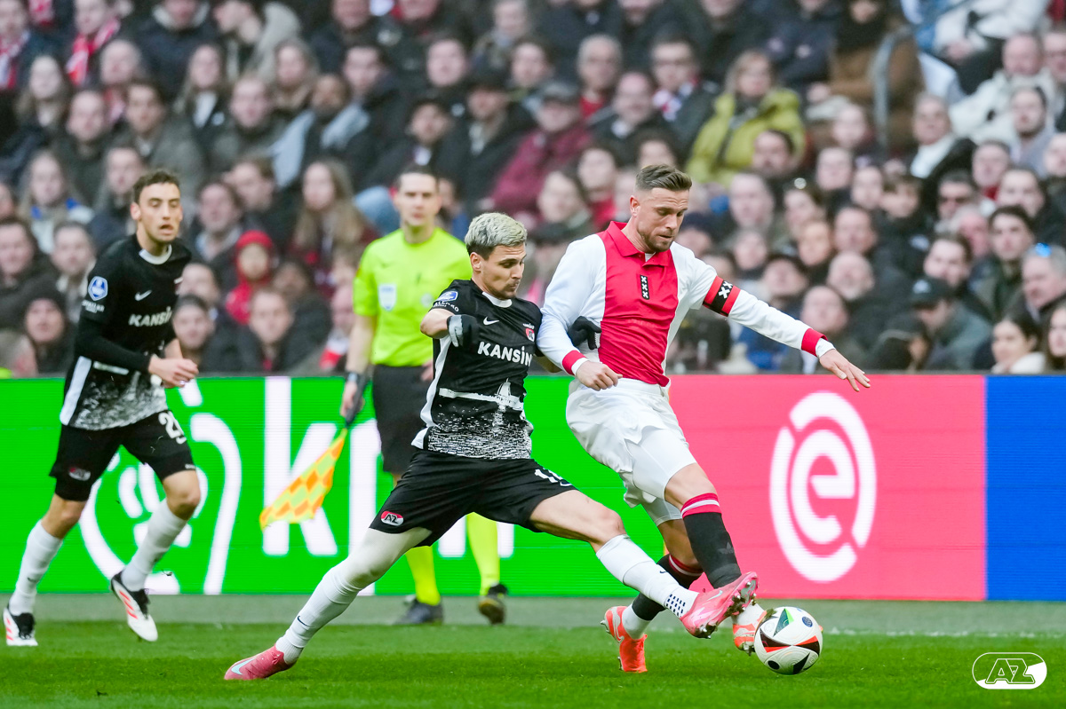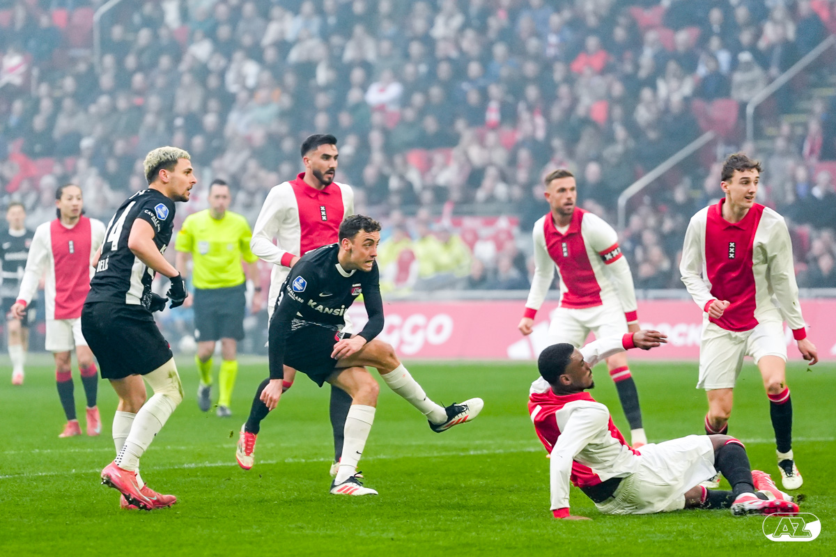 AMSTERDAM- AZ heeft zondagmiddag een gelijkspel behaald tegen koploper Ajax. In een intense tweede helft namen de Alkmaarders tweemaal de leiding, maar slaagden er met tien tegen tien niet in om de volle winst binnen te halen: 2-2. Bekijk hier de wedstrijd in beeld (foto's van Ed van de Pol).