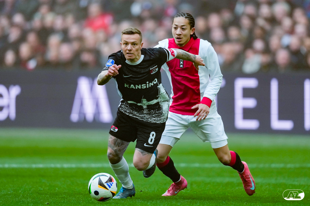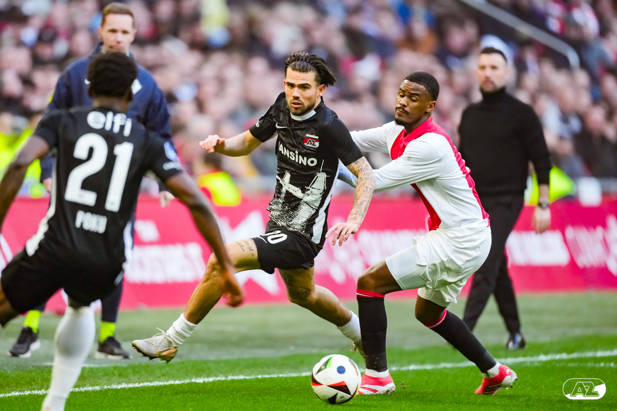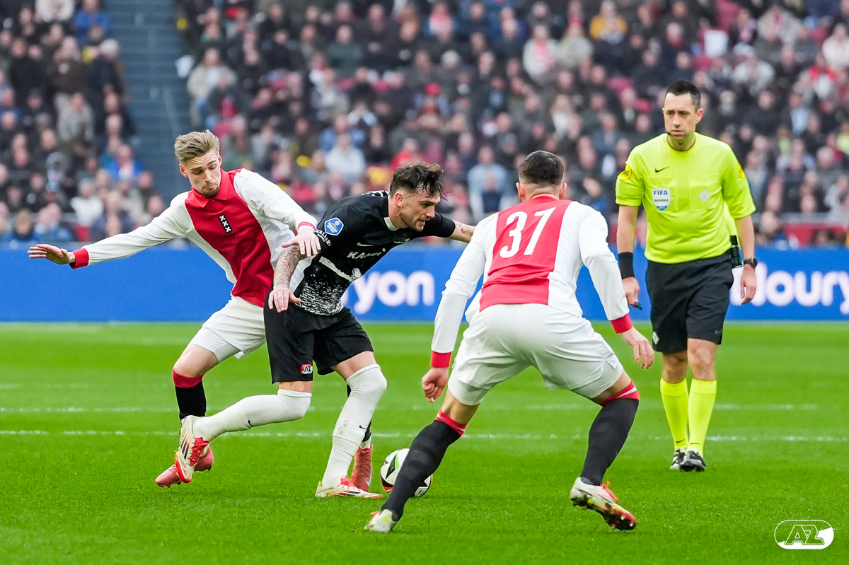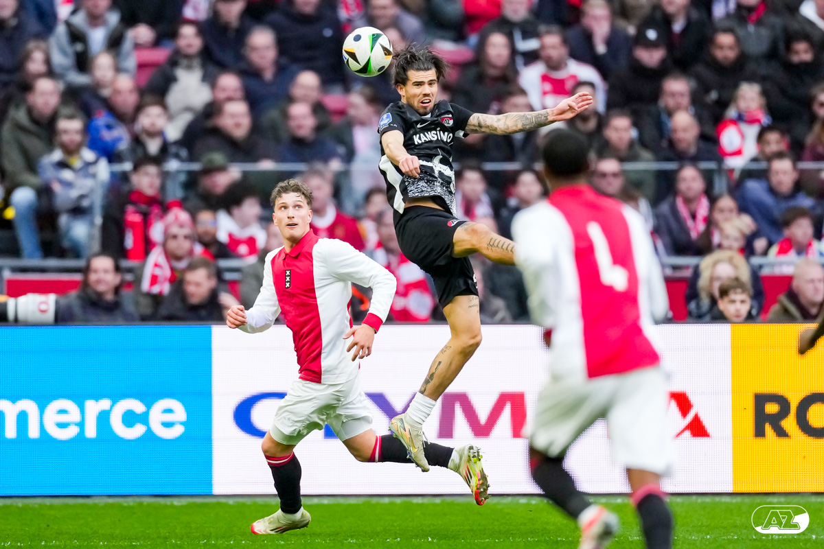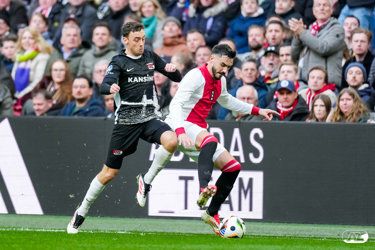 AMSTERDAM- AZ heeft zondagmiddag een gelijkspel behaald tegen koploper Ajax. In een intense tweede helft namen de Alkmaarders tweemaal de leiding, maar slaagden er met tien tegen tien niet in om de volle winst binnen te halen: 2-2. Bekijk hier de wedstrijd in beeld (foto's van Ed van de Pol).
